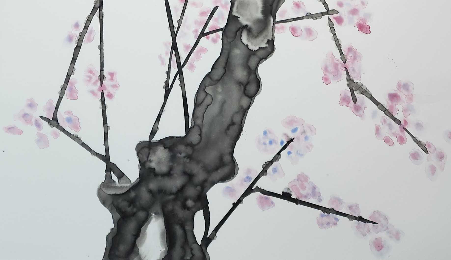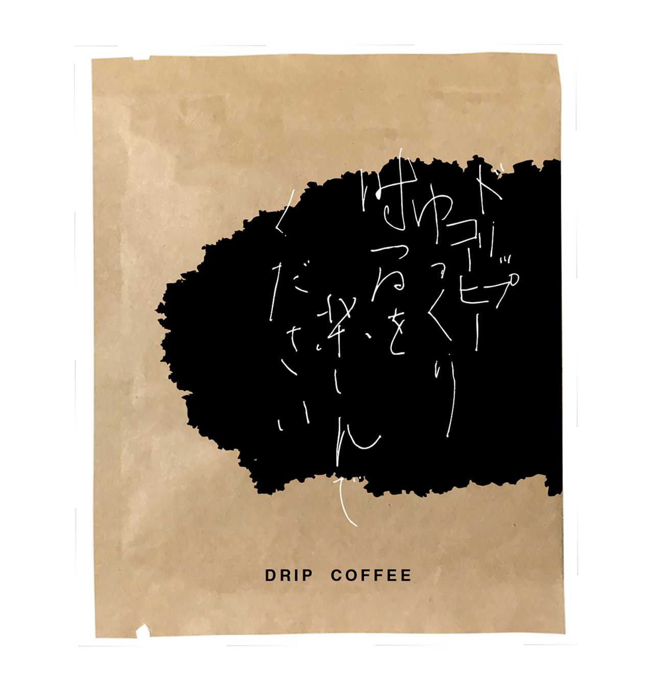 一滴一滴丁寧に淹れるコーヒーをイメージしながら、たっぷりと墨を含んだ筆で「一」の文字を書いた。その中から、一滴一滴のしずくやコーヒーの香りが広がるイメージと重なるものを選び、作品に展開していった。