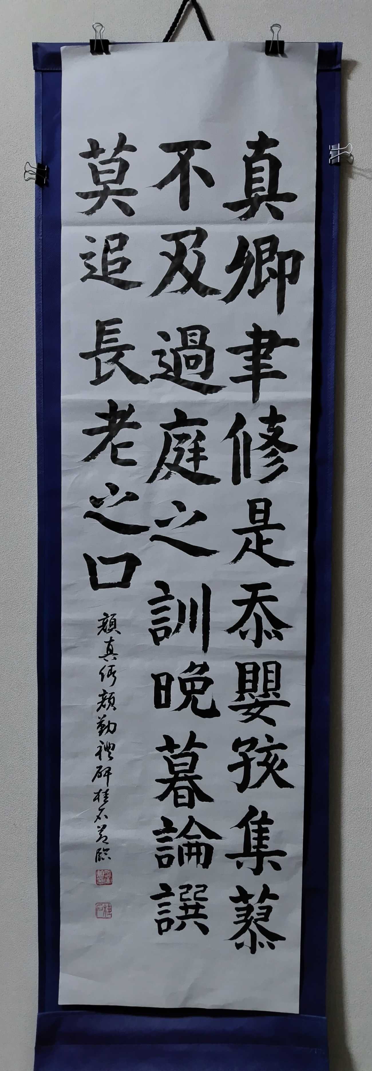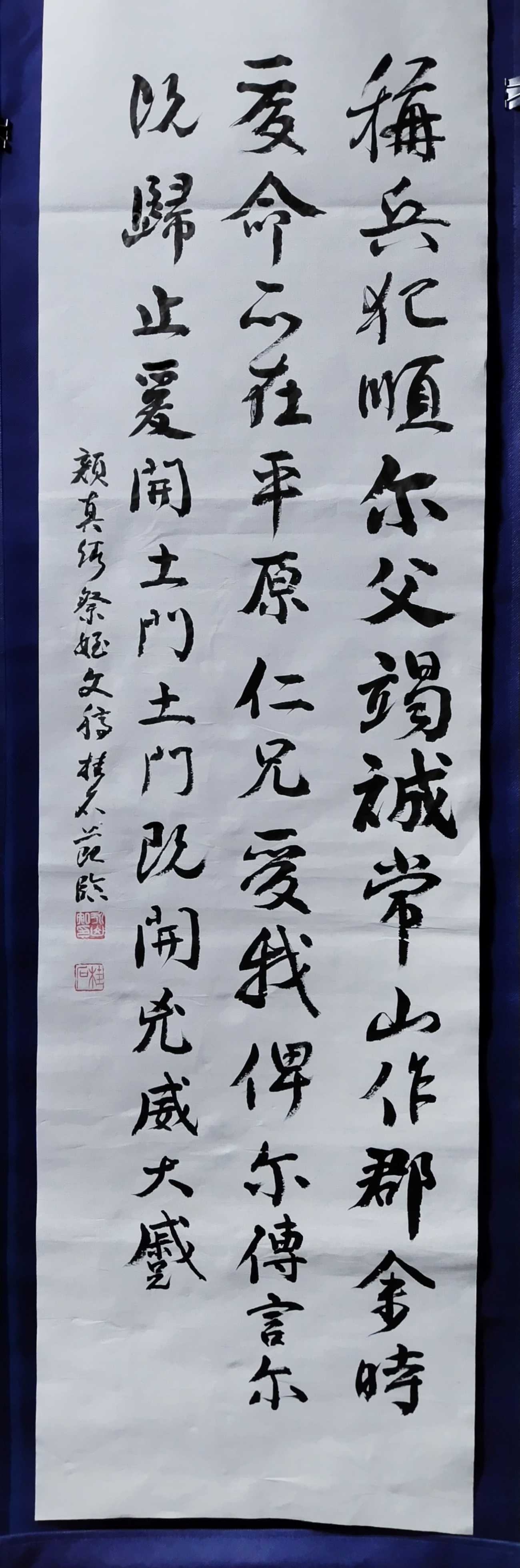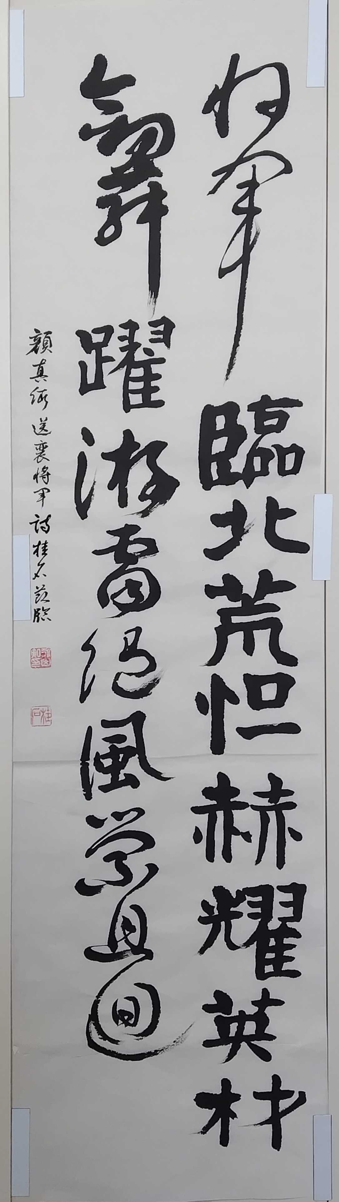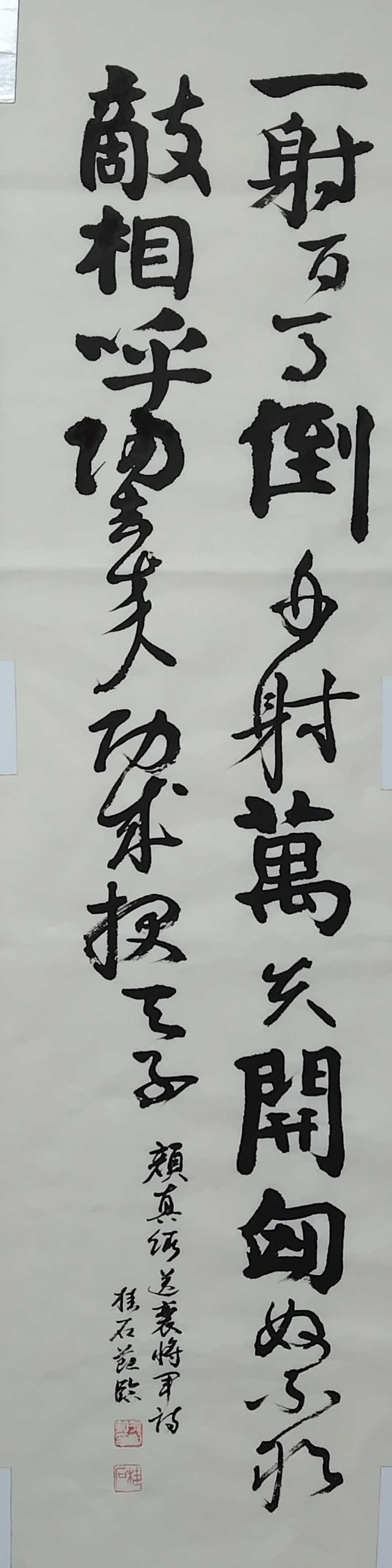 李白の「山中與幽人對酌」は誰もが知っている七言古詩である。酒好きであった李白が、酔うて、動作が緩慢になり、酔顔で、眠そうに手を振って、横臥しになりかけている様な姿が見える様である。この詩を顔真卿の倣書としてみたいと思い立った。当初前半、後半に分けて半折二行の組作品制作を試みた。中間評価の結果、前半二行の二行目が一行目と文末が揃わず、良くないとの指摘を受けた。理由は二行目が「一杯壱杯復一杯」と画数の少ない字が続くためである。従って最終提出では組作品をから半折三行書きに変更した次第である。