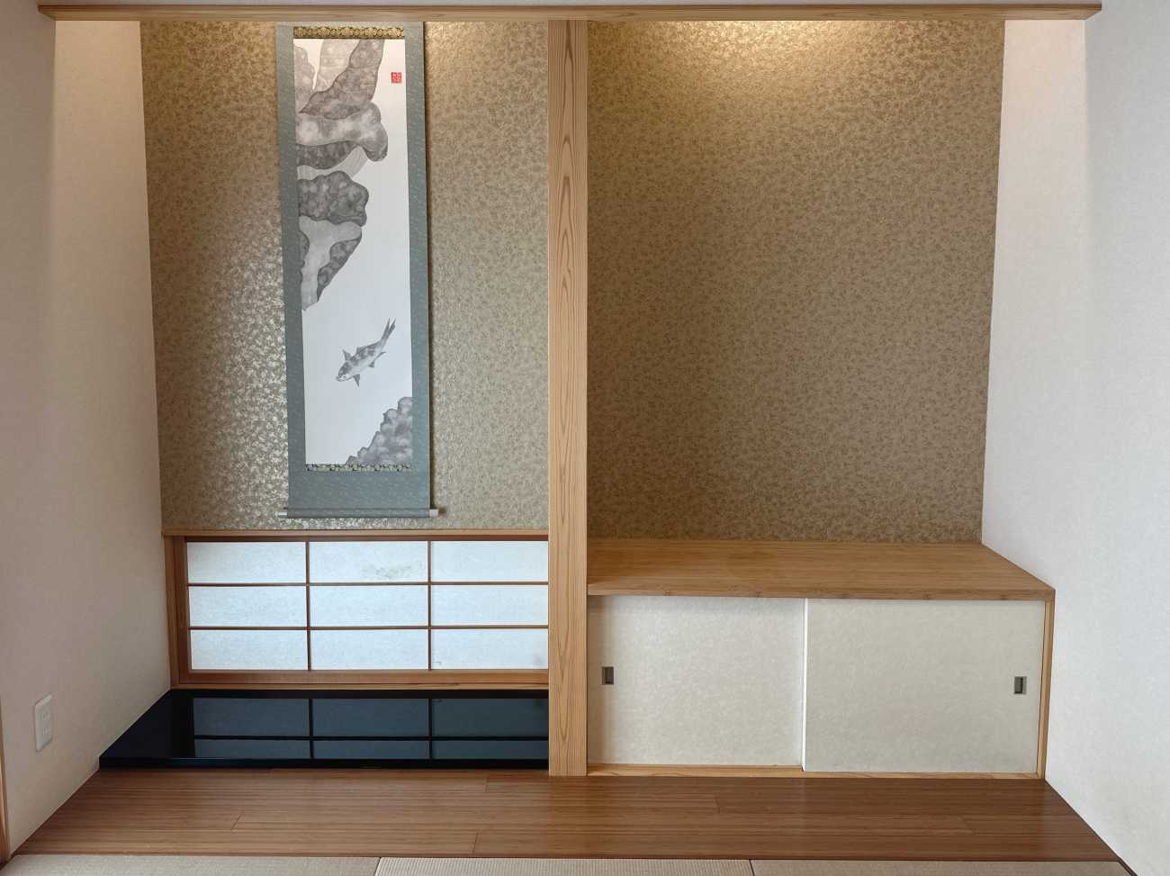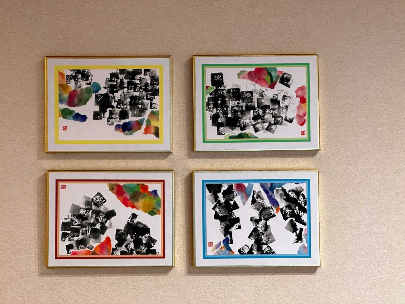 墨は濃淡潤渇を自在に操ることで、見る人に色彩を感じさせ、温度や質感までも表現することができる。「柔和」では3月頃の少し暖かくなってきた穏やかな蓮池の様子を、余白を活かし現代表現で大胆に描いた。まだ浮き葉が出始めた頃の蓮の葉の柔らかさや、日の当たる暖かい場所で鯉がじっと佇んでいる様子が伝わるように、柔らかい墨使いを重視した。「豊」では色を取り入れ華やかに日本の豊漁・豊作を表現した。墨と顔彩が一番綺麗に表現できる和紙をそれぞれ別に使用し、顔彩で色紙を作成。墨と色の調和を意識しながらコラージュした。