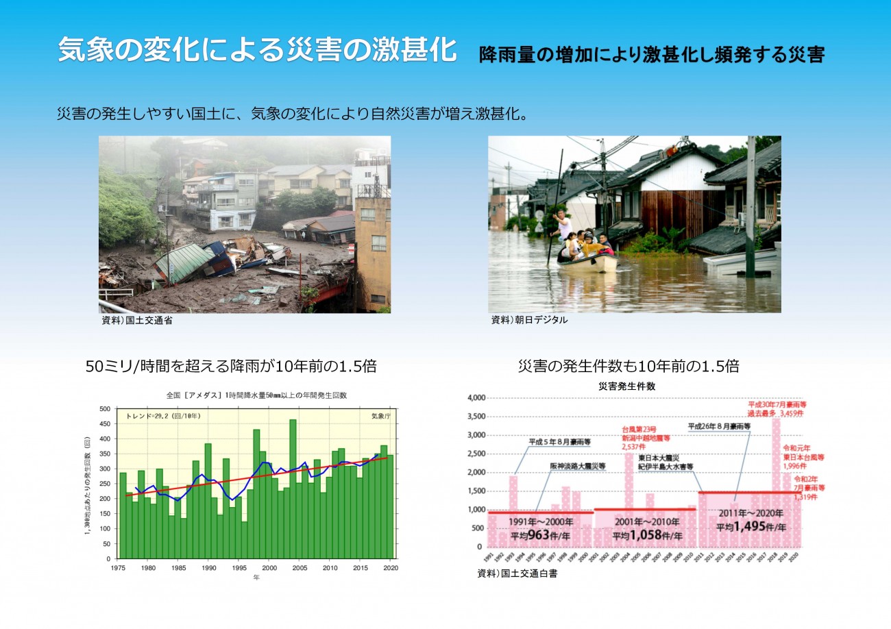 地球規模の気象変化により頻発し激甚化する自然災害、我が国では永らくCO2を大量に排出するコンクリートに頼った防災対策が行われてきた。