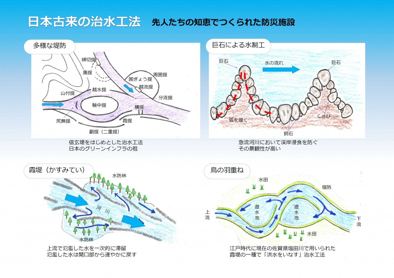 コストや利便性を追求した故に忘れ去られた日本古来の治水工法、自然と共に生き災害を受容し洪水を生活の一部と捉えた考え方、洪水で運ばれる肥沃な土壌を良田として活用するなど、「洪水をいなす」考えは非常に高いポテンシャルを秘めている。