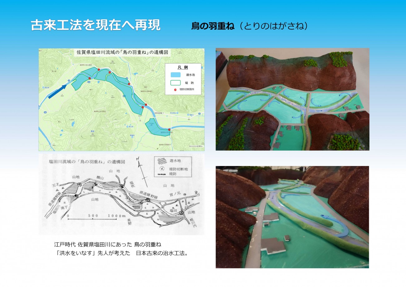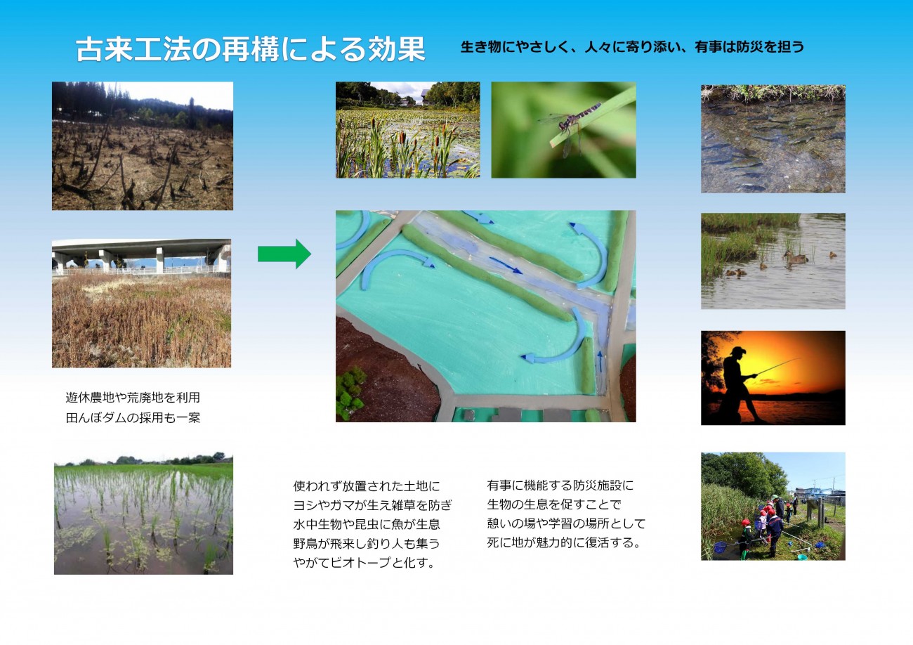 土や石などの自然素材を使い災害と共存し生きる考え方は、現在においては遊休農地や荒廃地を再活用し、洪水時にては新たに創られた氾濫域により遊水効果を発揮する。