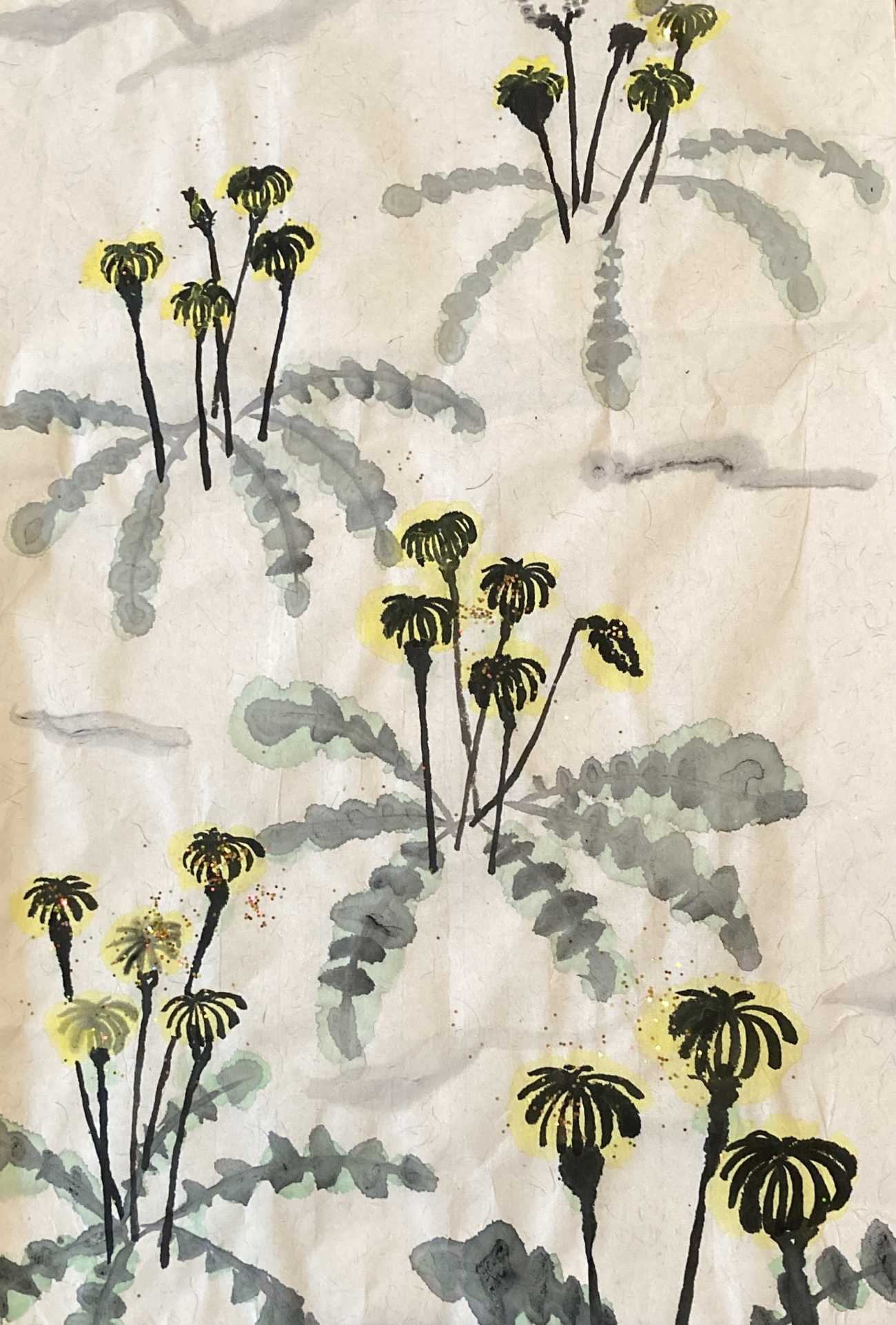 自然の中で生きる、タンポポと蝶を描きました。作品のポイントは、小さいながらも懸命に生きるタンポポと蝶の姿です。タンポポの花言葉は「幸せ」です。作品を観た人に幸せな気持ちになっていただけたら、という気持ちを込めて描きました。