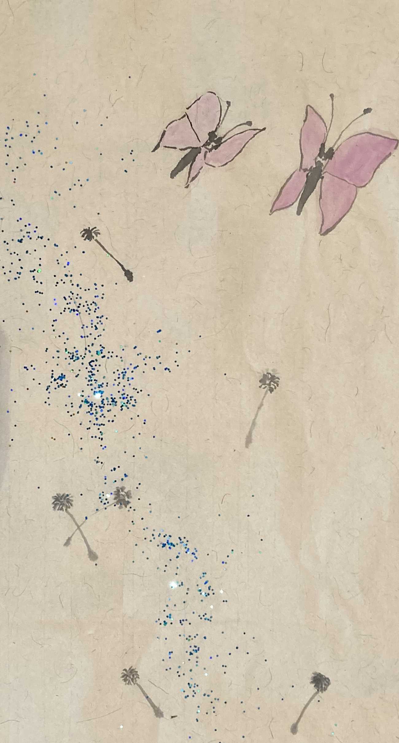 作品には、水彩絵具と色付きのラメで色を加えました。