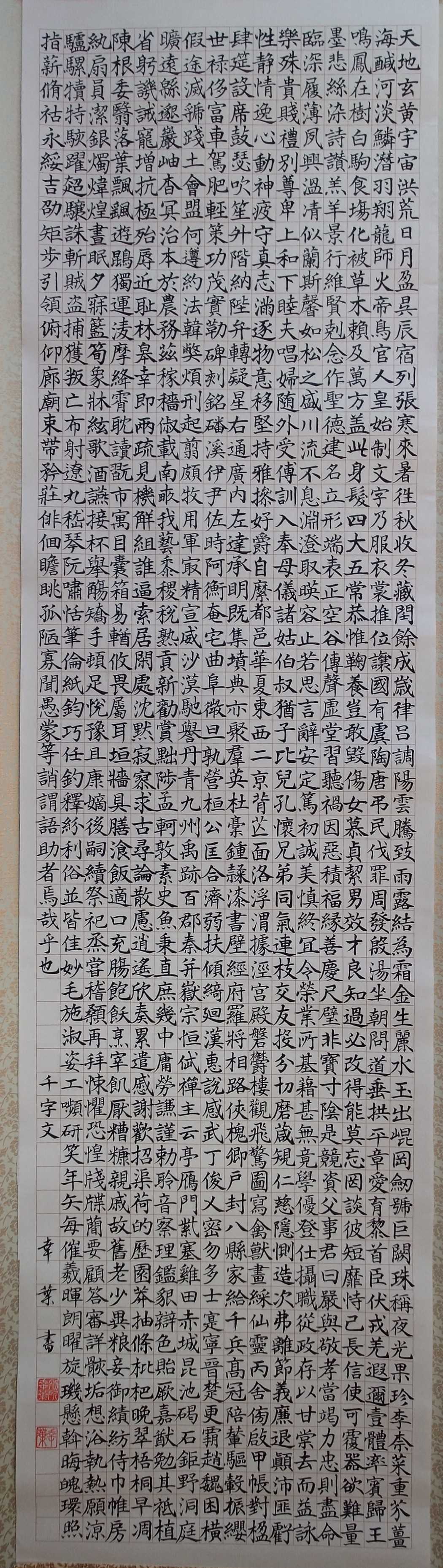 令和7年の書初めとして楷書での千字文を始めた。サイズは半切で1行に64文字、16行。出来れば楷、行、草書の3体作品としたかったが、行書制作中に780字目で抜け字を見つけてしまったため断念した。いずれ6体目指して制作していきたいと思う。1行に小一時間ほど時間を要するため、10日ほどかけて完成したのだが同じ調子で表現することの難しさを学んだ。また、濃淡が出来ては統一感がなくなるので墨汁で書き続けた。初めての試みだったが最後の作品として自身の糧になったと思う。