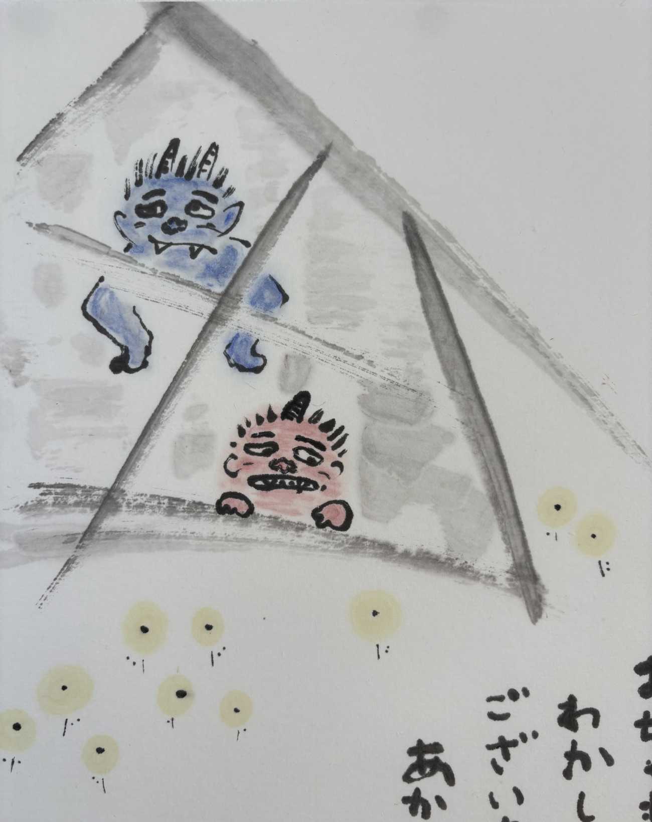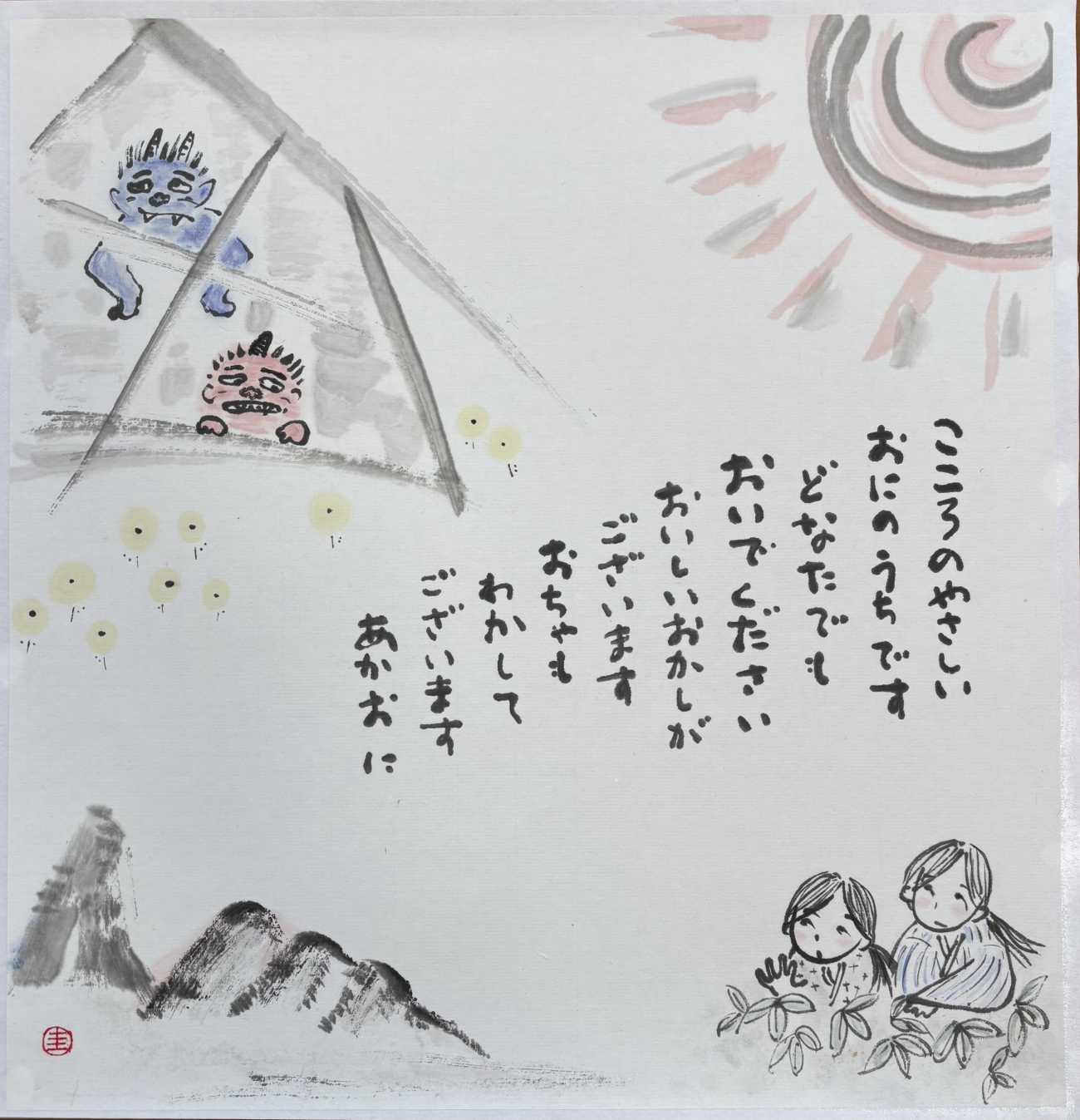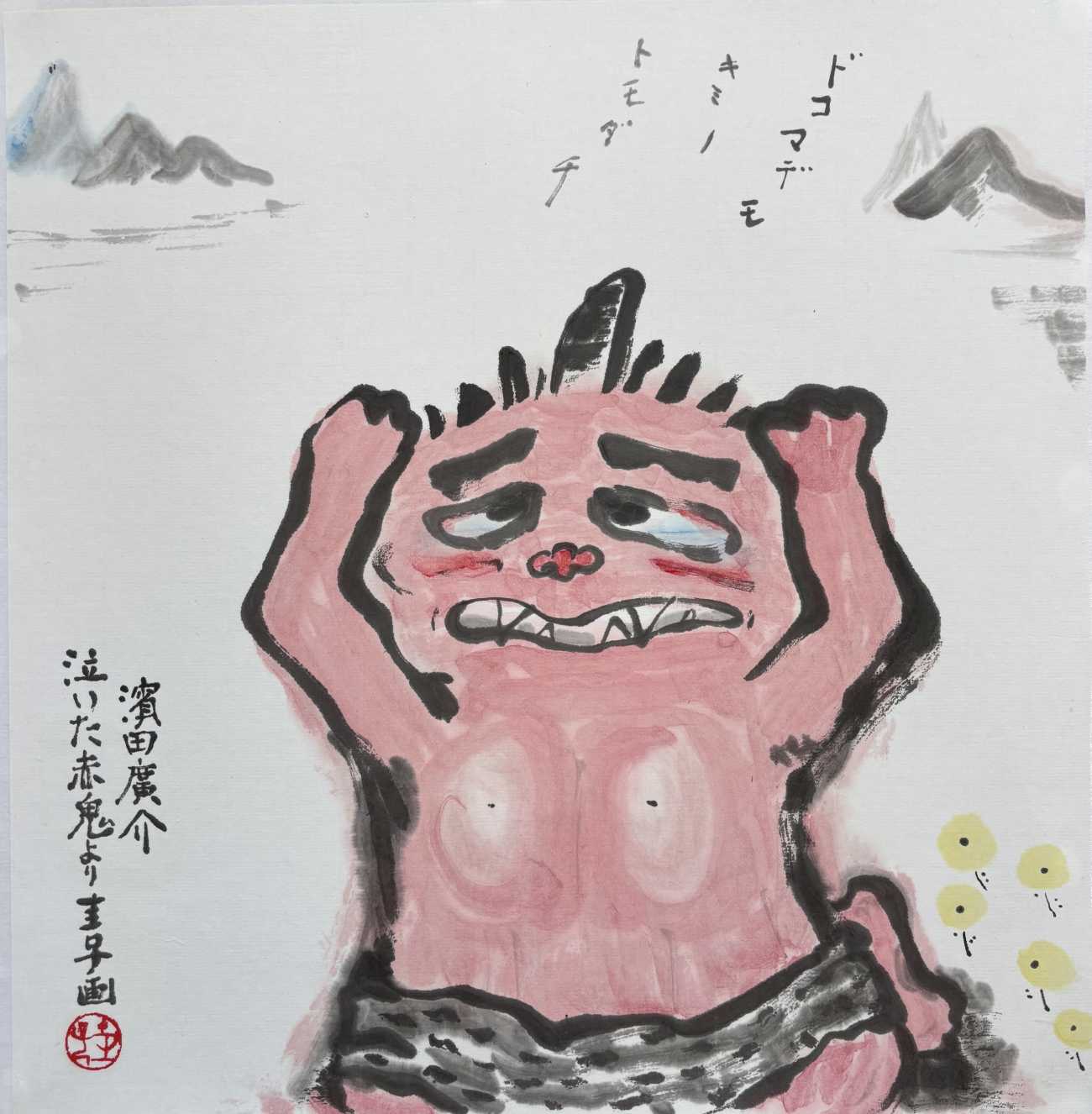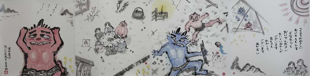浜田広介の童話《泣いた赤鬼》の挿絵を四枚連作で描きました。