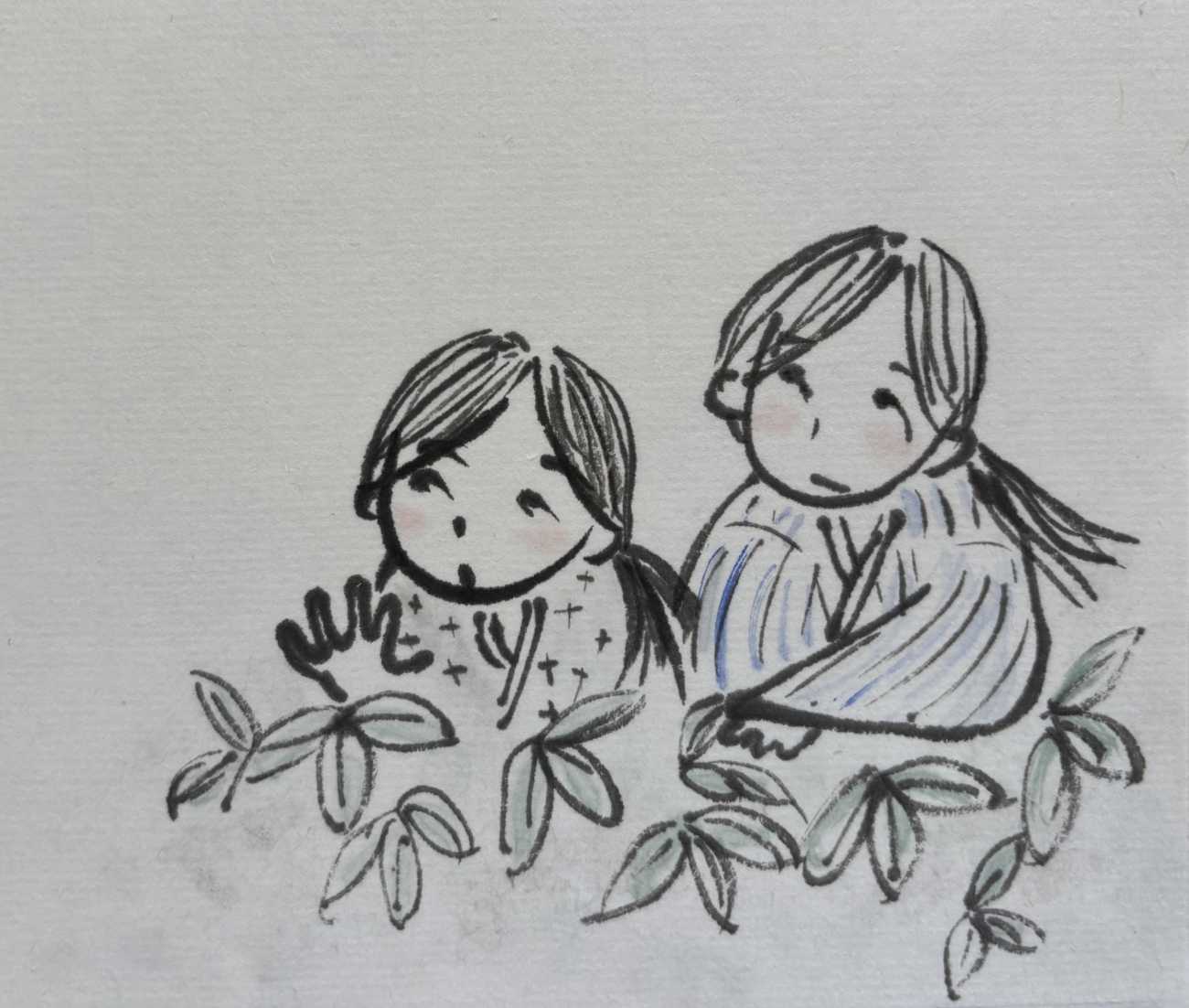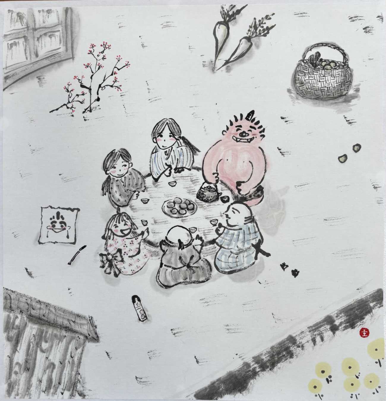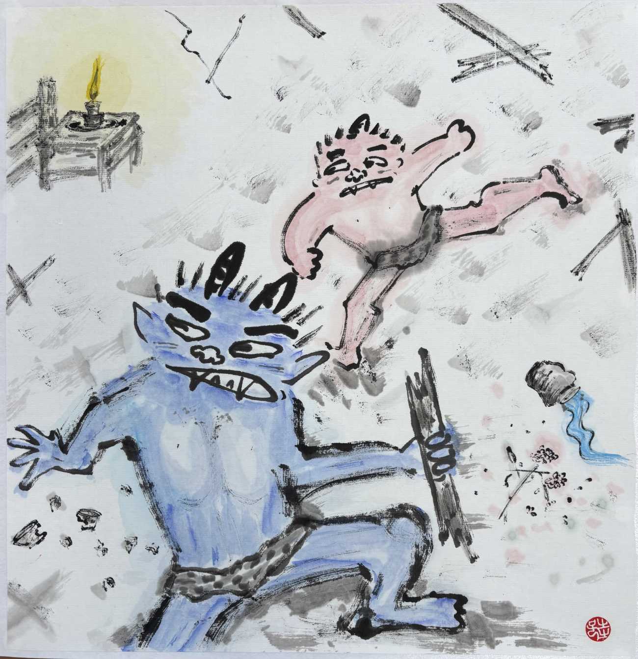 浜田広介の童話《泣いた赤鬼》の挿絵を四枚連作で描きました。