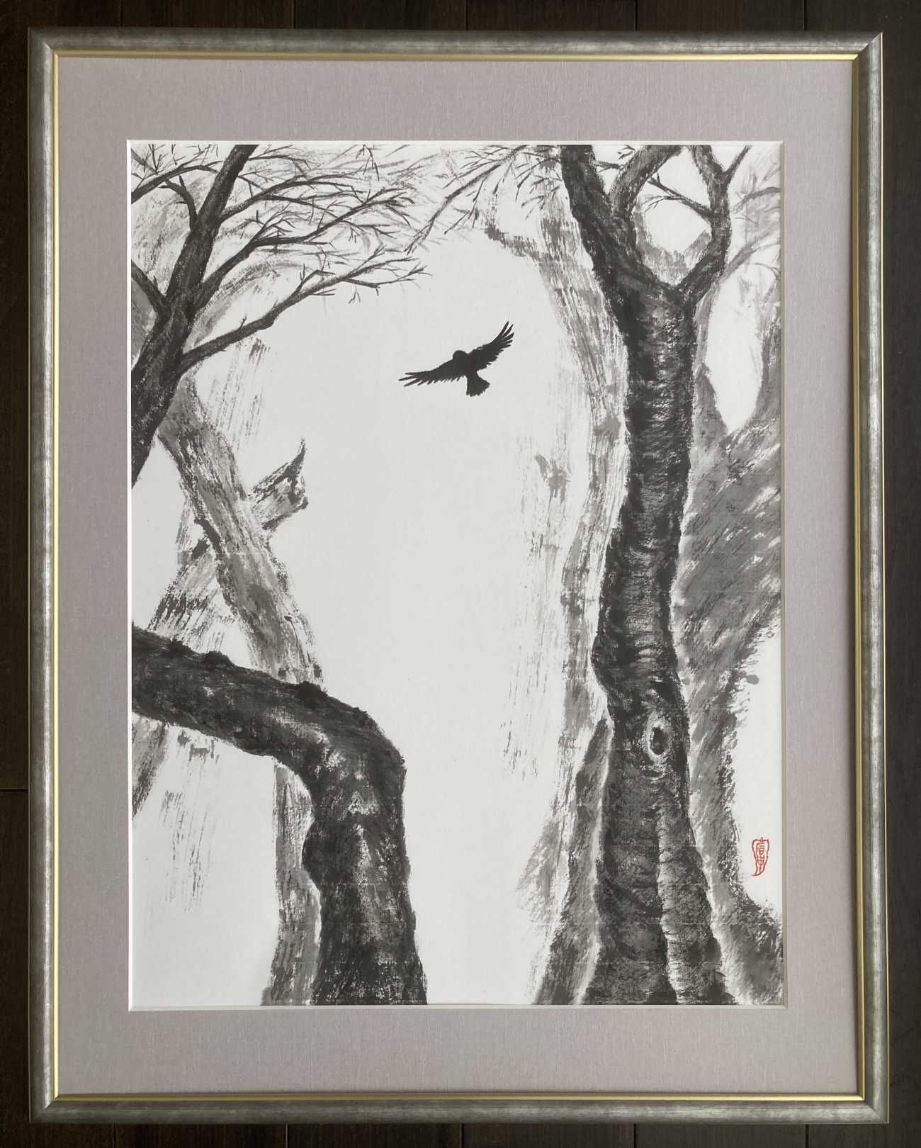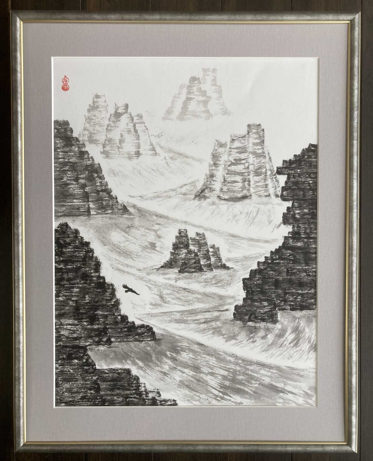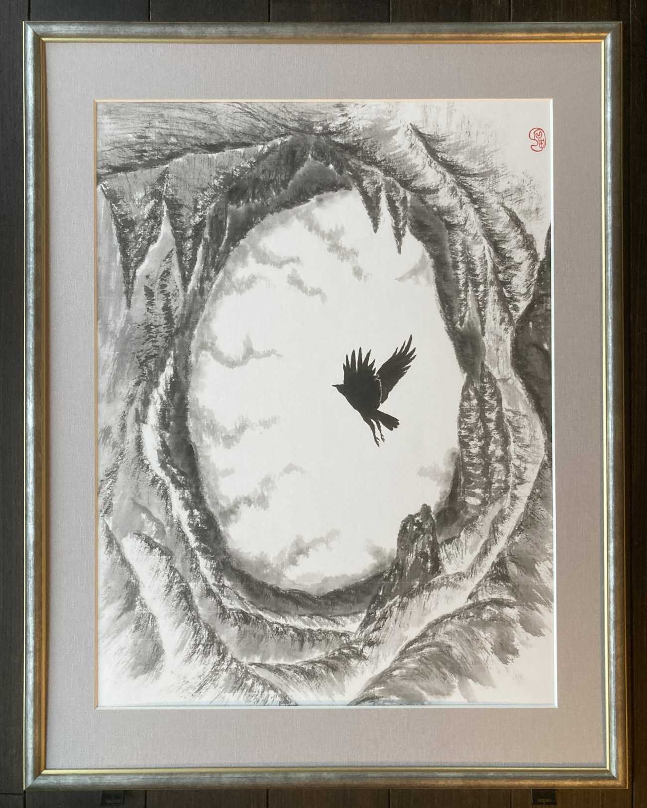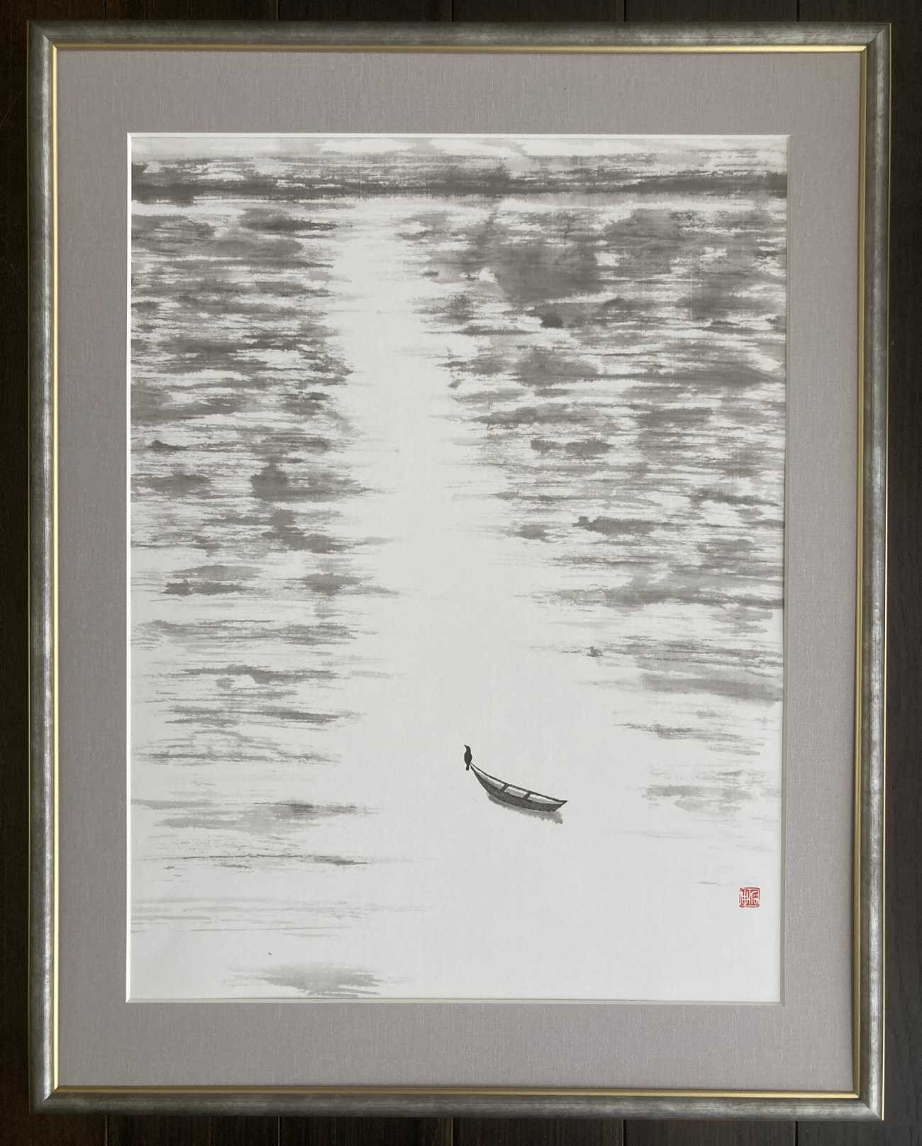 水墨画という未知の世界へ飛び込んだ時から、卒業制作1(小作品連作)完成までの心境を旅に例えて表現した心象風景画です。初めは道なき道をひとり往くような心細い旅でした。連作最後の作品については、制作を始めた当初先が見えず荒波に浮かぶ小舟の心境でしたが、道中で支え合い励まし合える仲間に出会えたことで穏やかな波の表現になりました。
