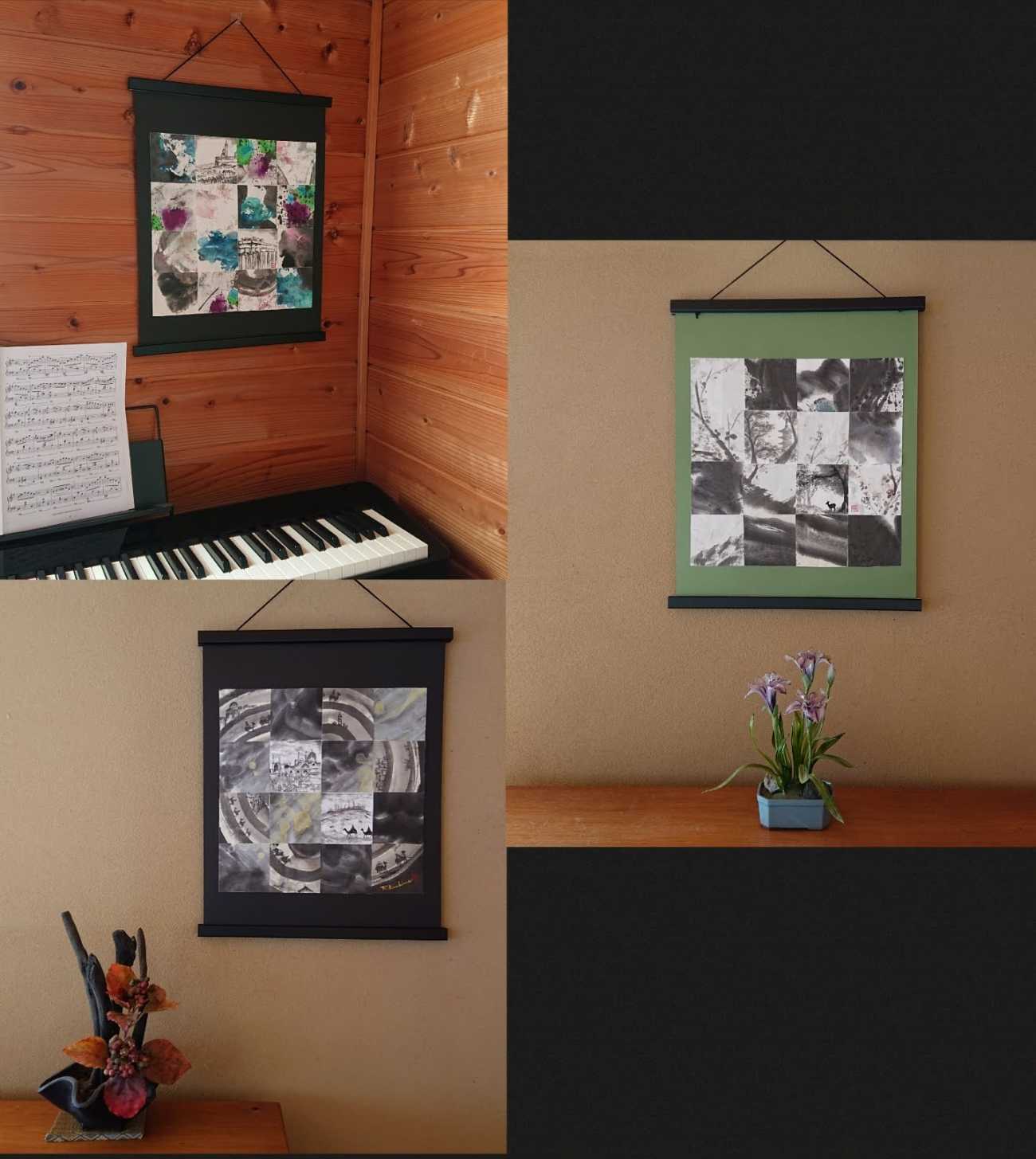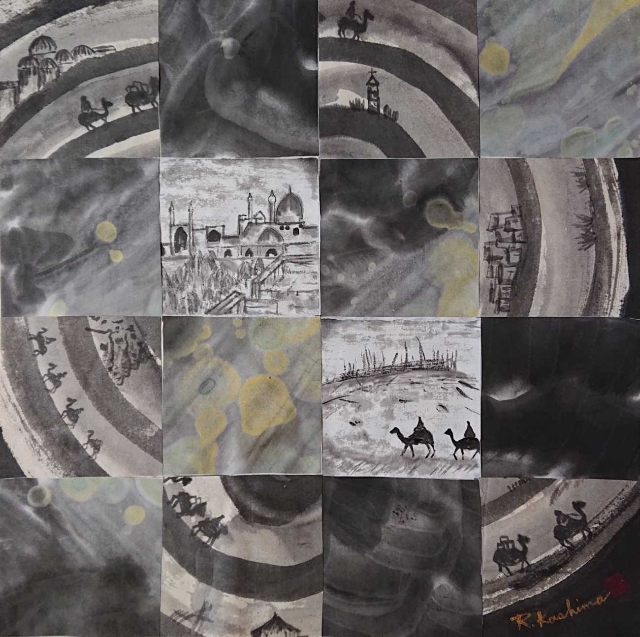 3作品は、これまで重ねた試作の中から墨の濃淡や色との交わりが良いと思う箇所を切り取り、集め、貼り合わせたもので、東西の歴史と文化を繋いだシルクロードの世界を表している。