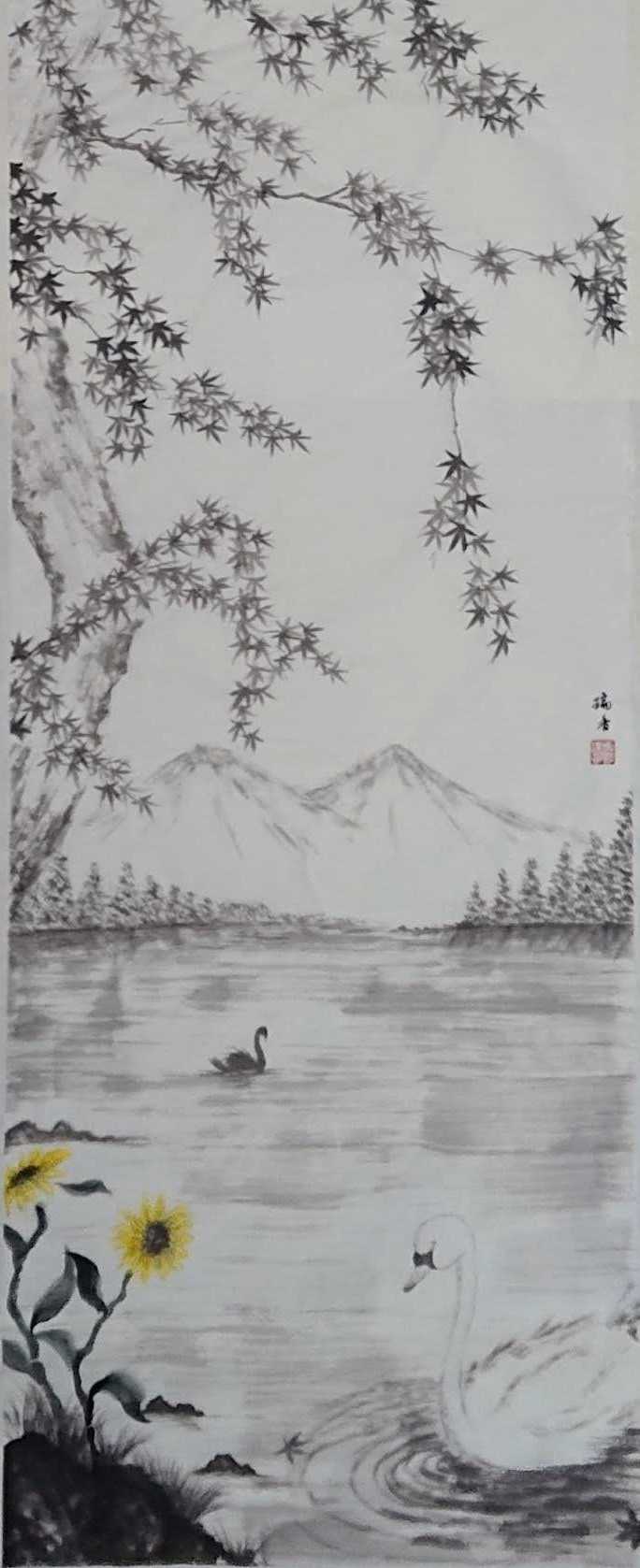 湖畔の秋」は実際に向日葵と白鳥の遭遇があった訳ではないが、異常気象の昨今、無いとも言い切れない。だが静かで美しい中禅寺湖の景色をいつまでも守りたい、そんな思いで描いた。