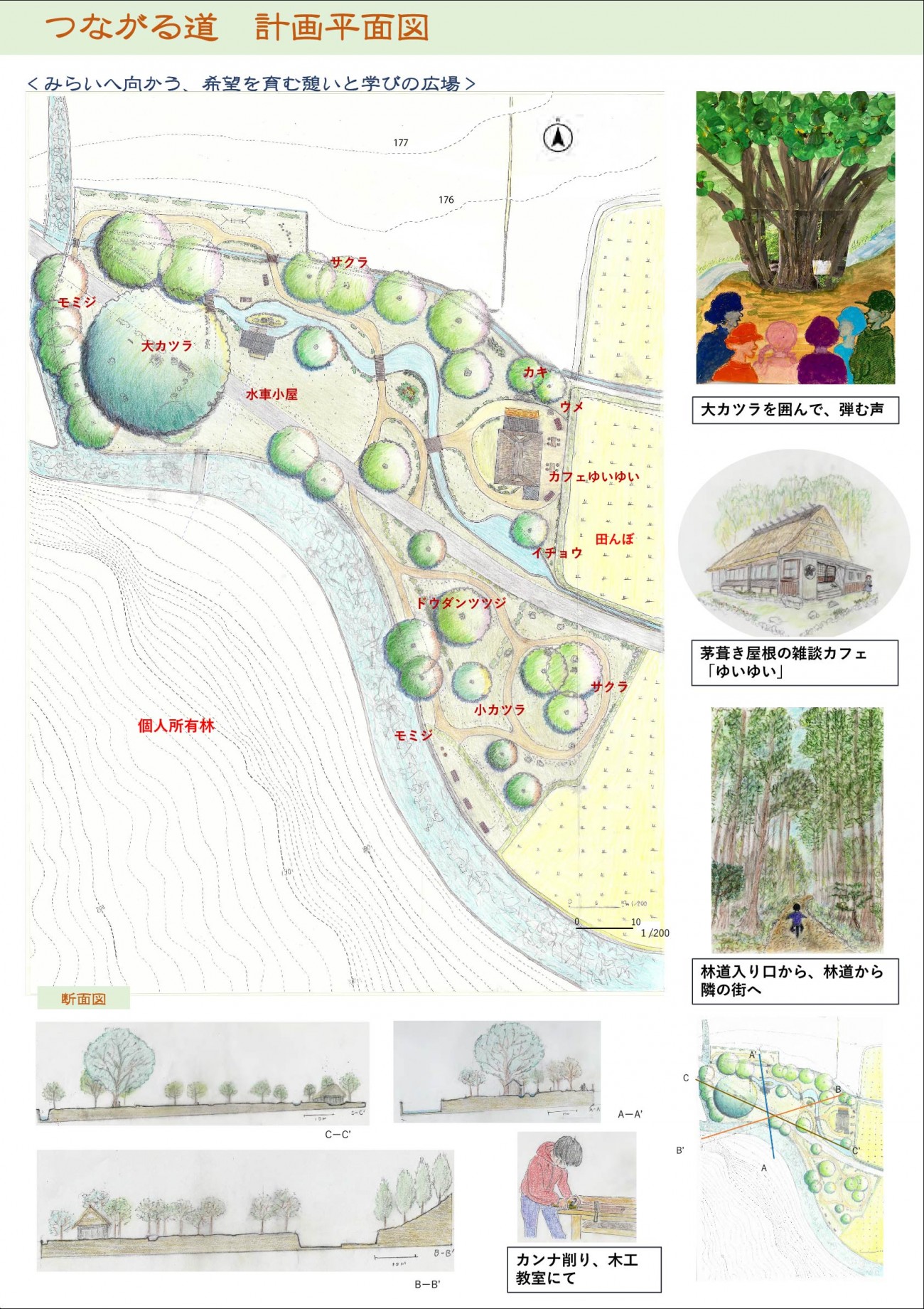 小さな里山の小さな公園で、樹齢300年の大カツラをシンボルとして、人が集い、楽しみ、交流することを通じて、未来につながっていく仕組みや関係性が育まれることを期待している。
