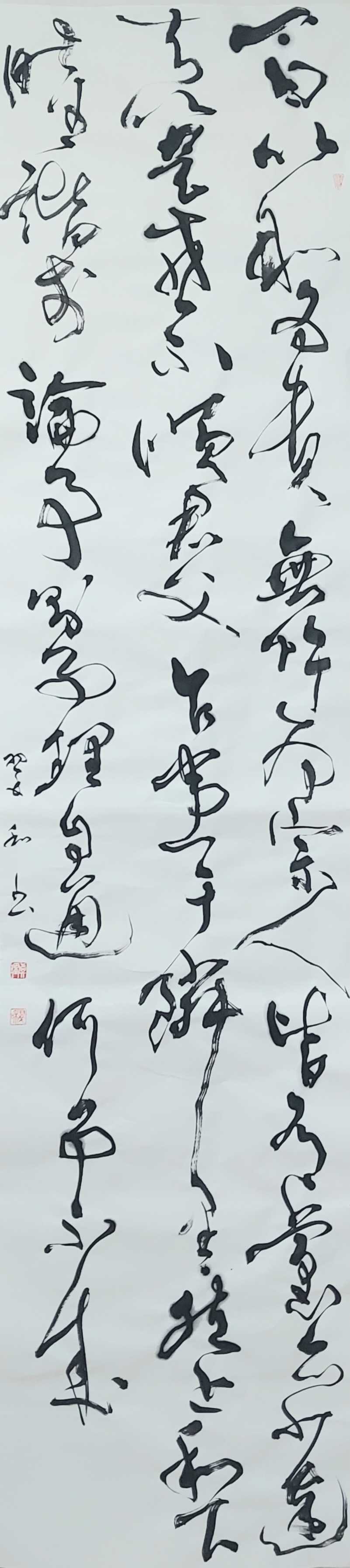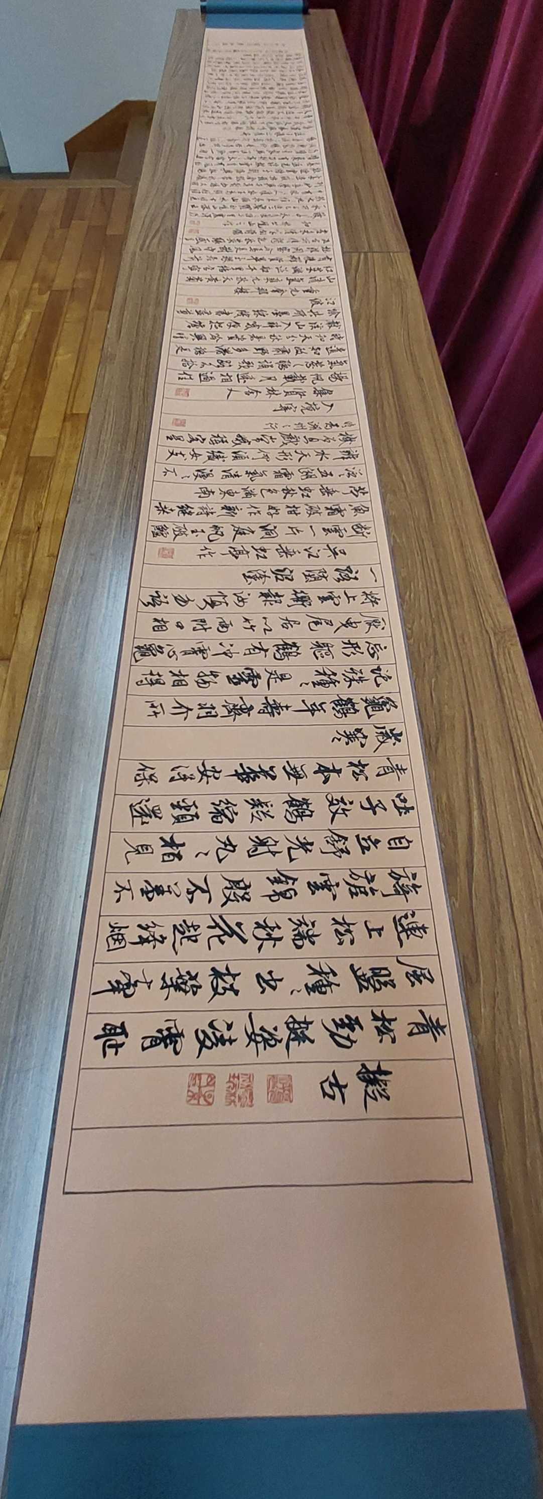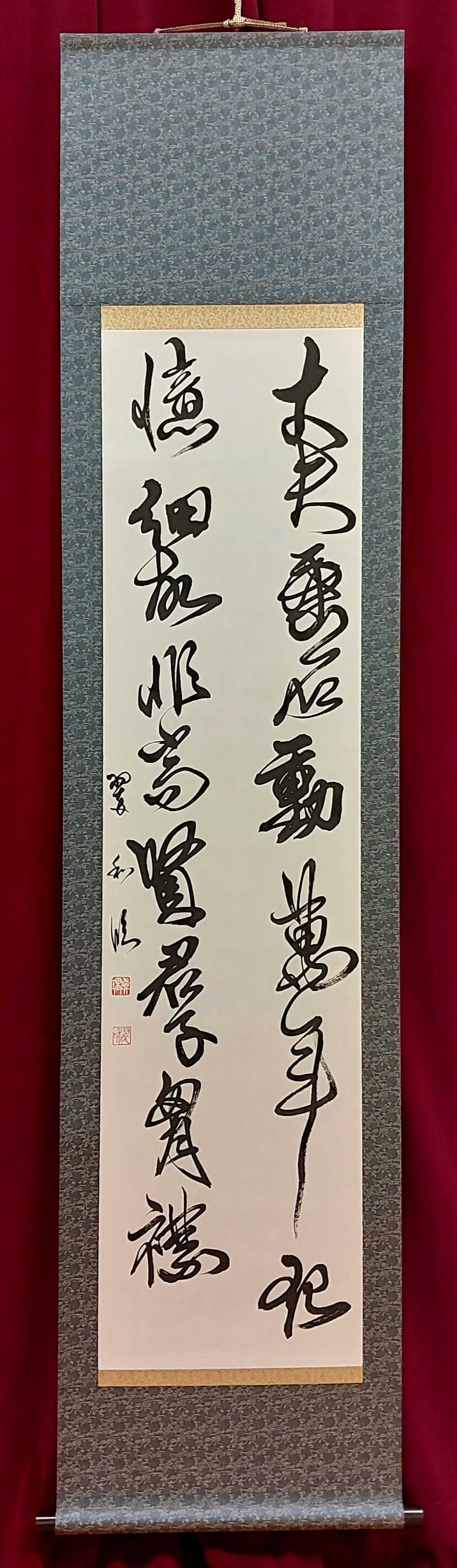 唐の詩人、劉兎錫の詩「酬楽天詠老見示」を取り上げ、米芾倣書からの創作を行った。全文は、「人誰不顧老,老去有誰憐。身瘦帶頻減,發稀冠自偏。廢書緣惜眼,多炙為隨年。經事還諳事,閱人如閱川。細思皆幸矣,下此便翛然。莫道桑榆晚,為霞尚滿天。」桑と楡の間に太陽がある、とは遅い時間をさし、老年に達した事の比喩として使われる。「老いることを哀しむな、夕陽は沈む一瞬も満天を輝かせている」まさに、還暦を過ぎて大学入学を決意した自分の姿を表すように感じた。自分自身、そして共に学ぶ学友へのエールになれば幸いである。