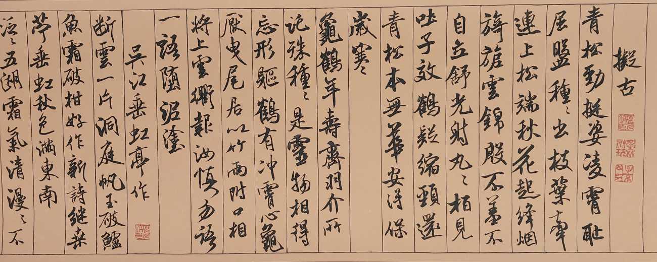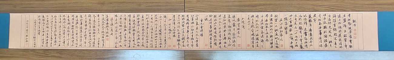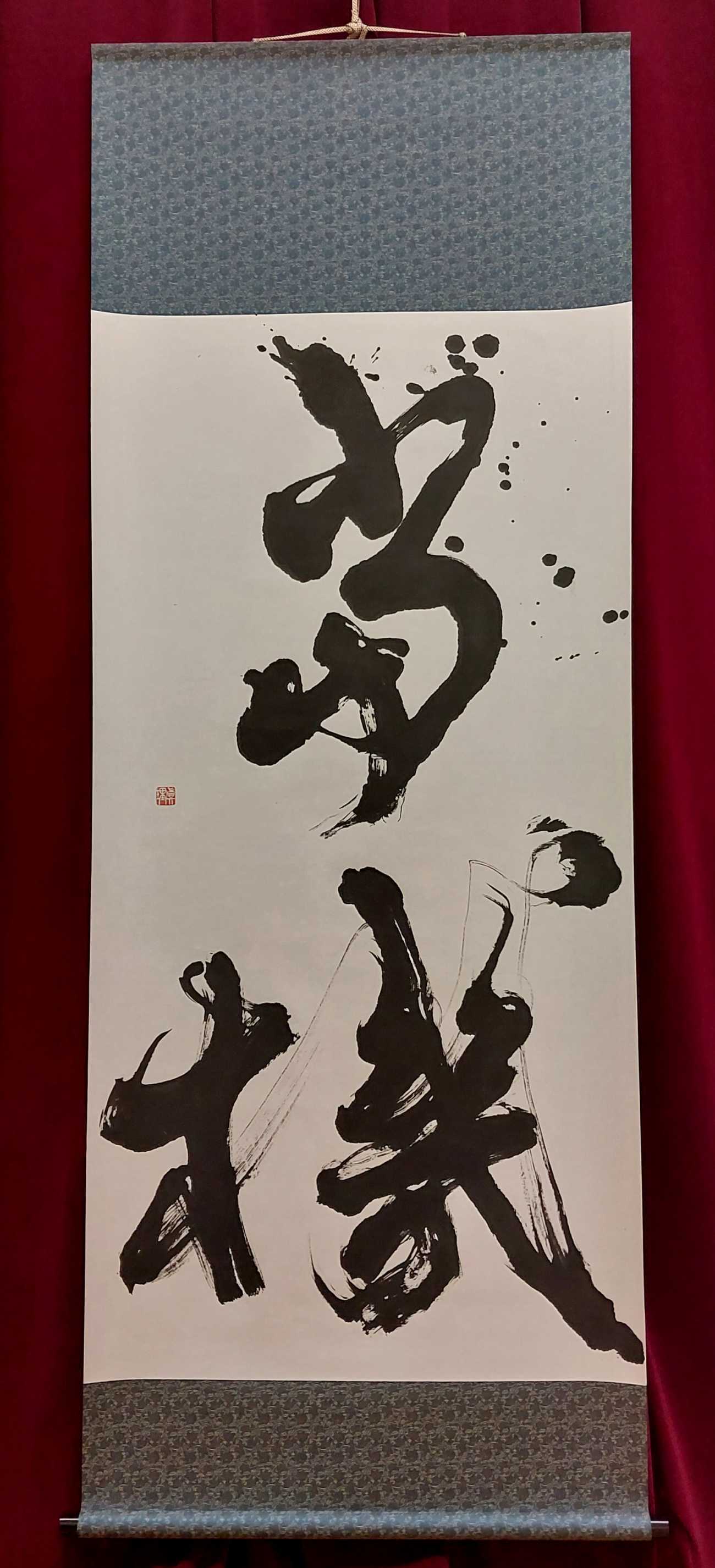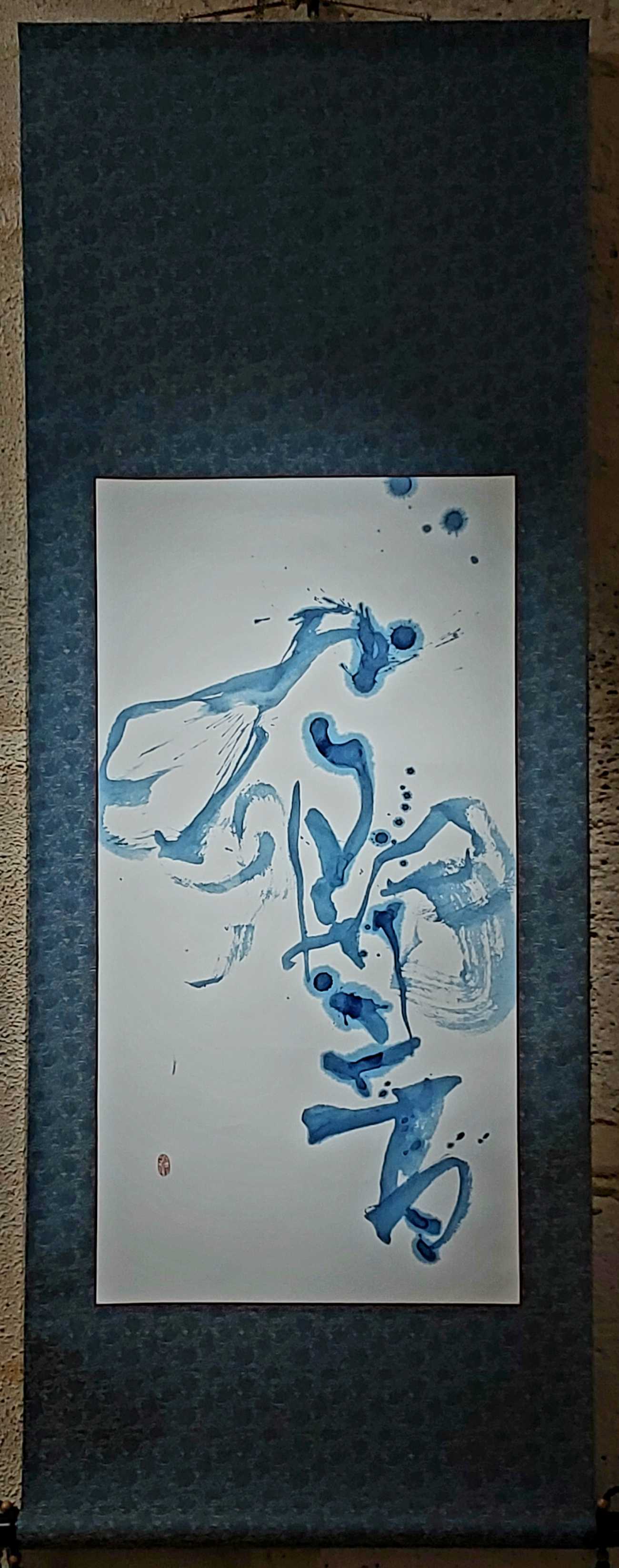 唐の詩人、劉兎錫の詩「酬楽天詠老見示」を取り上げ、米芾倣書からの創作を行った。全文は、「人誰不顧老,老去有誰憐。身瘦帶頻減,發稀冠自偏。廢書緣惜眼,多炙為隨年。經事還諳事,閱人如閱川。細思皆幸矣,下此便翛然。莫道桑榆晚,為霞尚滿天。」桑と楡の間に太陽がある、とは遅い時間をさし、老年に達した事の比喩として使われる。「老いることを哀しむな、夕陽は沈む一瞬も満天を輝かせている」まさに、還暦を過ぎて大学入学を決意した自分の姿を表すように感じた。自分自身、そして共に学ぶ学友へのエールになれば幸いである。