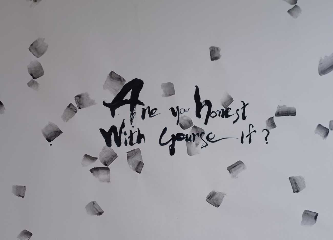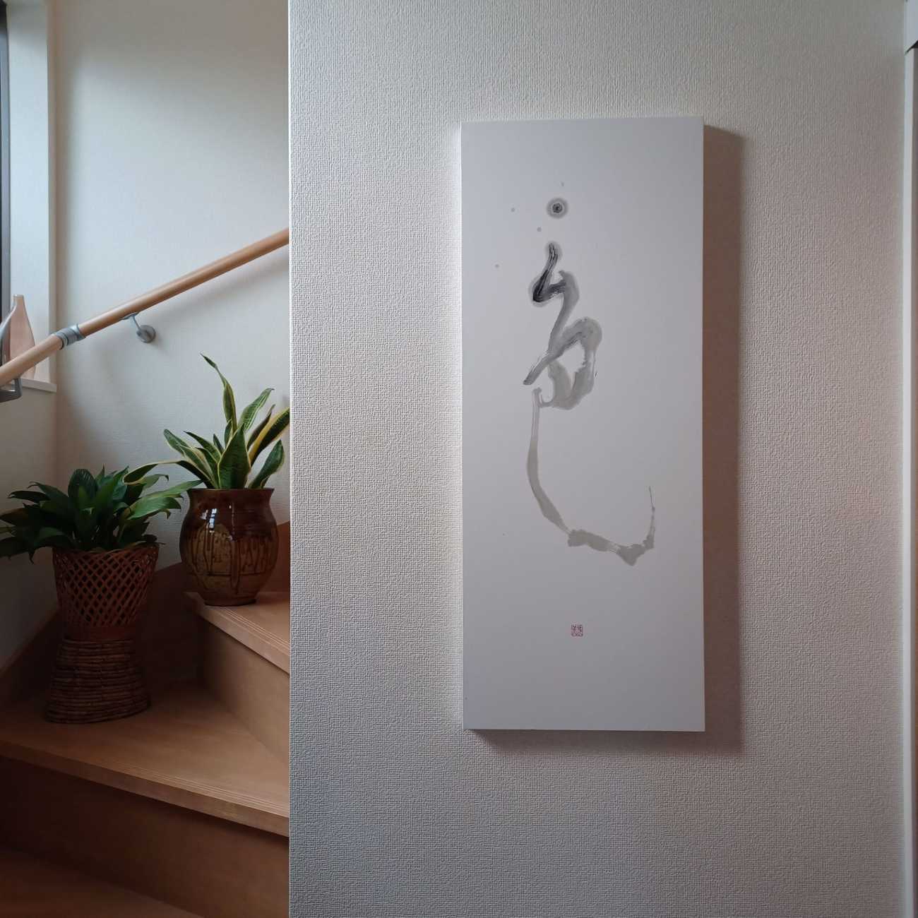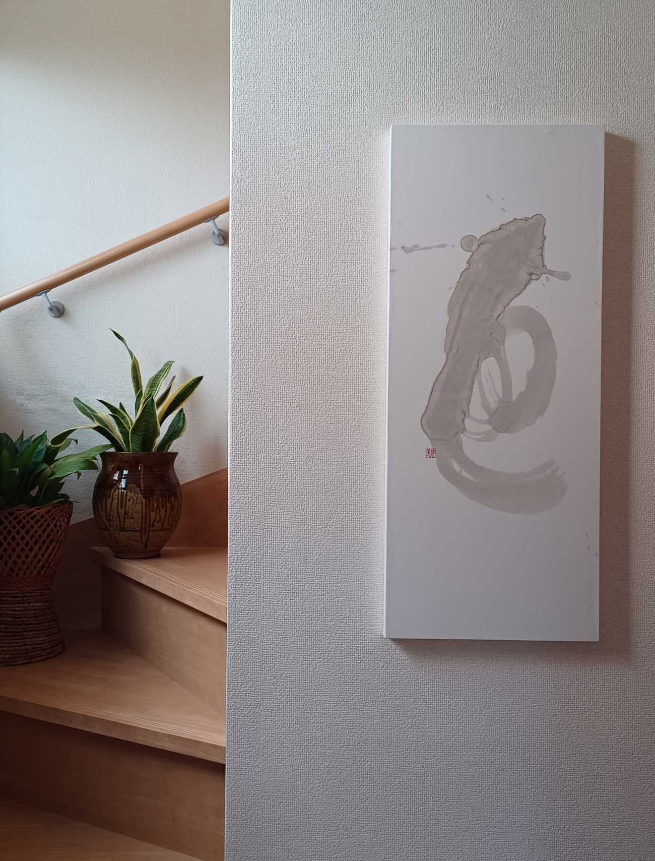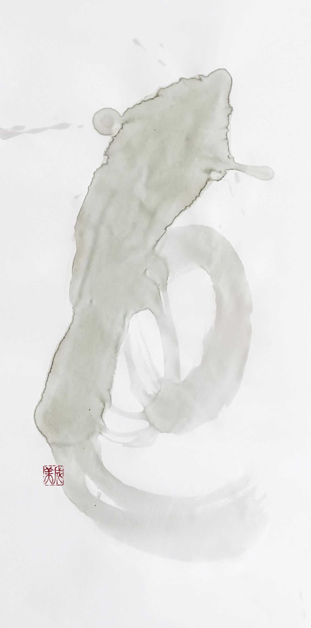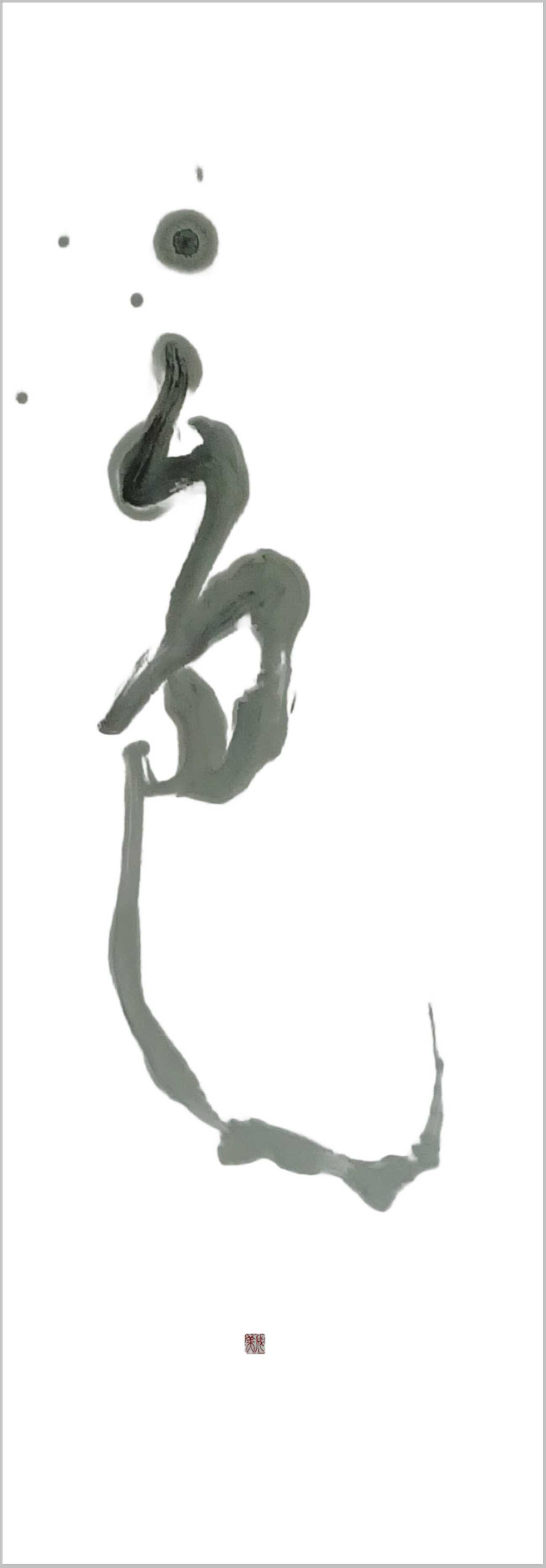 私たちの肉体は時間をかけて壊れていくこともあれば、災害や事故のように一瞬で壊れることもある。「死」はいつも傍にあって「生」というものは危うく頼りないものだ。文字性から離れた表象的表現と墨の可能性を追求していく中で、常に背中合わせにある生と死の関係を2本の線で表現してみた。自由に想像を膨らませながら見ていただければ嬉しいです。