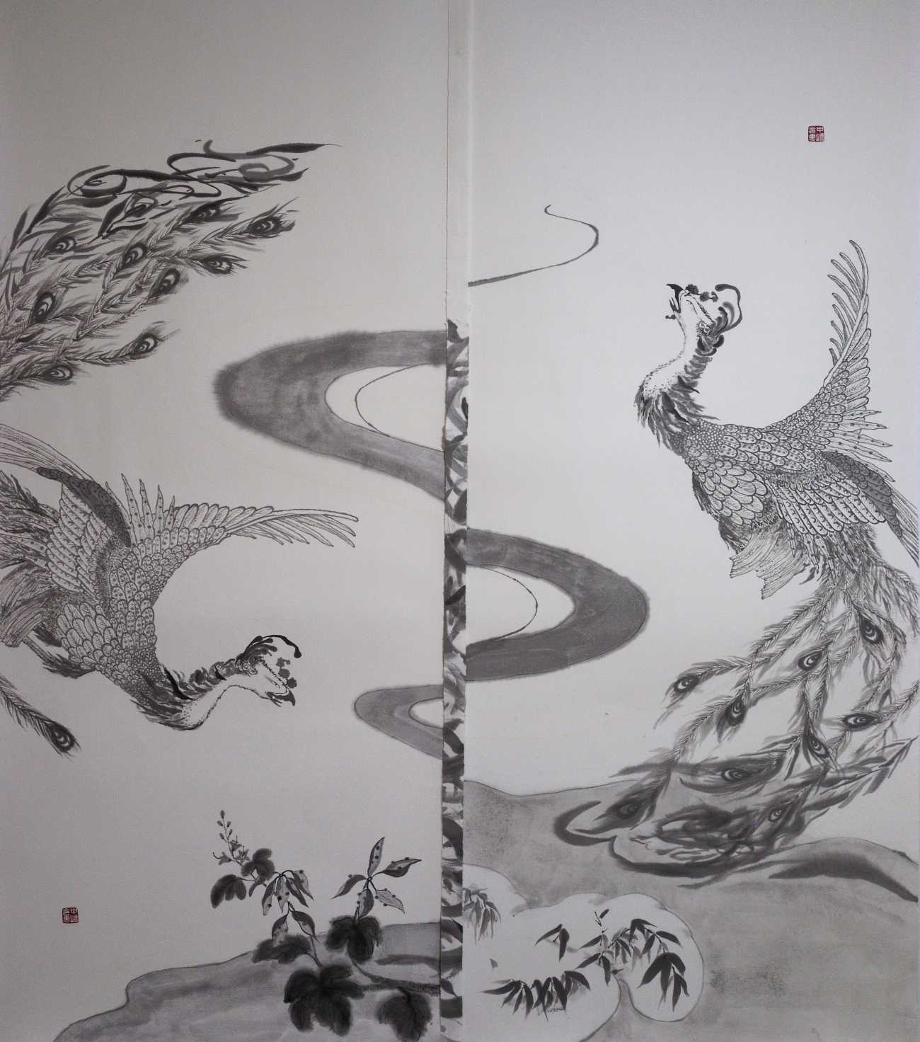 四季の間(空と大地)を往来する、見えないときの流を鳳凰に重ねて描いた。