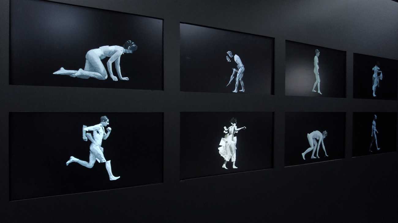 空間的には、横一列に配置した4つのモニターを上下2段に並べた8画面構成で、そこに、人間や動物の歩き、走り、踊りなど多様な動作が映し出される。時間的には、まず新たな画像の断片が既存の画像に順次重なって動きを構築するフェーズを示し、次に断片が次々と入れ替わりながら動きを生み出すフェーズへと移行。さらに、被写体が左から右へと画面を越境しながら横切るシークエンスが展開され、断続的な動きが独特なパターンを持つ軌跡として視覚化される。