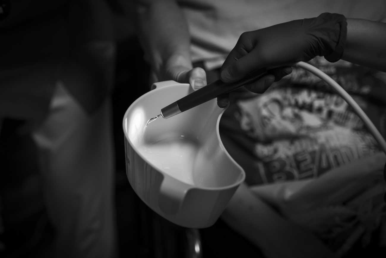 歯を削る、唾液を吸う機械類に加え、うがい受けやペーパーエプロン、歯ブラシやスポンジブラシなど準備していく器材は数十種類に及びます。