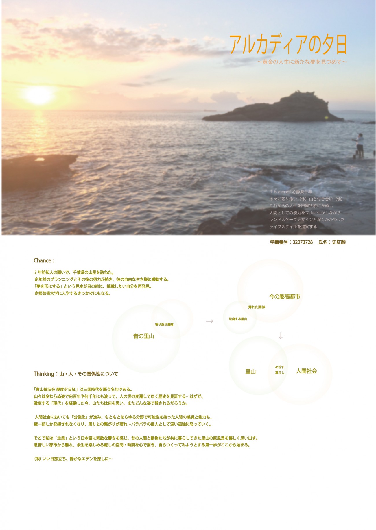 3年前、千葉県の鋸南町に住む知人に誘われ、彼の所有している8000坪の山林を訪ねた。定年後の18年間をかけて荒山を開墾、畑、山小屋、ログハウスを作る彼の半農半游的なライフを楽しむ姿に影響を受け、挑戦したい自分を再発見。大学の説明会で高梨先生の「ランドスケープデザインは唯一生き物を使った芸術」の言葉に惹かれ、本コースへの入学に至る。