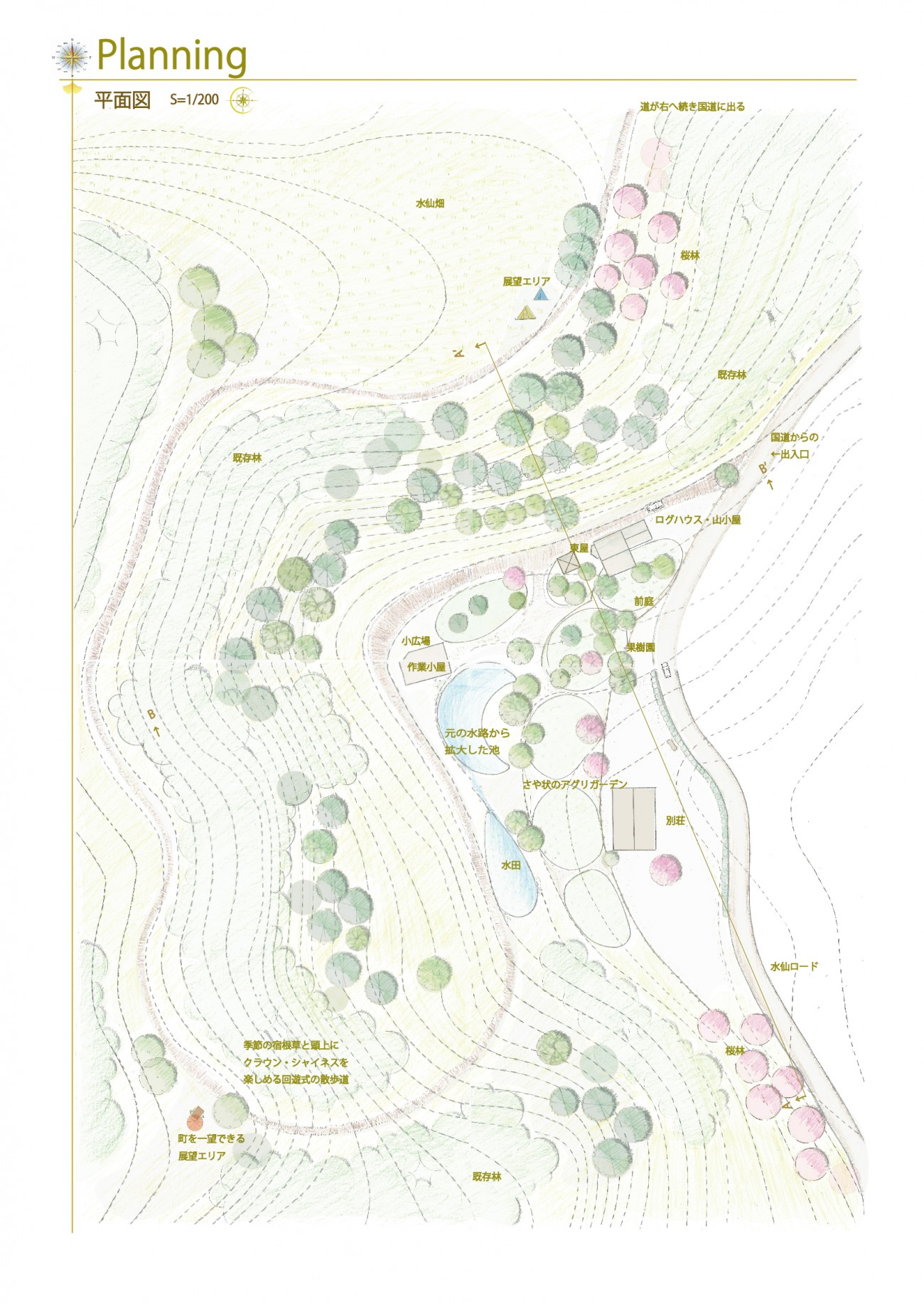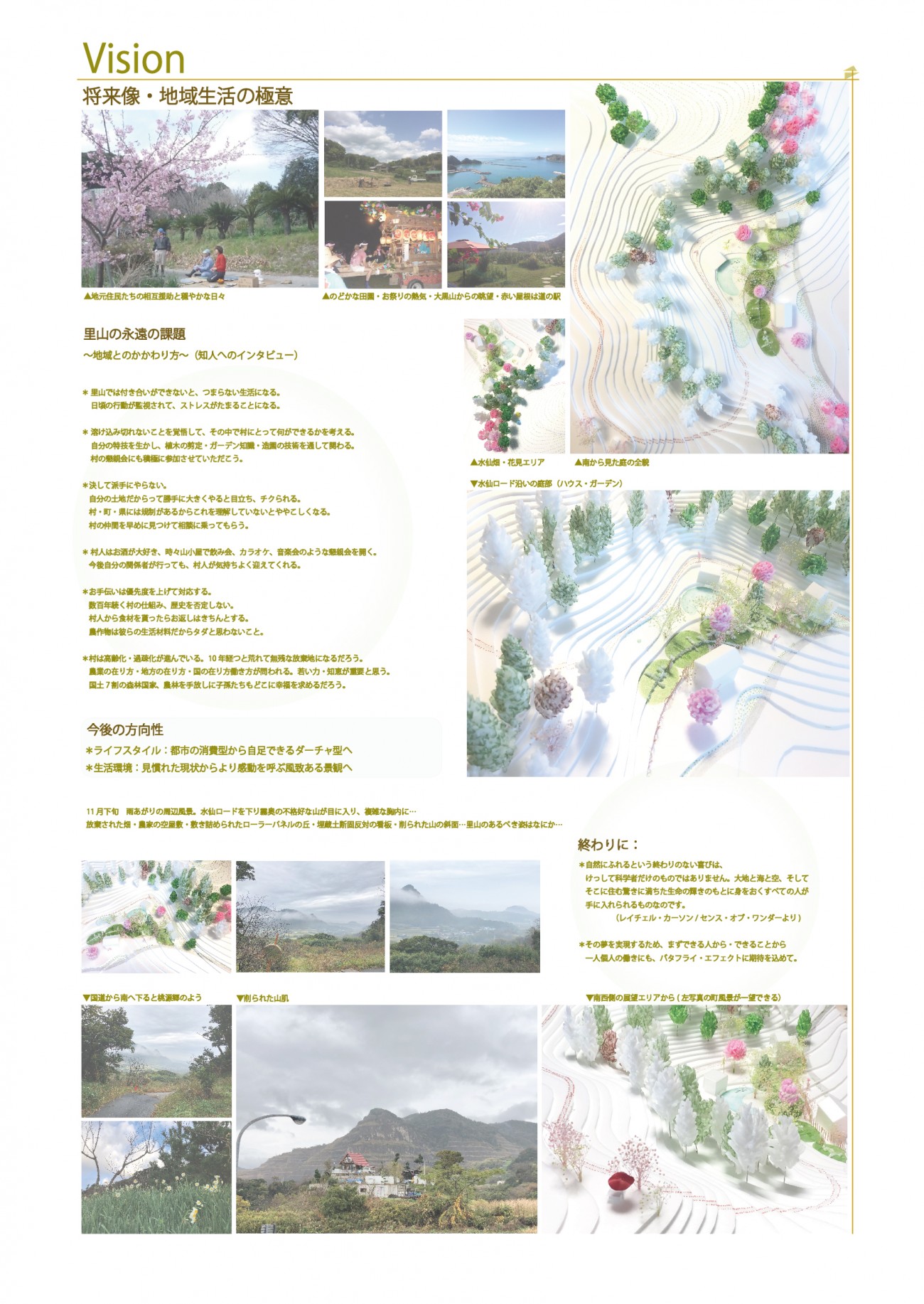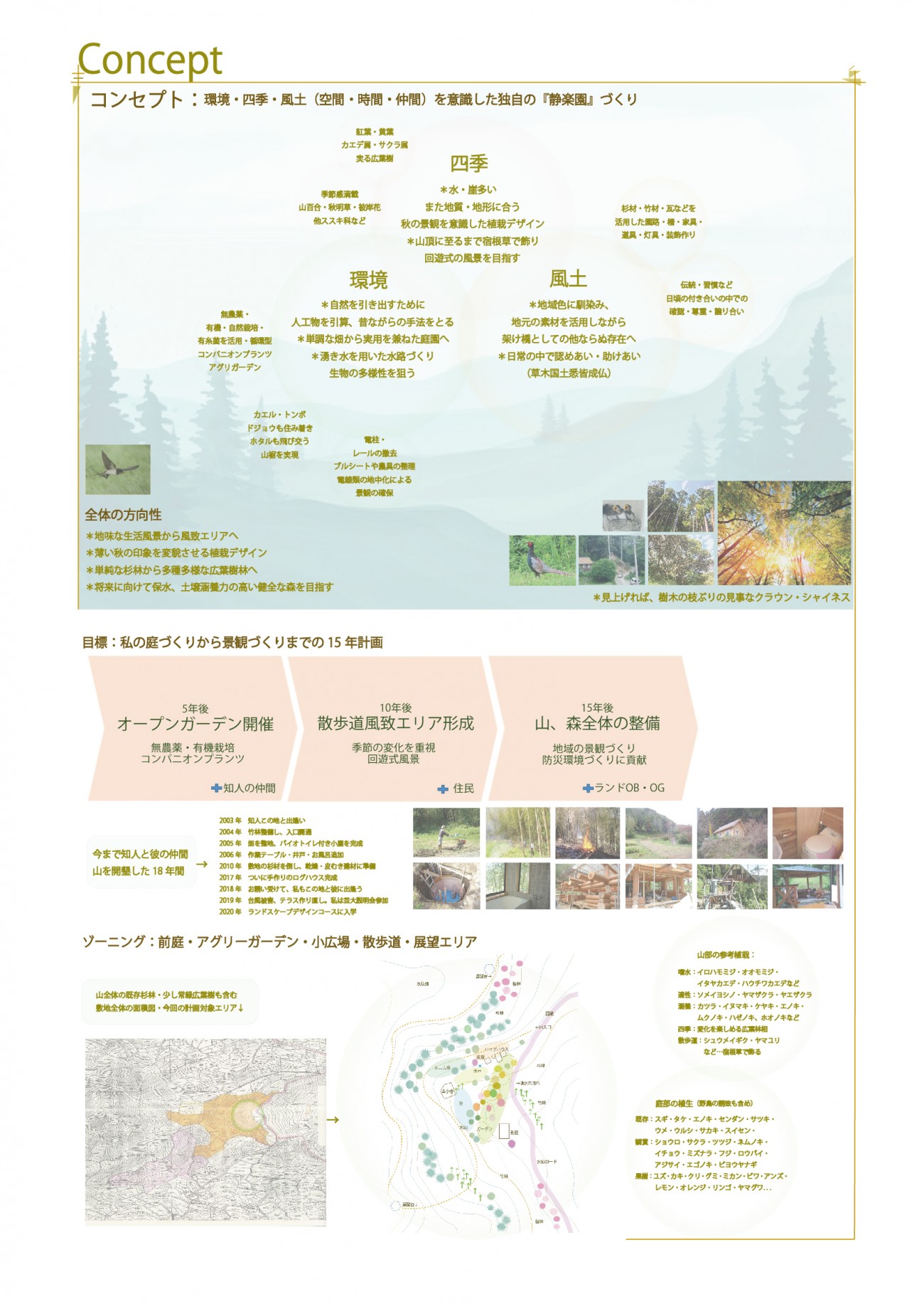 対象地は見返り峠にあたる水仙ロード沿い。杉林と竹林をメインとした山間に、こじんまりとした畑がある。そこで湧き水を利用した庭デザインと既存の植生を活かした植栽デザインを行う。今までに薄かった秋の魅力を引き出しながら、単調な畑から美しいガーデンへ、杉の単純林から多様な広葉樹林への変貌を目指す。