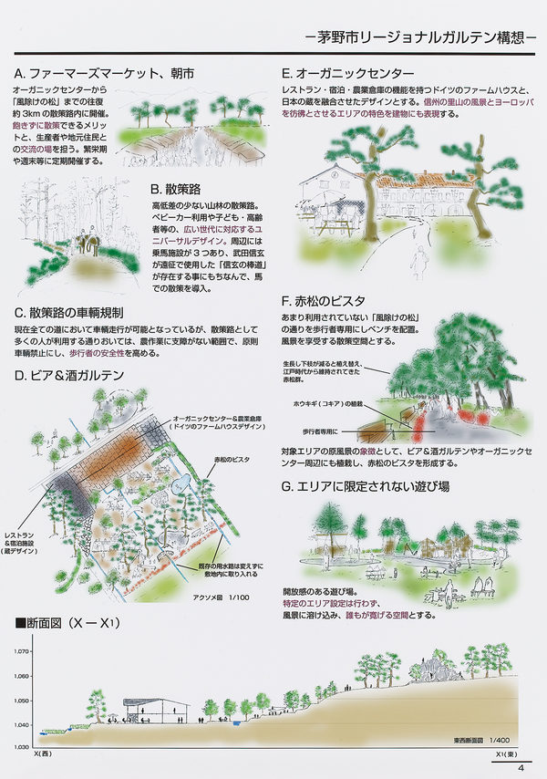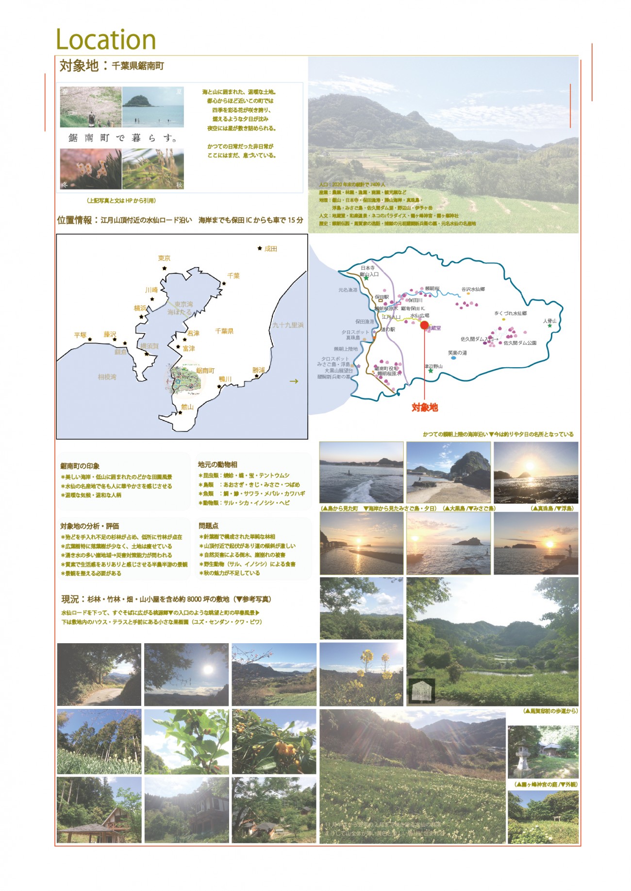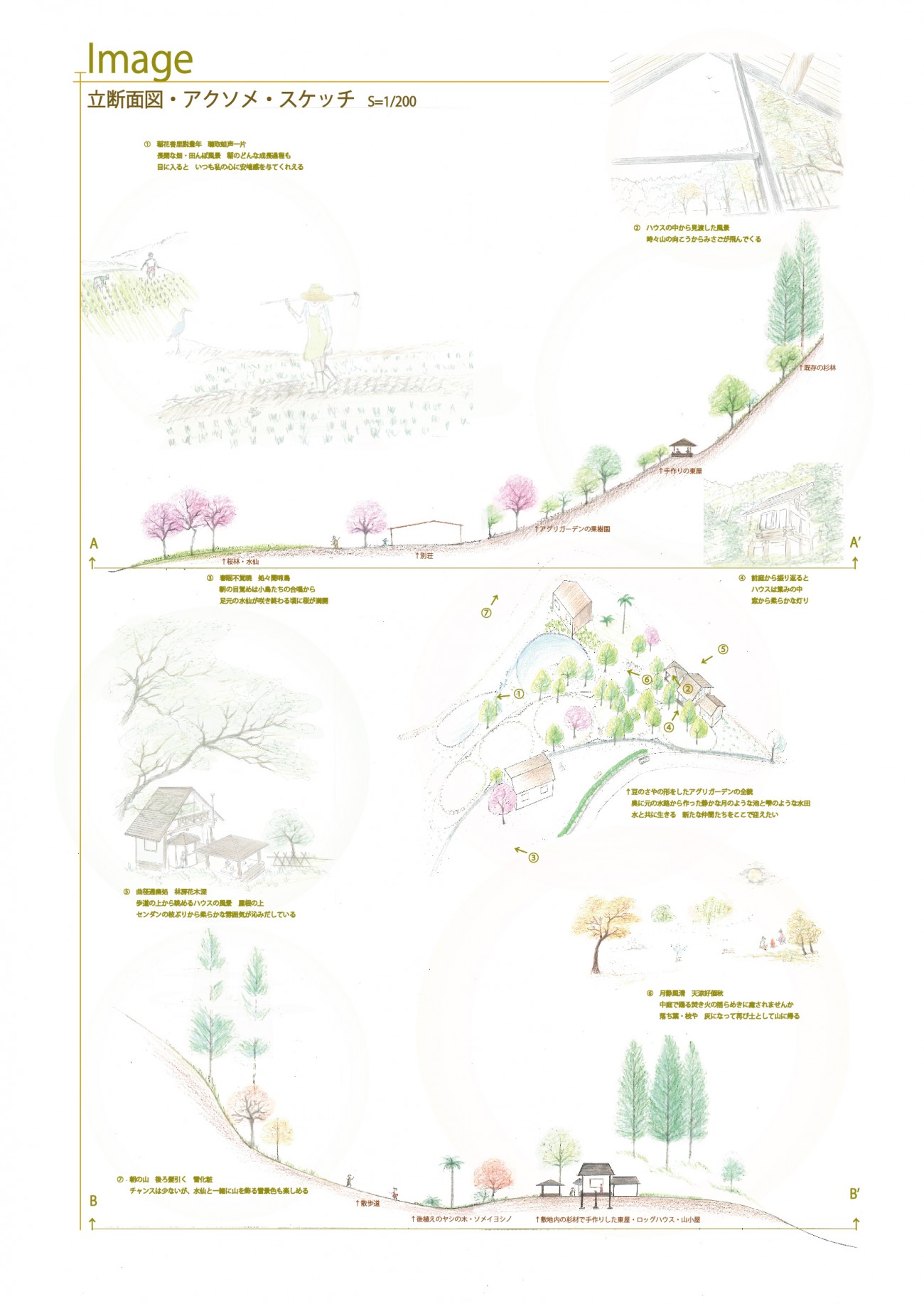 対象地は見返り峠にあたる水仙ロード沿い。杉林と竹林をメインとした山間に、こじんまりとした畑がある。そこで湧き水を利用した庭デザインと既存の植生を活かした植栽デザインを行う。今までに薄かった秋の魅力を引き出しながら、単調な畑から美しいガーデンへ、杉の単純林から多様な広葉樹林への変貌を目指す。