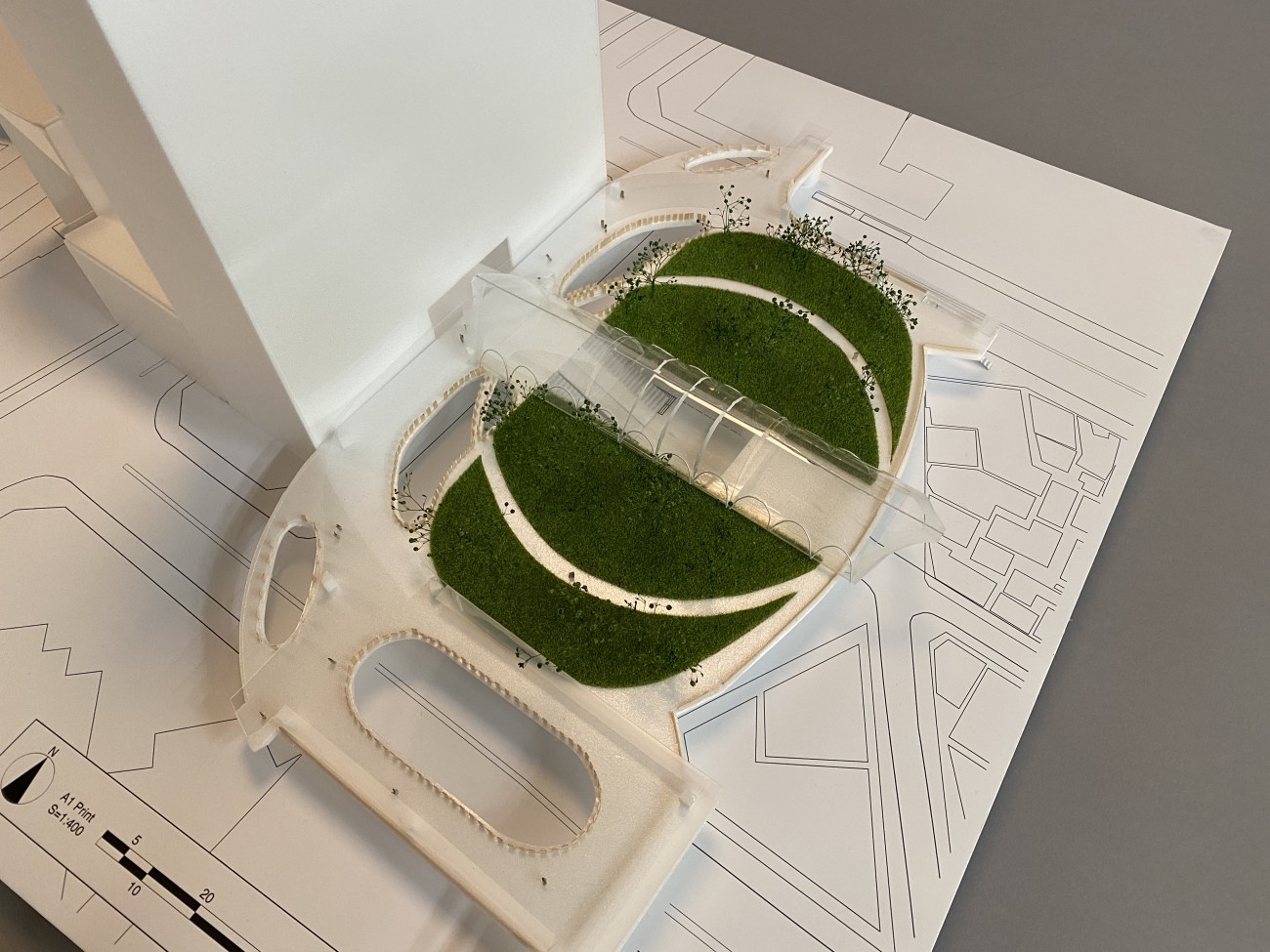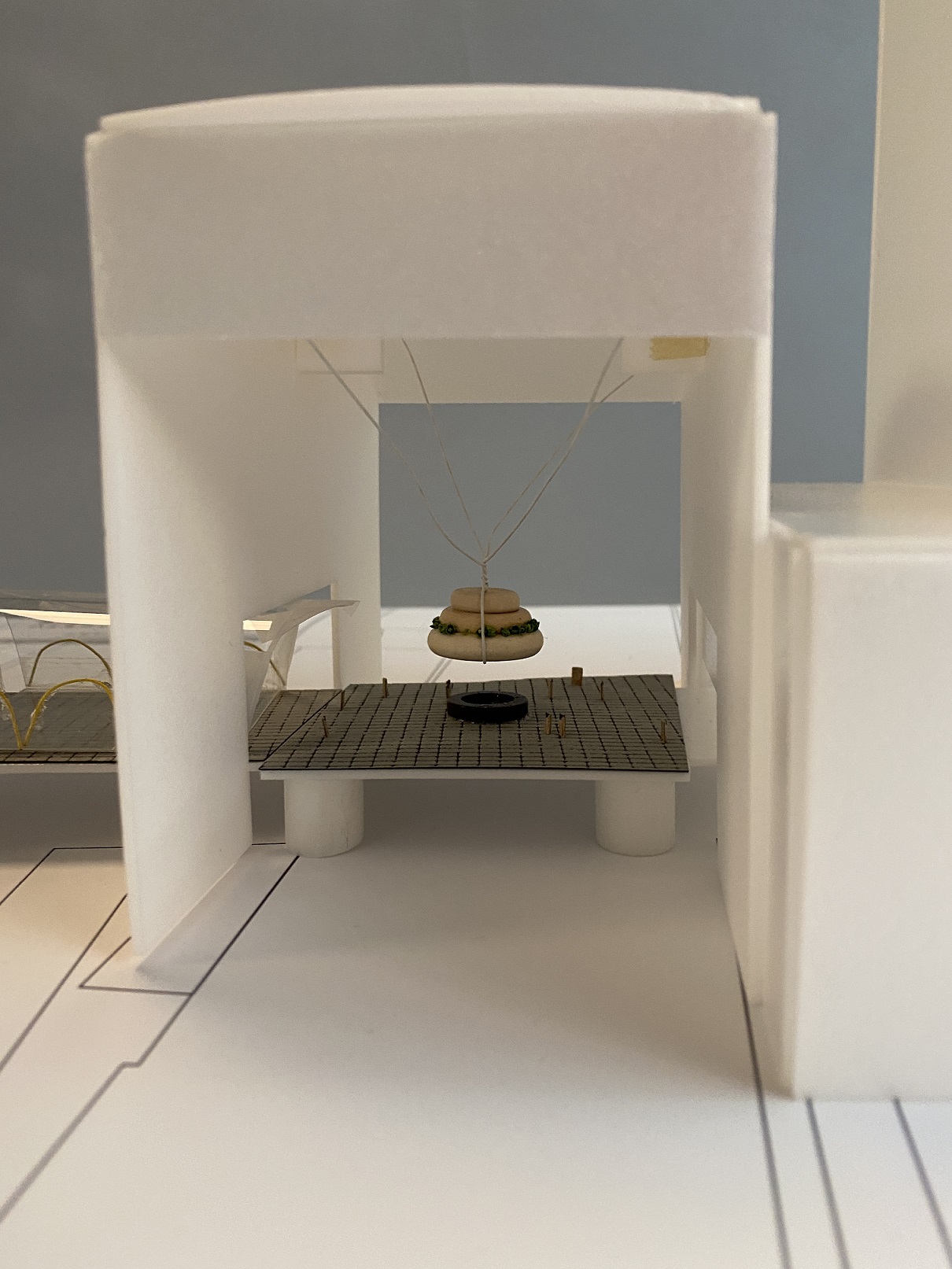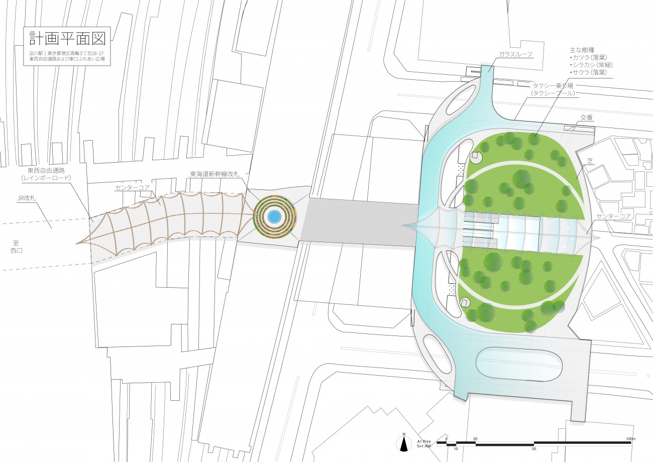 対象地は品川駅のJR改札から続く東西自由通路、新幹線改札広場、東口広場である。バイオフィリックデザインを取り込む上で、品川駅の周辺環境を、駅を歩く中で感じること、そして一般的な環境要素を目、耳、鼻などで感じることができる空間を設計した。