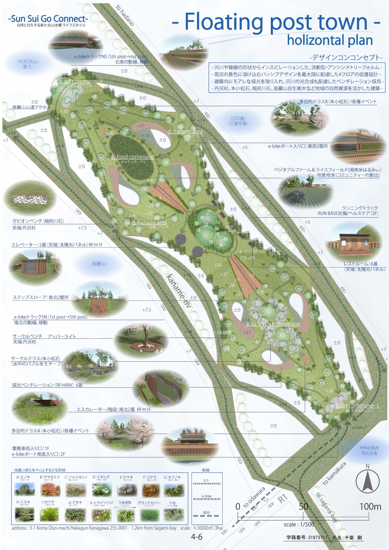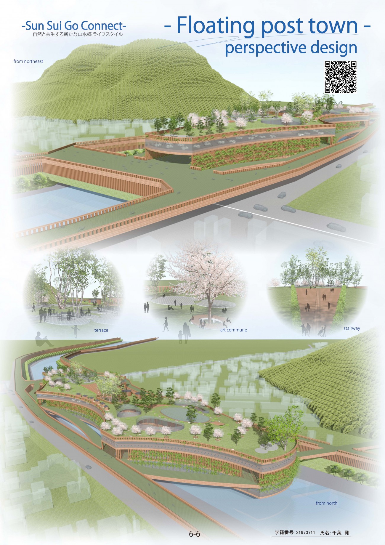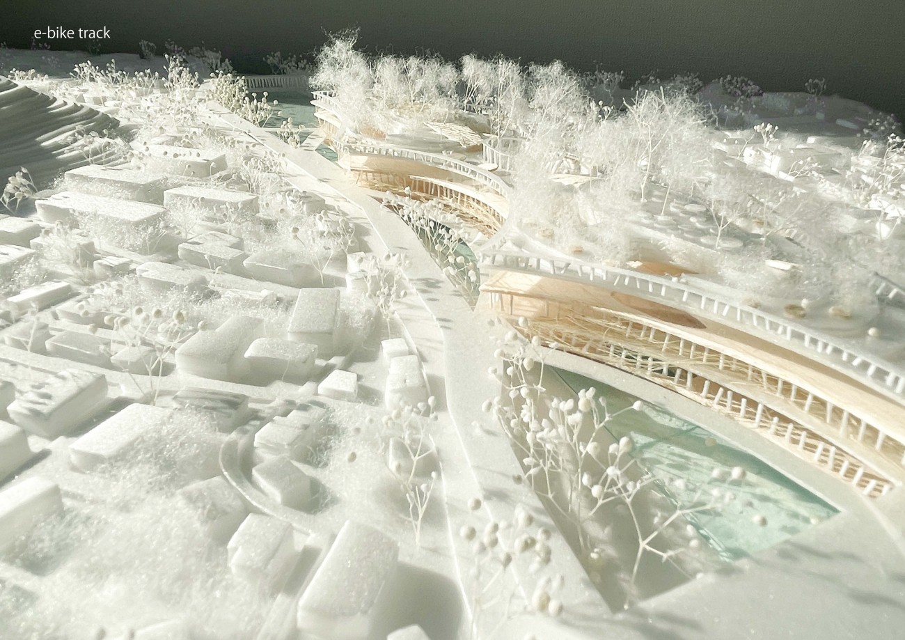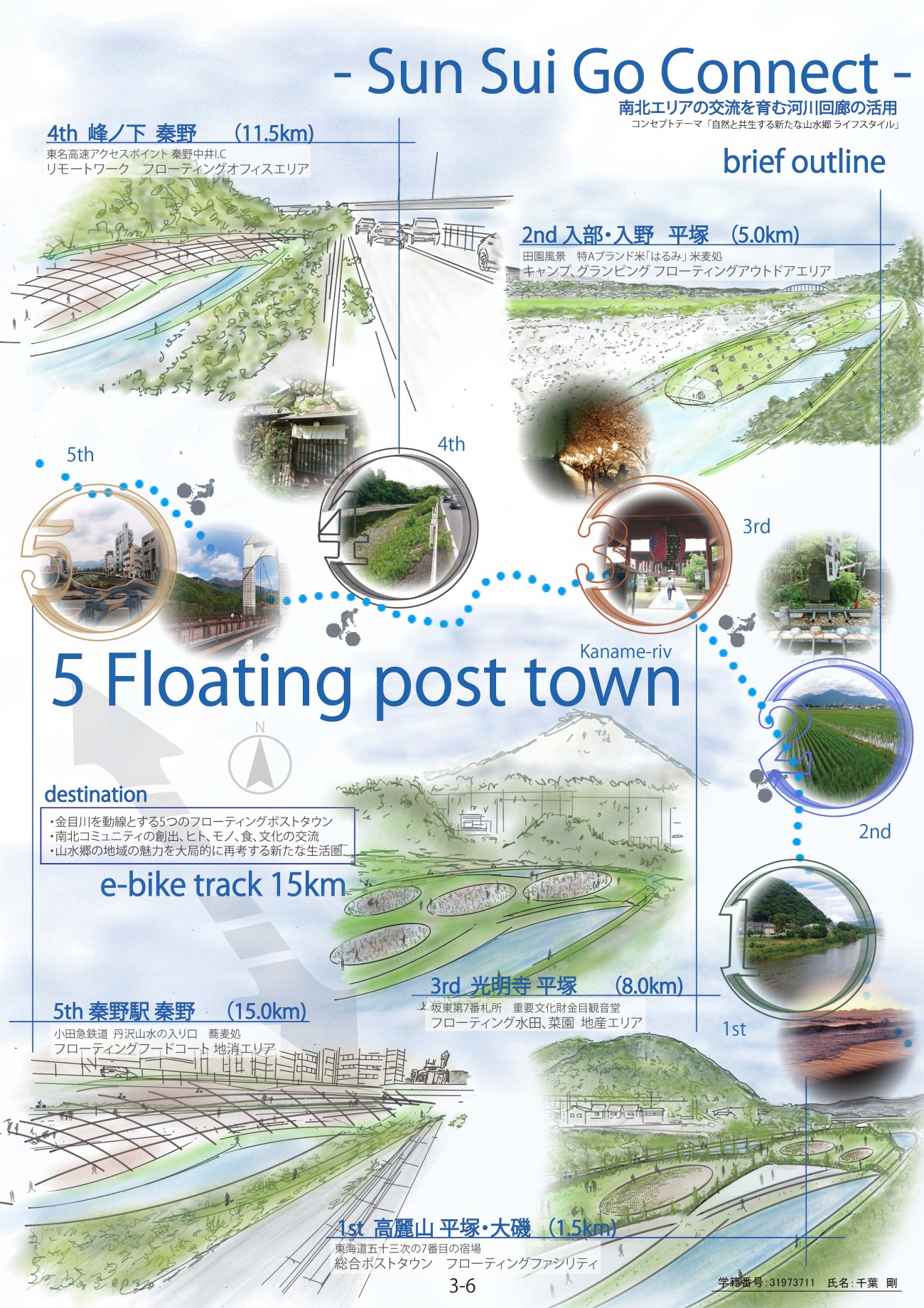 河川はすでに、山と海と郷を繋ぐ自然動線のガイドとして土地に存在し、これまでは自然を切り開いたアスファルト道路の障害な存在として橋梁を渡してきましたが、その自然動線をもっと有効的に活用できないかとの問いが自分のテーマとなりました。当然自然を取り除く工事は必然になりますが、圧倒的に新規、山・土地の造成よりも自然影響、土地権利などリスクヘッジになると考えました。これまでの都市部中心の自然を取り除いての開発でなく、取り除けない動線をガイドにして、自然に取り込まれるような地域のフォーカルポイントともなるファシリティの提案です。そこに人、モノ、情報、仕事が集まり、各地域の山水郷を繋ぐバイクトラックを整備することで、フレックスタイムも活用しながら、例えばRFのコミュニティーパークで河川のせせらぎと緑を感じながら仕事をし、1日の中で、休み時間に海で潮風を感じたり、郷中の蕎麦屋にランチに行ってみたりと気軽の移動が、これまでの郊外から都市部へ、都市部から郊外へと日常・非日常で繰り返される、莫大なエネルギーと時間を浪費する密集移動に代わる豊かさの価値の1つの選択肢であると考えました。
