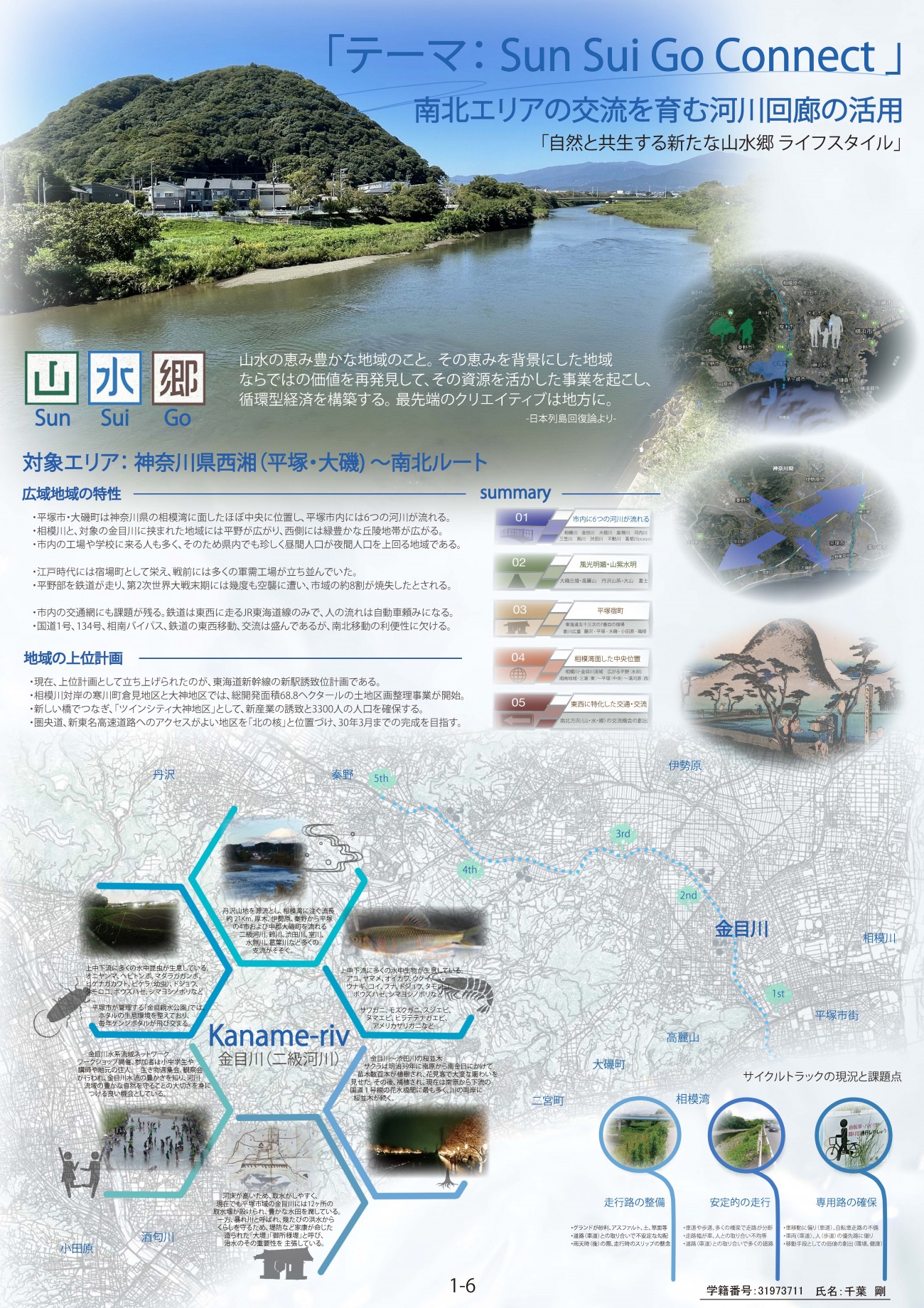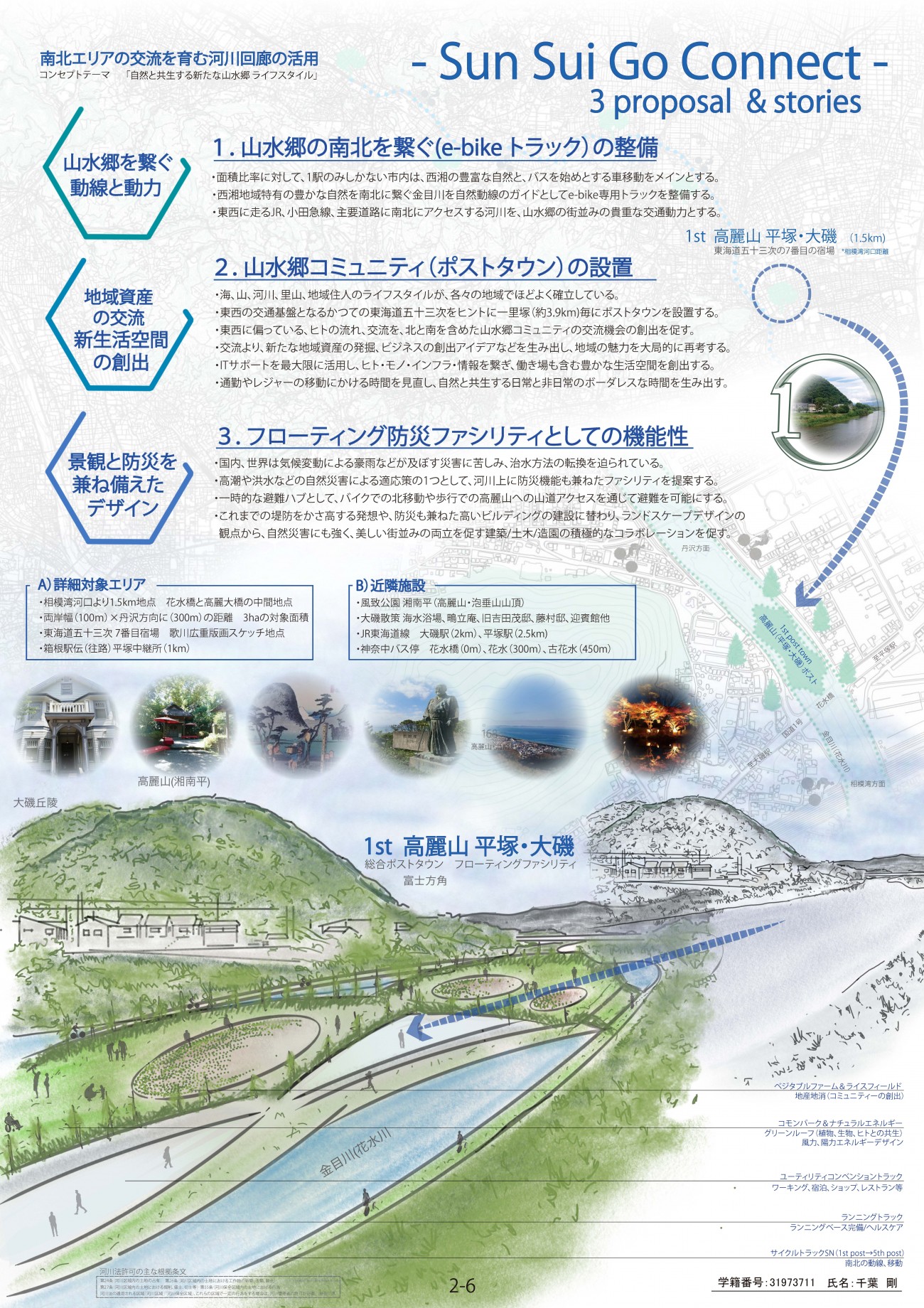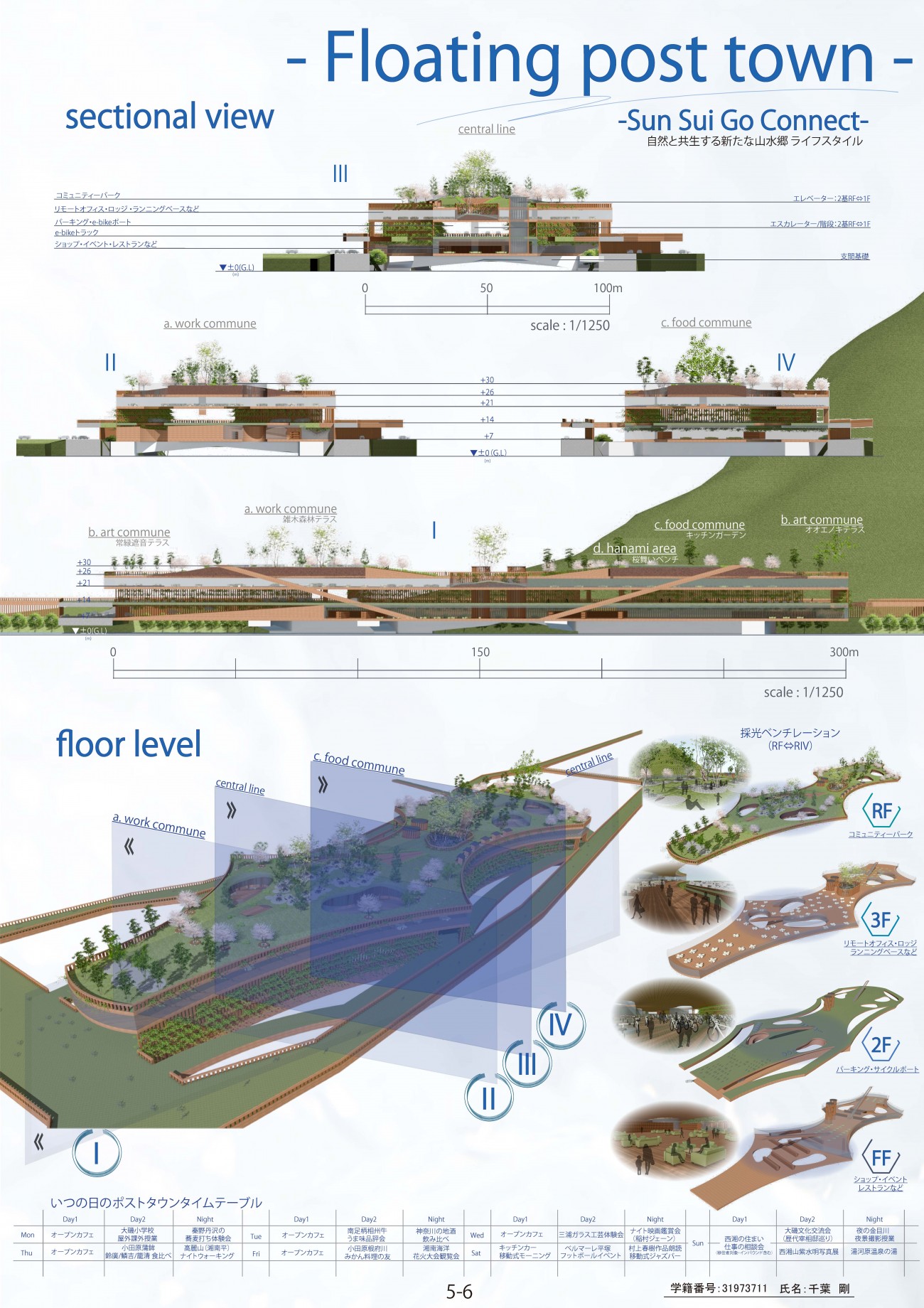 河川はすでに、山と海と郷を繋ぐ自然動線のガイドとして土地に存在し、これまでは自然を切り開いたアスファルト道路の障害な存在として橋梁を渡してきましたが、その自然動線をもっと有効的に活用できないかとの問いが自分のテーマとなりました。当然自然を取り除く工事は必然になりますが、圧倒的に新規、山・土地の造成よりも自然影響、土地権利などリスクヘッジになると考えました。これまでの都市部中心の自然を取り除いての開発でなく、取り除けない動線をガイドにして、自然に取り込まれるような地域のフォーカルポイントともなるファシリティの提案です。そこに人、モノ、情報、仕事が集まり、各地域の山水郷を繋ぐバイクトラックを整備することで、フレックスタイムも活用しながら、例えばRFのコミュニティーパークで河川のせせらぎと緑を感じながら仕事をし、1日の中で、休み時間に海で潮風を感じたり、郷中の蕎麦屋にランチに行ってみたりと気軽の移動が、これまでの郊外から都市部へ、都市部から郊外へと日常・非日常で繰り返される、莫大なエネルギーと時間を浪費する密集移動に代わる豊かさの価値の1つの選択肢であると考えました。