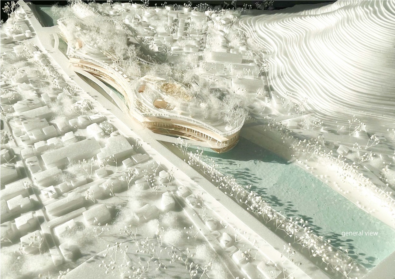 デザインコンセプトについて、採光のベンチレーションに加え、水流、河川の形状などを考慮したフォルムは、曲線R・アンシンメトリーを多く取り入れました。防災機能的には、海岸からの高潮津波の際、水流の当たりを軽減し左右に水の抵抗が逃げるように、国道1号に接するポストタウンの南側エリアを狭くデザインしています。