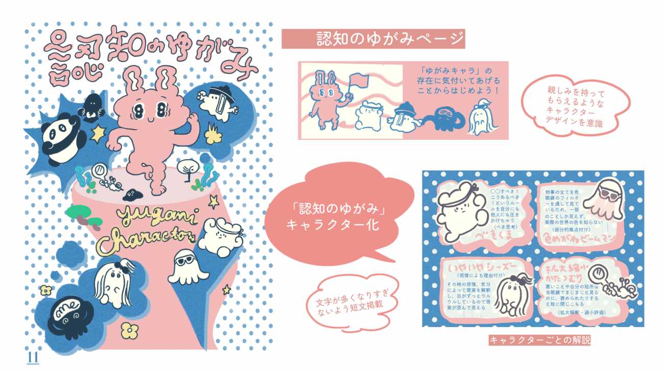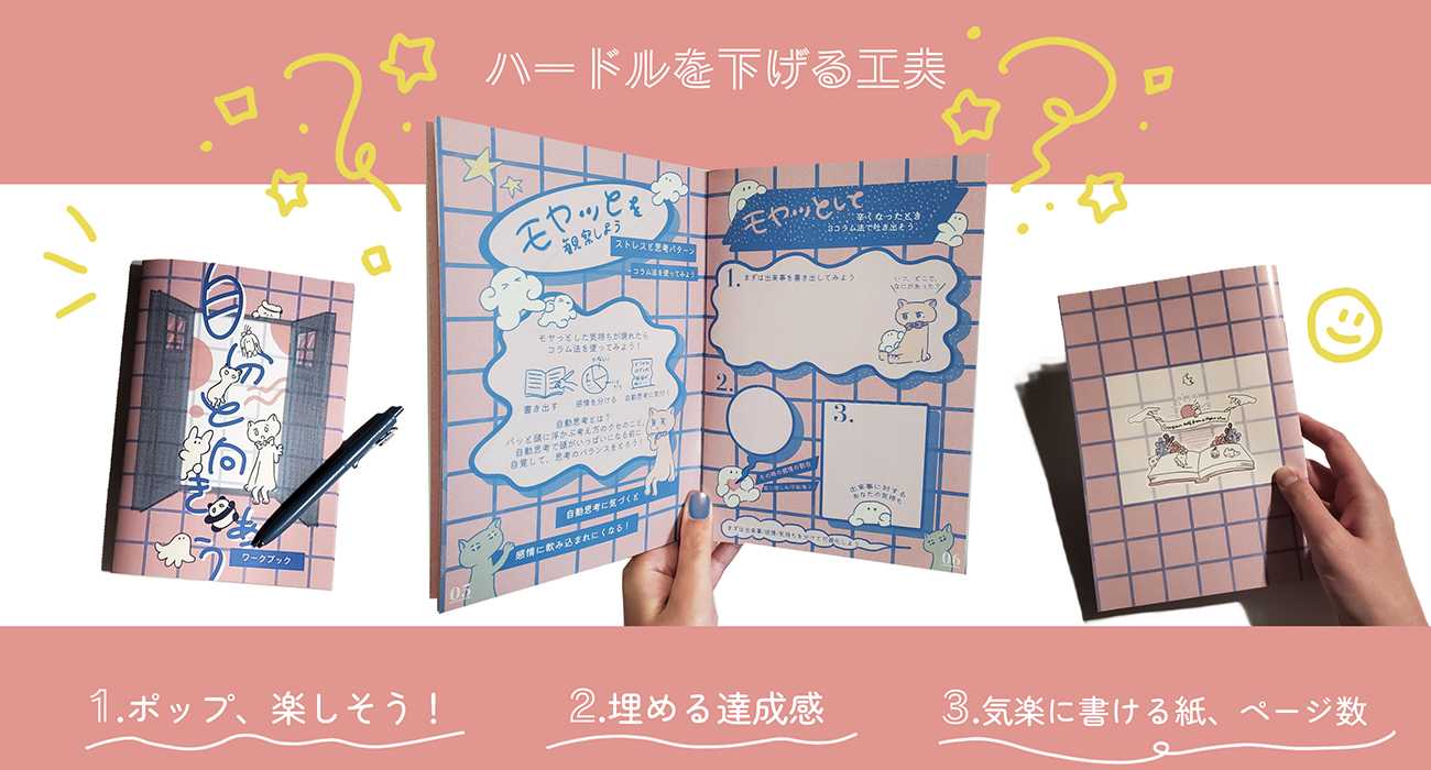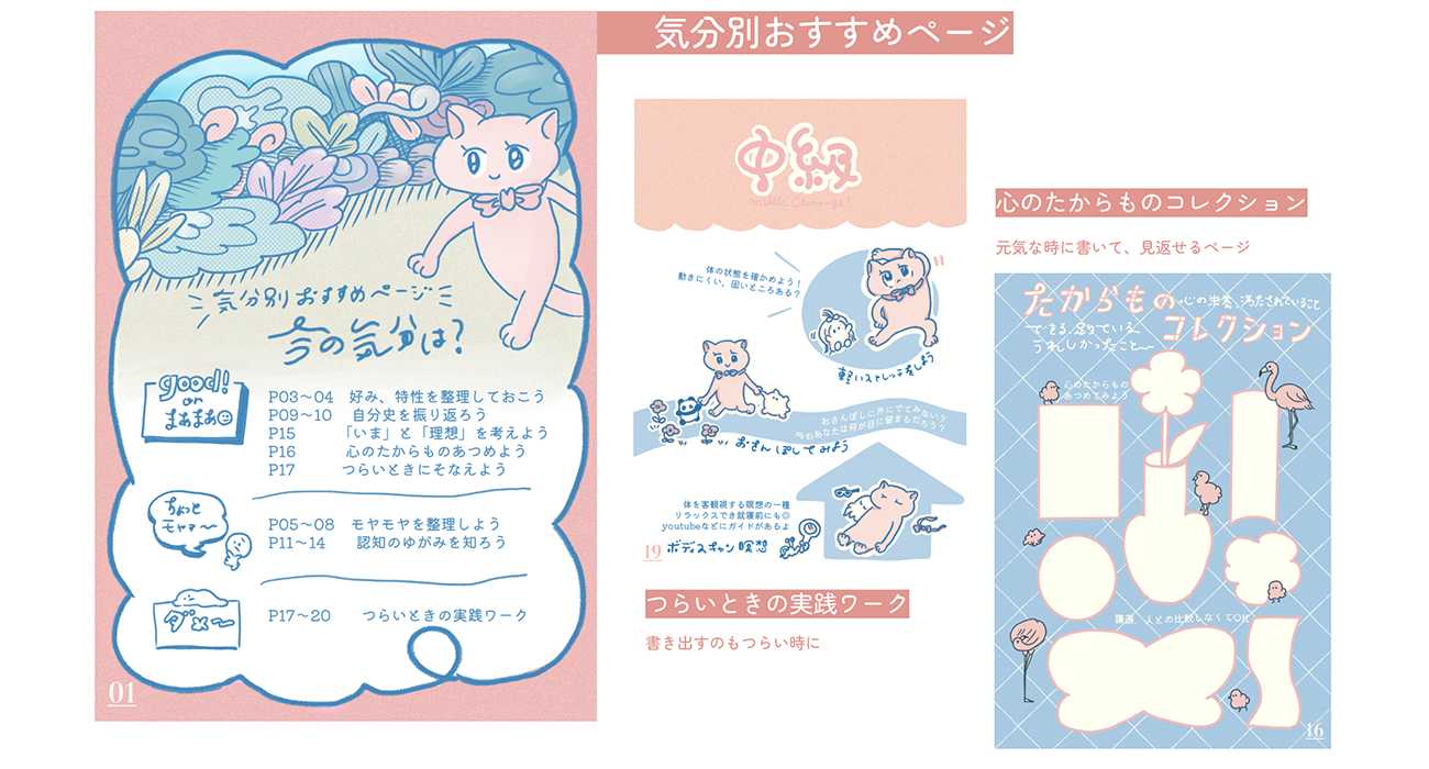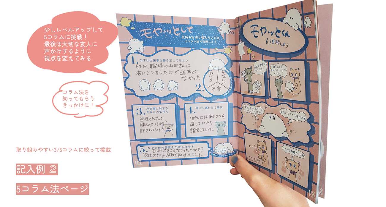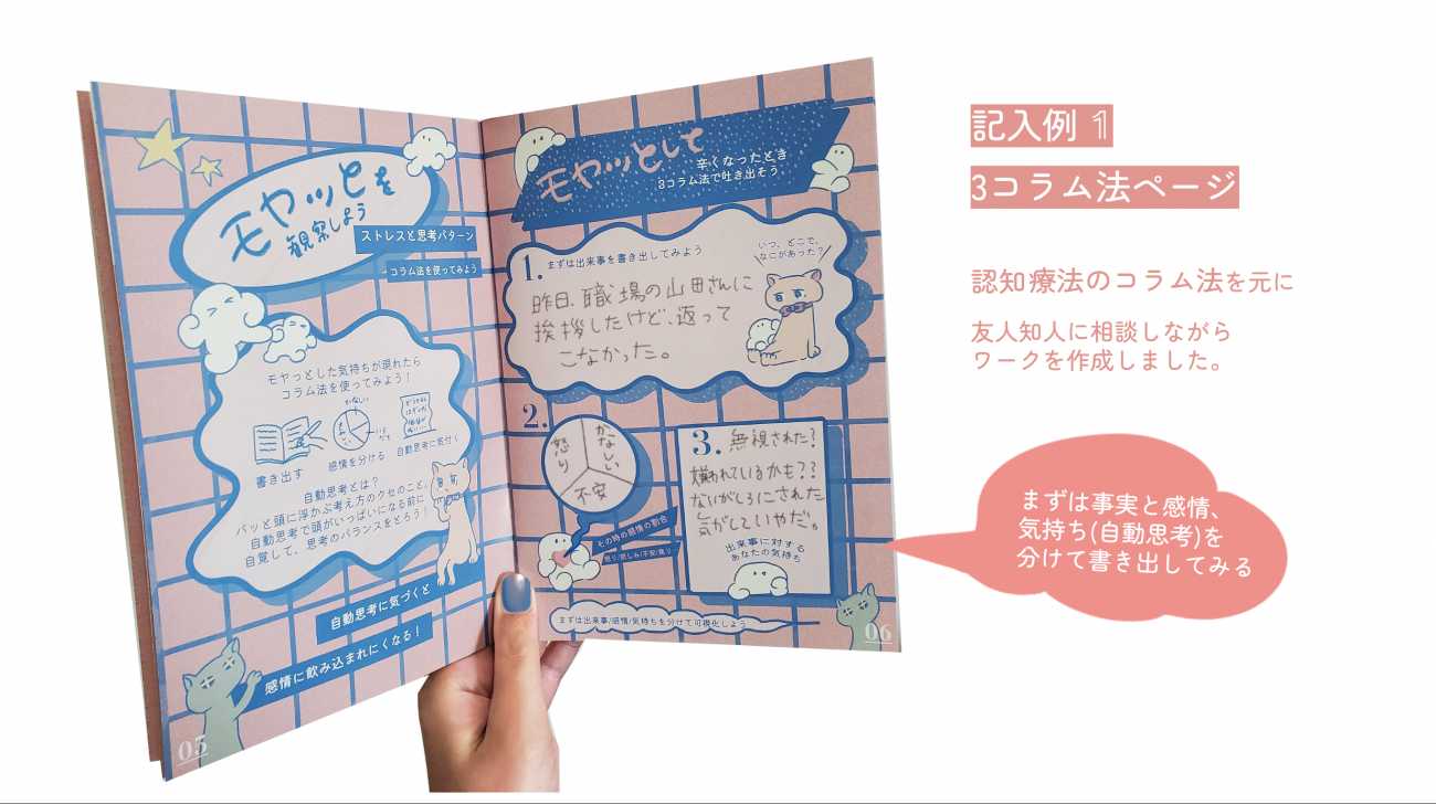 「自分と向き合う」ことが苦手な人に向けて、ワークブックを制作しました。内容は、認知療法の「コラム法」や、ストレスに対処するためのマインドフルネスの方法、「認知のゆがみ」をキャラクター化し紹介するページなどを収録しました。まずは自分を知るきっかけ、必要な対処への入口になってほしいという思いを込めました。