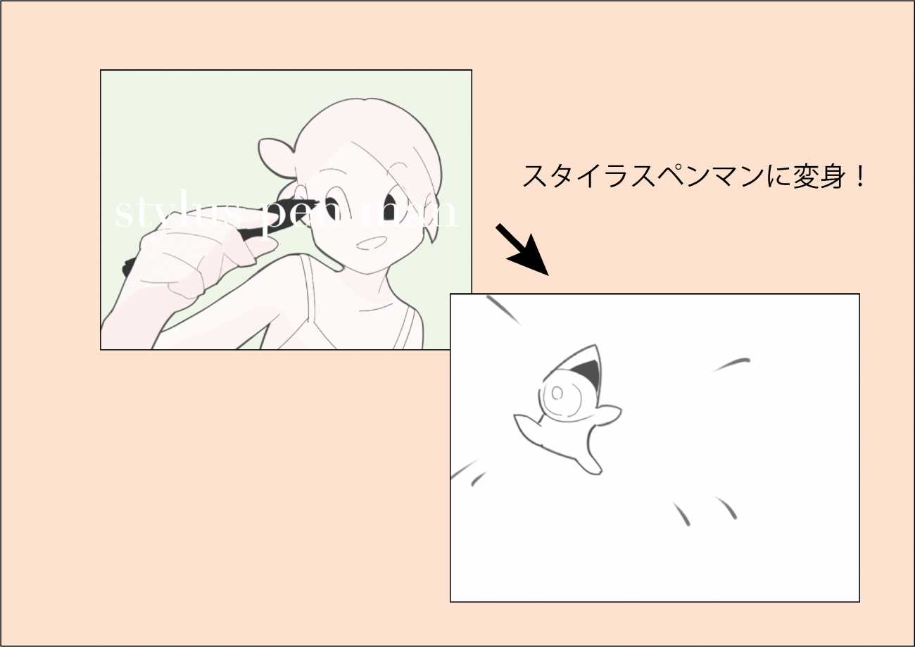 スタイラスペンを魔法少女の変身アイテムに見立てた変身バンクとなっております。変身バンクお約束のリボンが舞い包みますが、何を間違ったのかイモムシミイラ状態に巻かれてしまいます。もがき悶えて包帯リボンを突き破って「スタイラスペンマン」が孵化する、といったストーリーです。