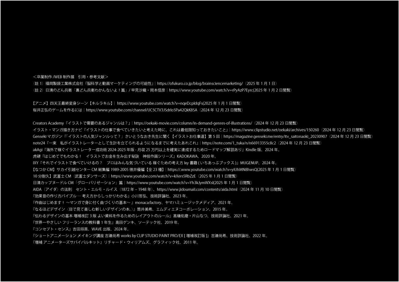 草案では、自身がこれまで制作したイラストレーションを作品に組み込み、「ポートフォリオ動画」のようなものを想定していましたが、力及ばす半端になってしまったため、アニメーションに割り切りました。