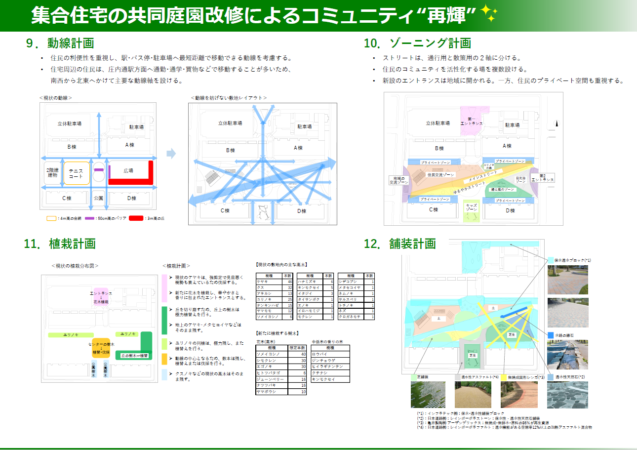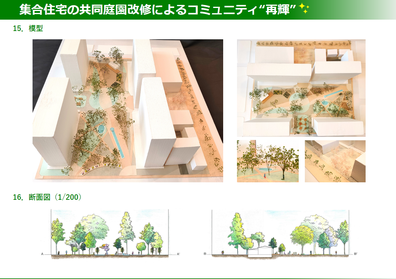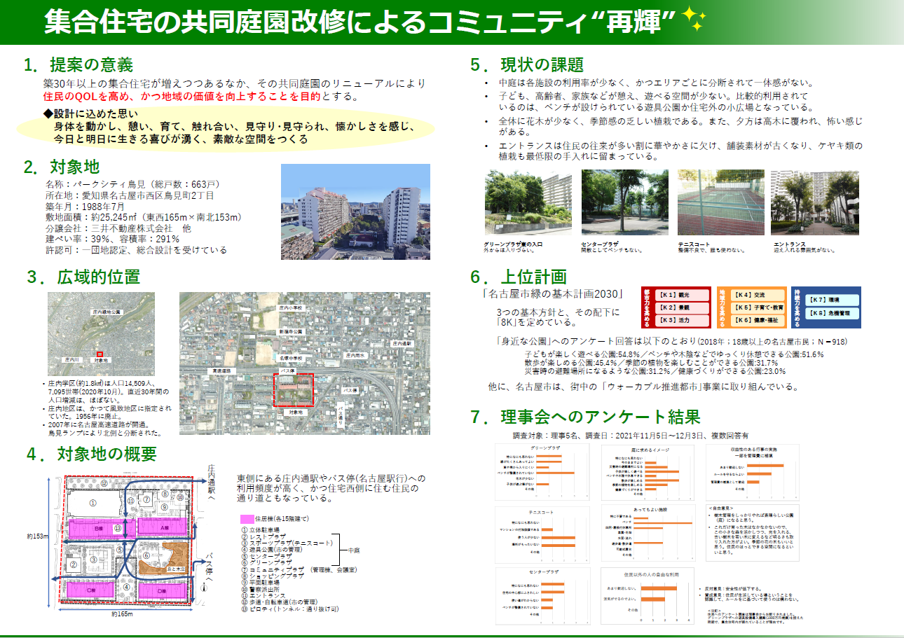 今回の提案は、そのような集合住宅の共同庭園を改修することで、住民のQOLを高め、かつ地域の価値を向上することを目的としています。