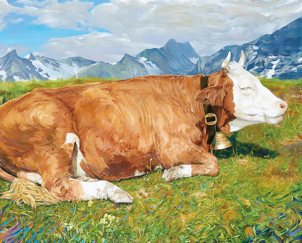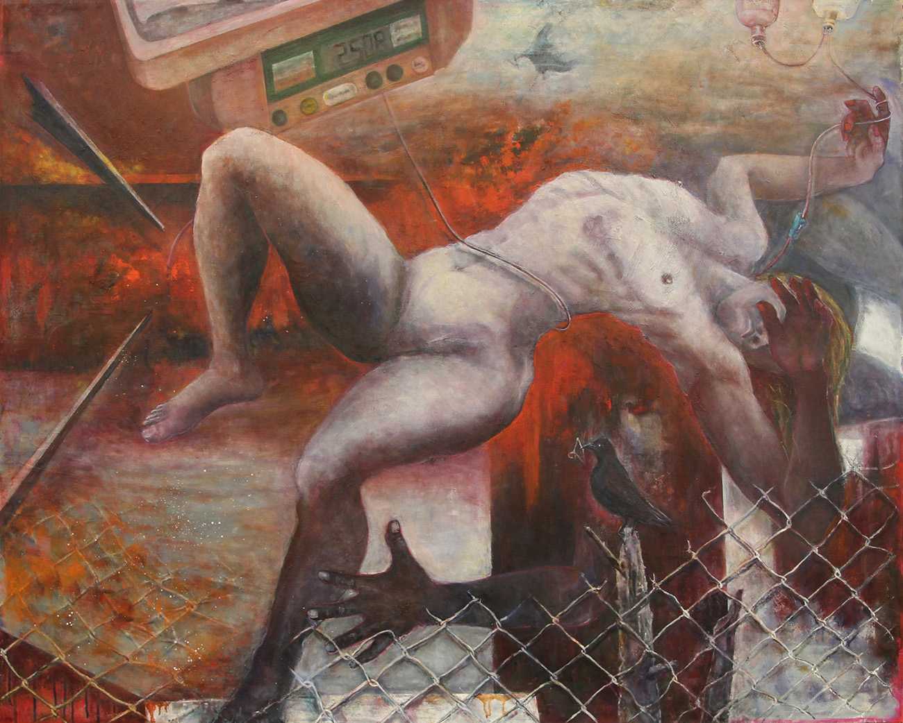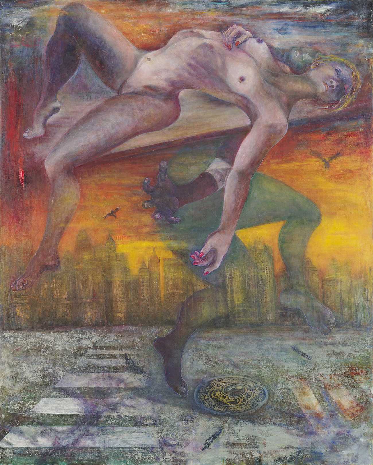 背景に近代的な街並みと横断歩道、地元のマンホールを配置し、日常の生活に潜む人間の葛藤を表現した。不吉さや不安感を強調するためにカラスを描き空間の広がりを表現した。モデルを描いていると自分と一心同体だと感じる事がある。感情表現を抑えると人間の闇の表現が出ないのか。男と女が堕ちていく表現はどうか。人体の切り方,入れ方はどうか。表現の重さや硬さを取り除くために構図の工夫や造形的表現を取り入れたいと思っているが課題が残る。