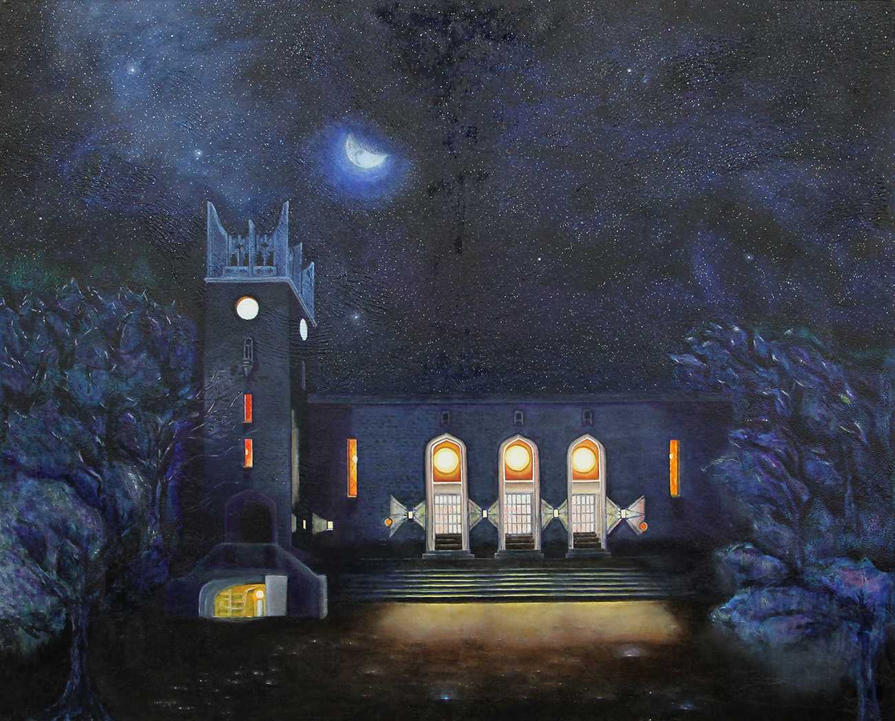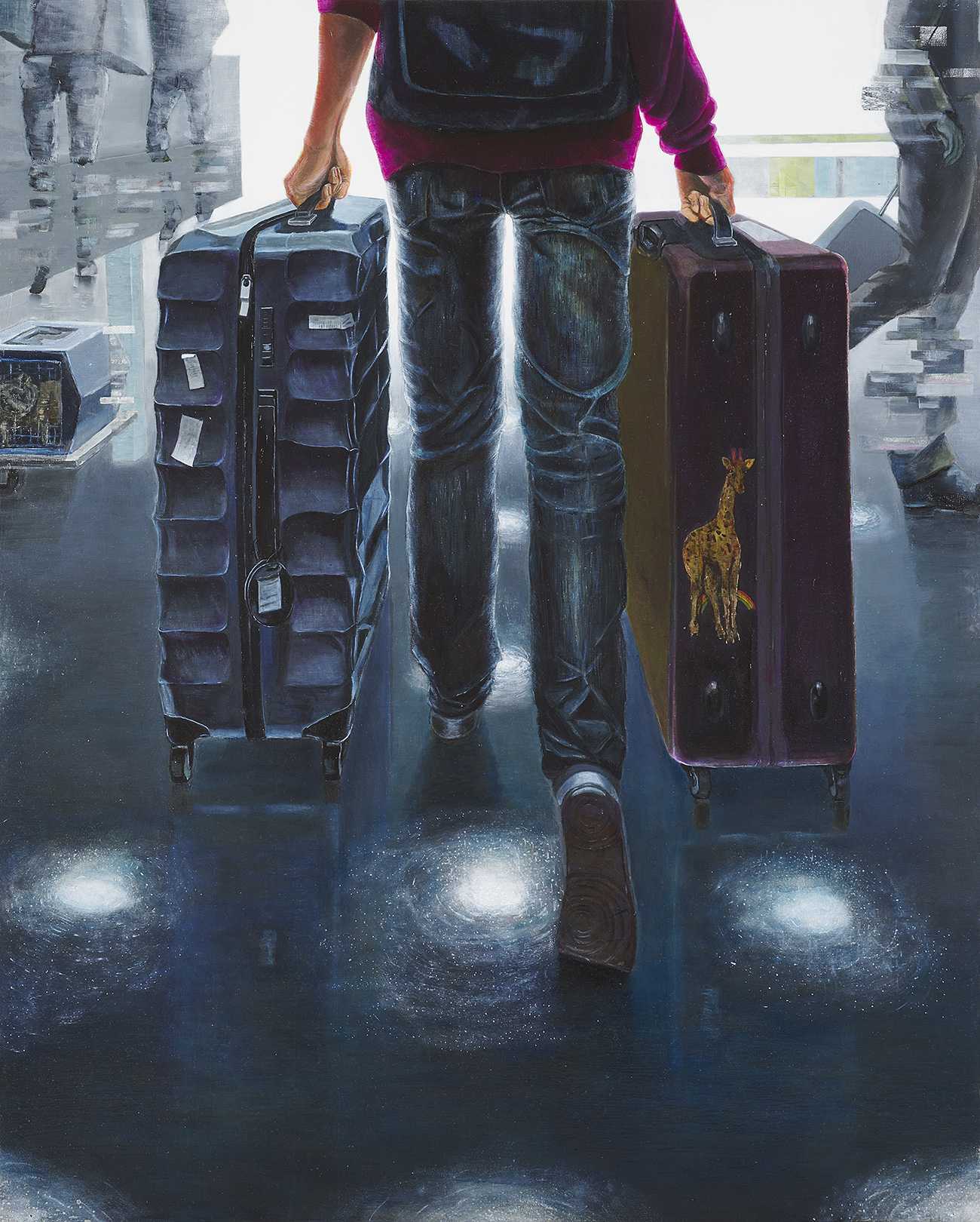 数年後の自分の姿を想像し、健康で自由に行動できることが理想の姿ではないかと考えた。一人旅をすることが好きで、これからも、そのような時間を過ごせることを願いながら、この作品を制作した。また、未来には予測不可能な未来にも想いを馳せる機会となった。多くのブルー系の絵具を使い、透明絵具を駆使して床面を描いた。ブルー系の色が大好きで制作が楽しかった。今まで聴く機会が少なかったロックミュージックを聴きながら自分を鼓舞し、この作品を完成に至った。私にとって初めての100号作品となった。