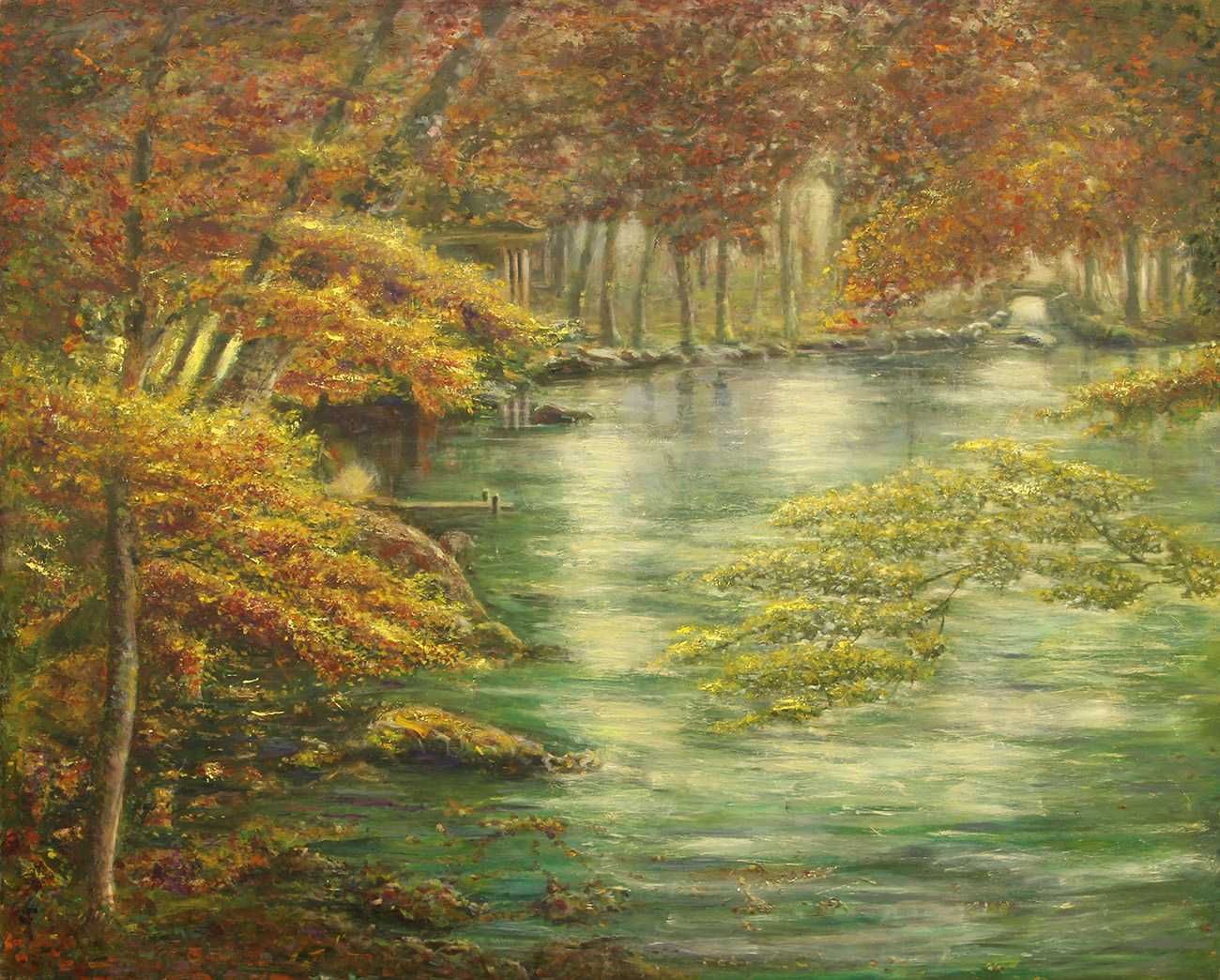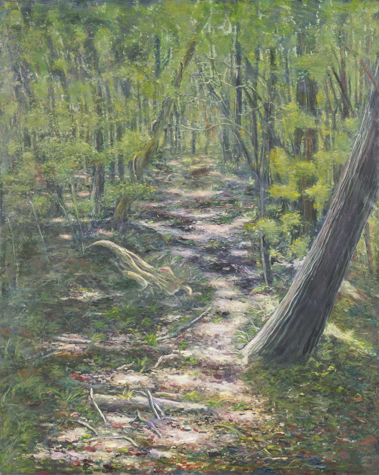 近所の森を散策して見つけた自然の森の魅力、清らかな美しさと静けさの中にある饒舌さを表現した。多様な緑とそれを支える大地の色は木漏れ日に輝いて複雑に変化する。その美しさを描いた。また深みのある画面や遠近感を見せるため、筆のタッチを変えグレージングを重ねた。