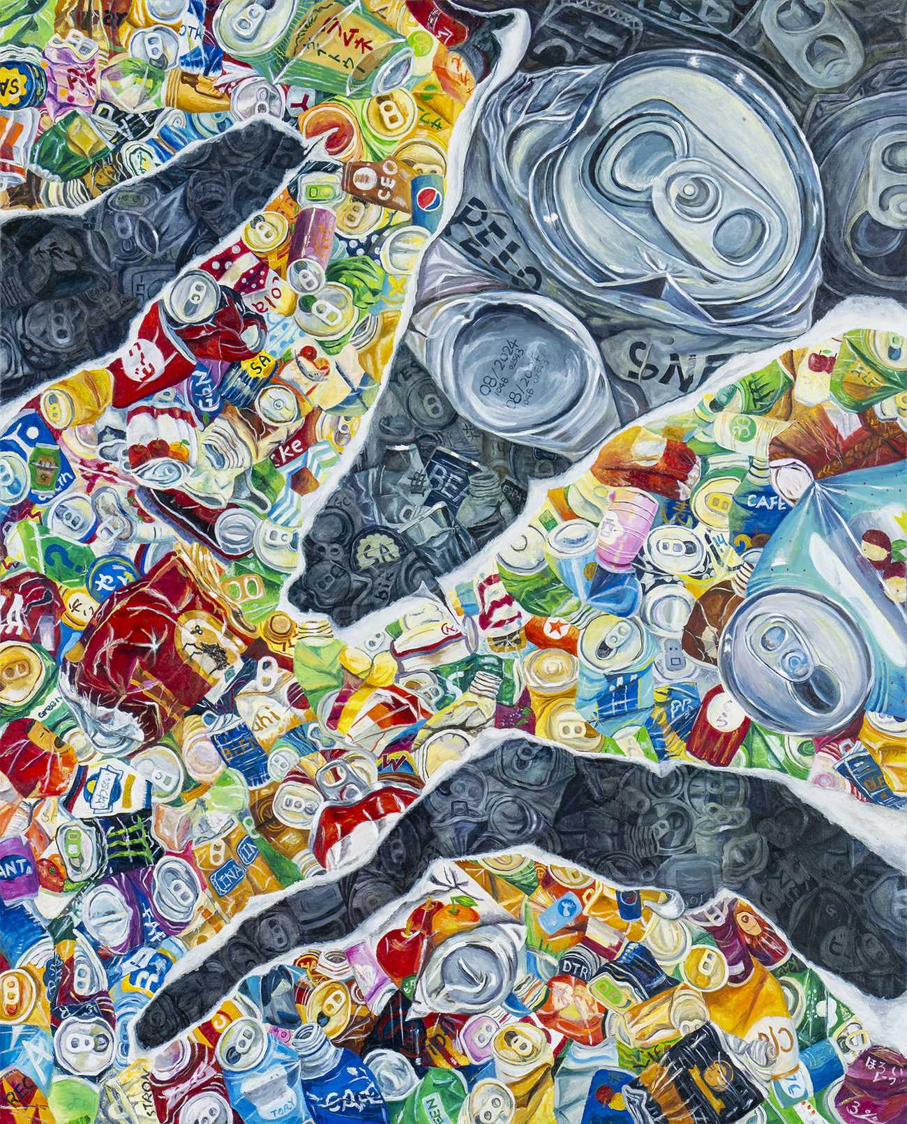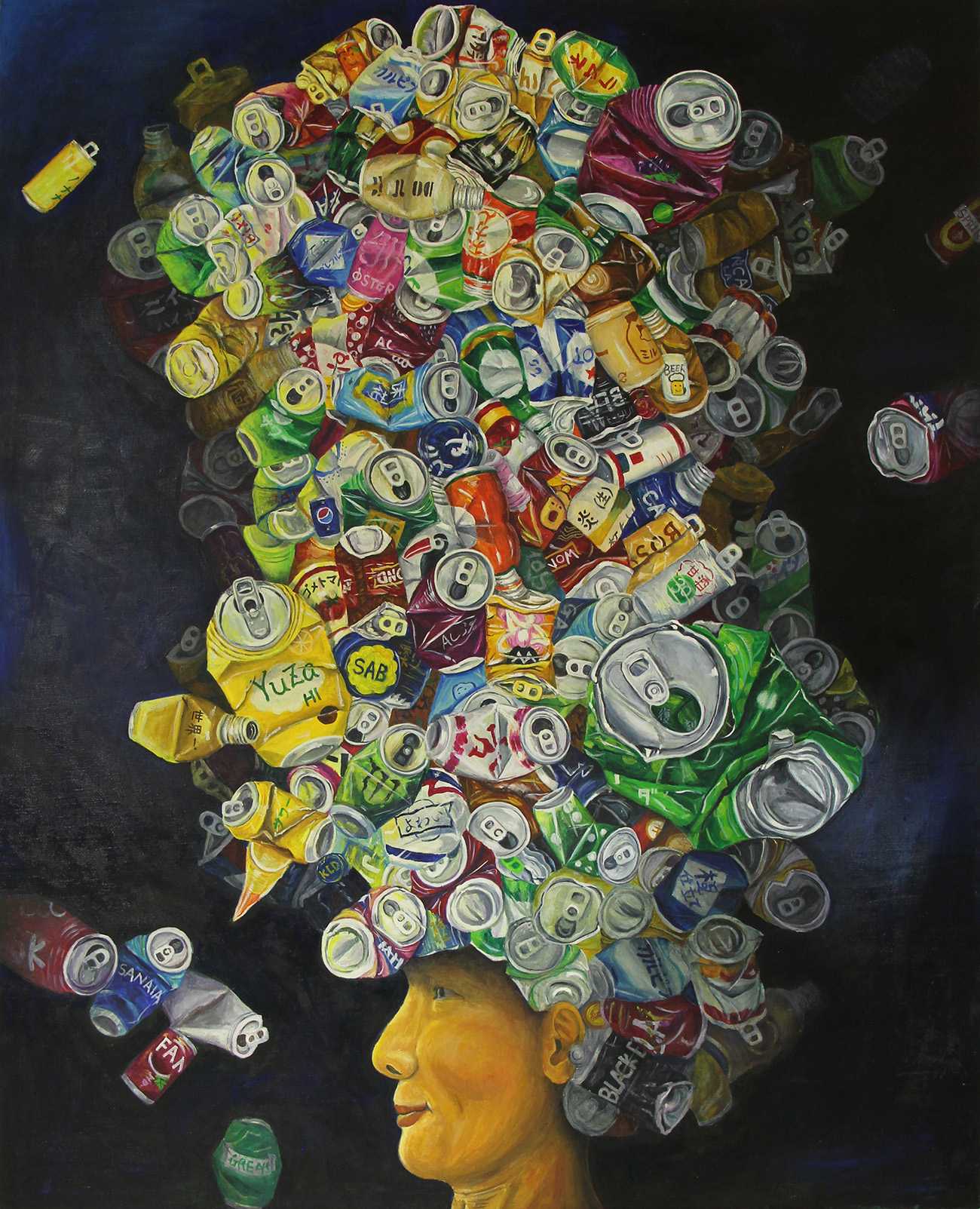 街で転がっている潰れた空き缶を見ると、その存在に逞しさを感じる。踏まれても存在している姿は、現代社会の縮図である。販売時は綺麗に並んでいるが、飲み終わるとゴミとなる。だが生まれ変わる為に力強く存在するその姿は、市井の私達と重なって見える。それを踏まえ、空き缶群で心の層を表現した。表層は煌びやかに見えても、それをめくると中には色々な感情が隠れている。偽りの表層を突破し自分自身を生きることを表現した。