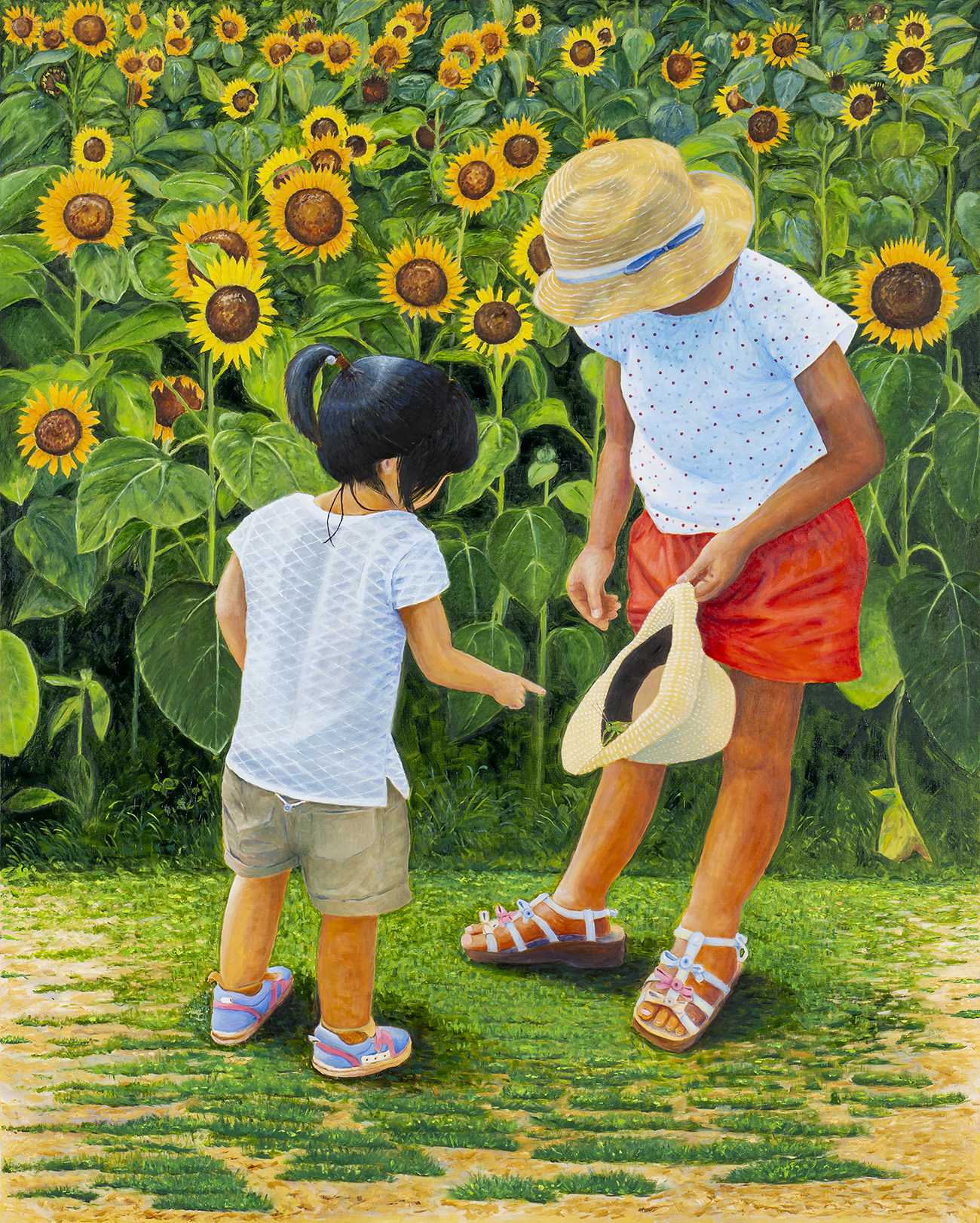 淡路島「花さじき公園」の満開のヒマワリ畑で、孫が夢中になってキリギリスを捕まえた。小さな孫は虫が怖くてさわることが出来ない。お姉ちゃんに言われて、触ろうとするが、怖いので離れて指をさすのが精一杯である。一年後は、バッタを捕まえるようになった。色々な経験をしながら育つ孫を見るのは楽しみだ。孫が大人になっても、一緒に過ごした楽しい夏が、絵の中に残っている。
