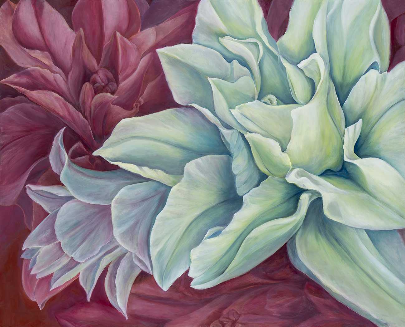 11月半ばに偶然訪れた花屋で出会った八重のユリに強く心を惹かれた。花びらから湧き上がる色彩や形状は、自分自身に語りかけてくるように感じられ、その感動を作品に落とし込むことを目指した。