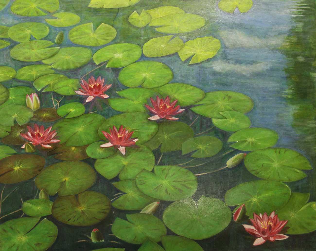 初夏の晴天の日、太陽に向かって、赤と白の睡蓮の花が咲いている。水辺の周りには木々が生い茂り、それらが水面に映り込んでいる。差し込む光や、そよ風が小さな波を起こして、水面の美しさを際立たせ、同時に凛と咲く睡蓮の花の静かさを感じさせて、見ている人の心まで洗って気持ちを落ち着かせてくれる。私は、この水辺の睡蓮の景色を、風や光と影など自然がかもし出す空気感を感じて描いた。