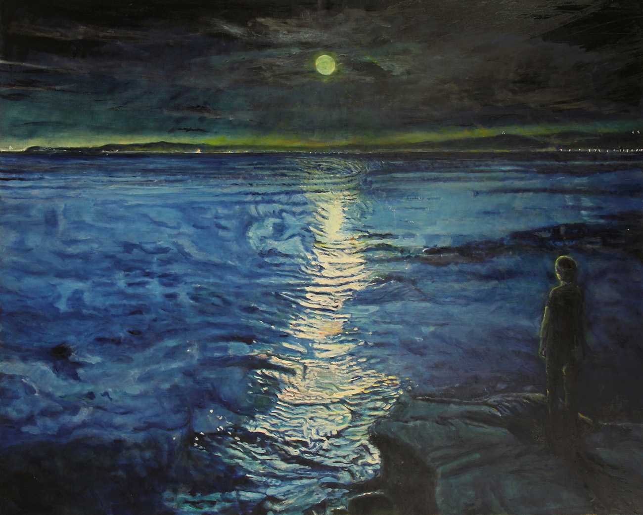 部屋で月を見上げる若者の姿は、安全な場所にいて現実に直面していないことを象徴しています。本棚は知識や頭でっかちさを、床に散らばる物は内面の混乱を表しています。しかし、月明かりに目を向けることで、自分がちっぽけな存在であると感じ視野が広がった気がしました。まずは一歩進んでみようという気持ちになりました。
