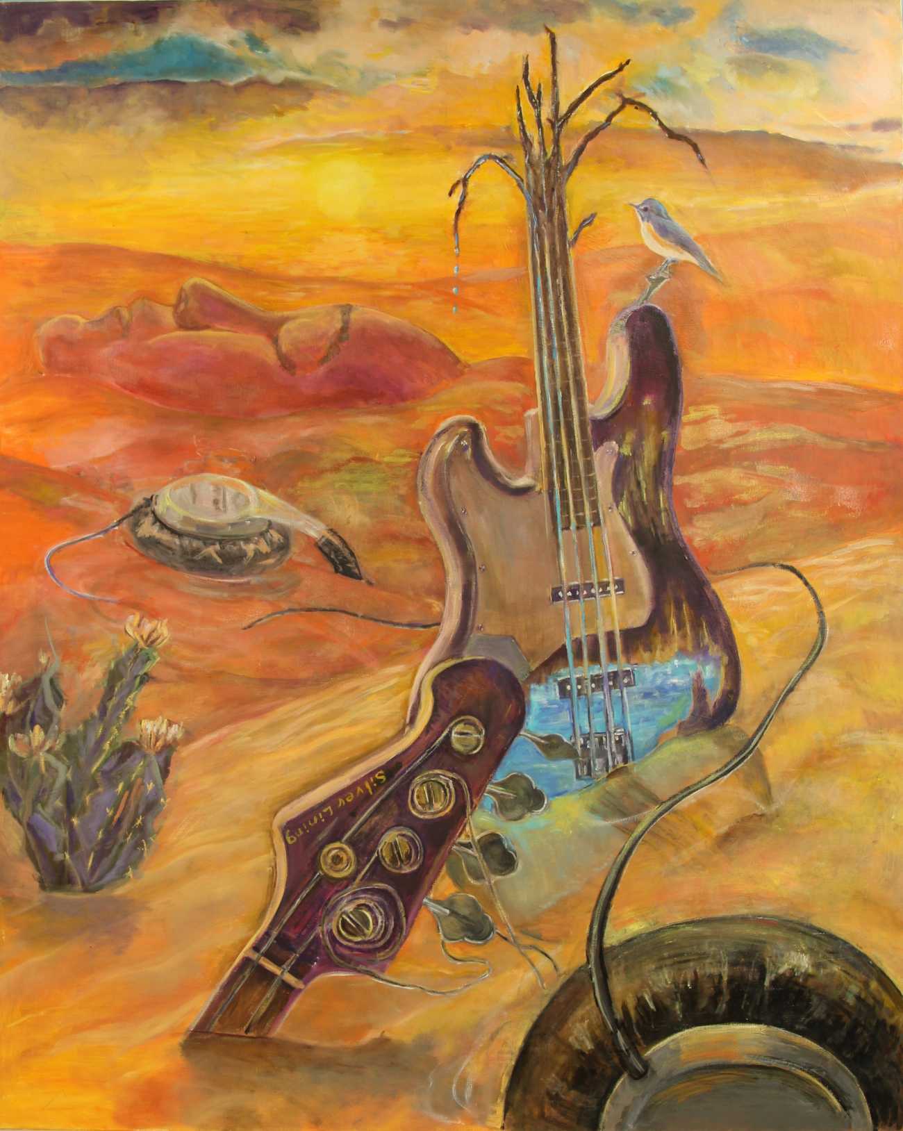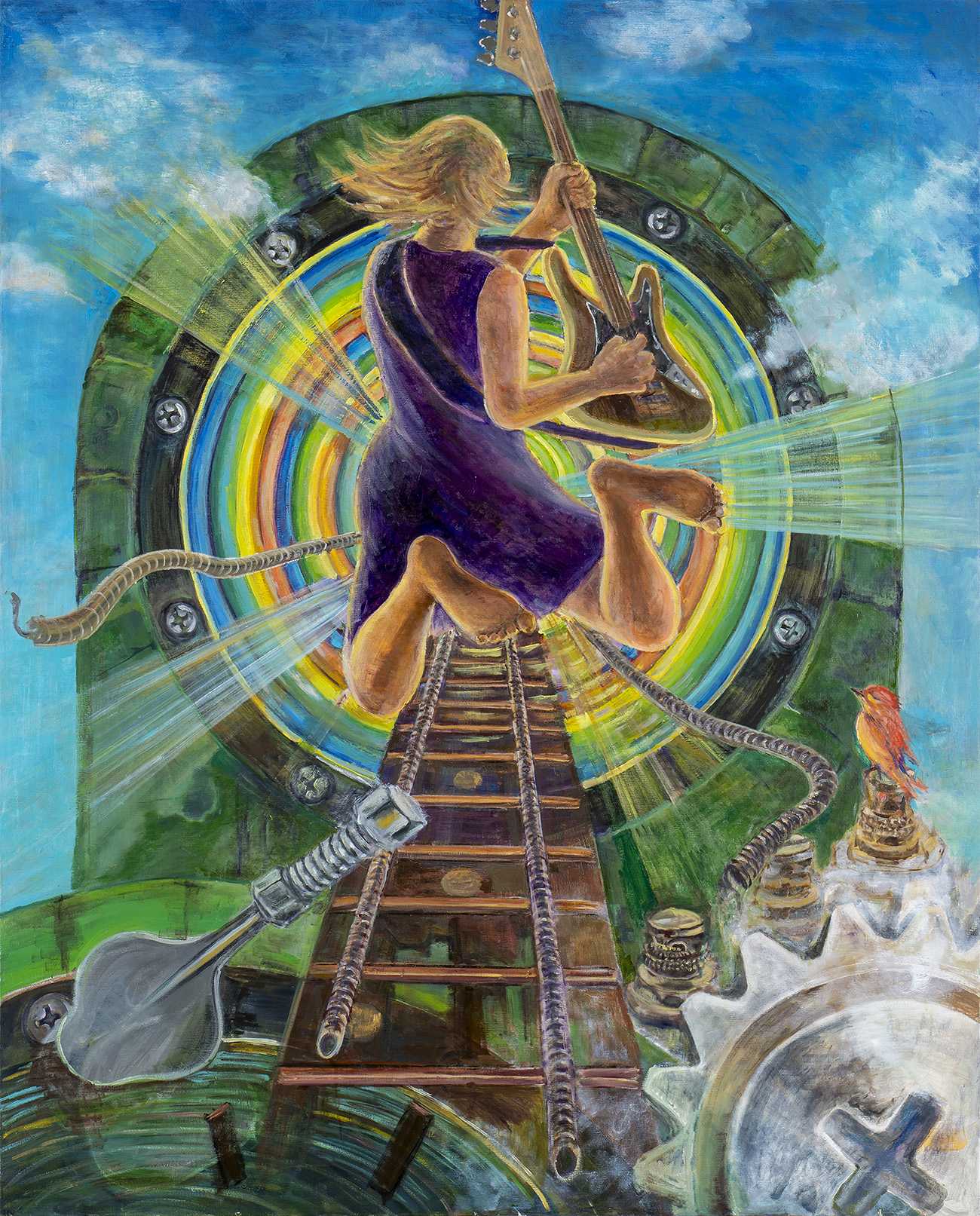 ベースギターは、音色だけでなく形もなかなか魅力的である。特に音程を調整するペグは花びらのように可愛らしい。人生で初めてベースギターを描き、楽器のパーツと向き合った。トンネルで、暗くて長い闇を、トンネルから差し込む光で希望を表現しようと思った。画面から爆音が飛び出して、思わず後ずさりするような躍動的な絵を目指した。突然物事が動き始める。