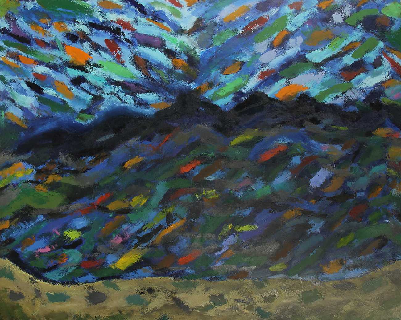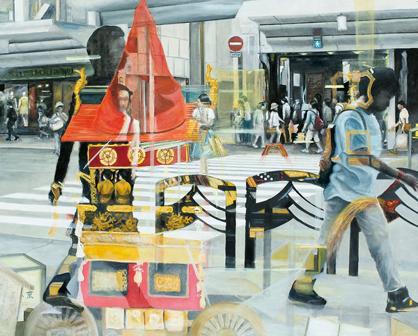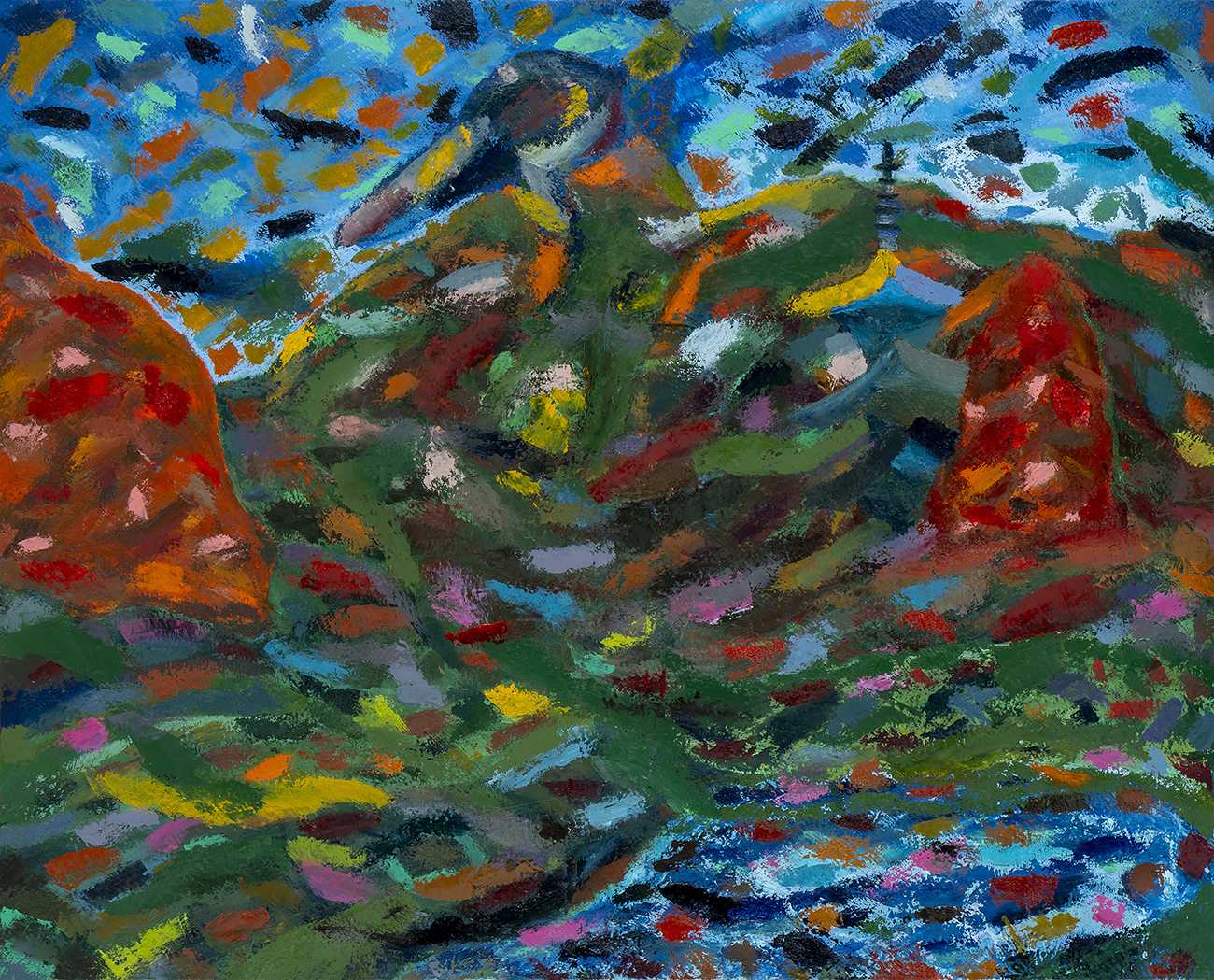 山口市の香山公園には、瑠璃光寺がある。秋には、山々の赤、黄、オレンジをバックに、五重塔が一段と美しくその姿を表す。空、風、豊かな自然、これらの光景を表現したいと思った。祭りのようにそれぞれが華やいで見えた。特に燃えるように紅葉したあの木が私の心をとらえた。初めは、風景を具象的に描いてみたが、なかなか納得のいくものにならなかった。緑、赤、青に対して、補色のピンク、オレンジ、藍色を使い、躍動感のある絵になるよう半抽象画に挑戦した。