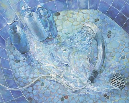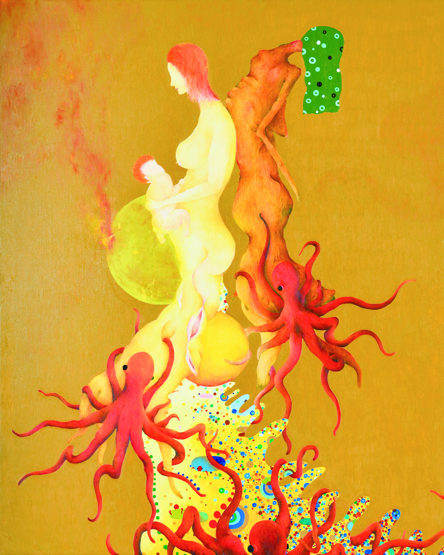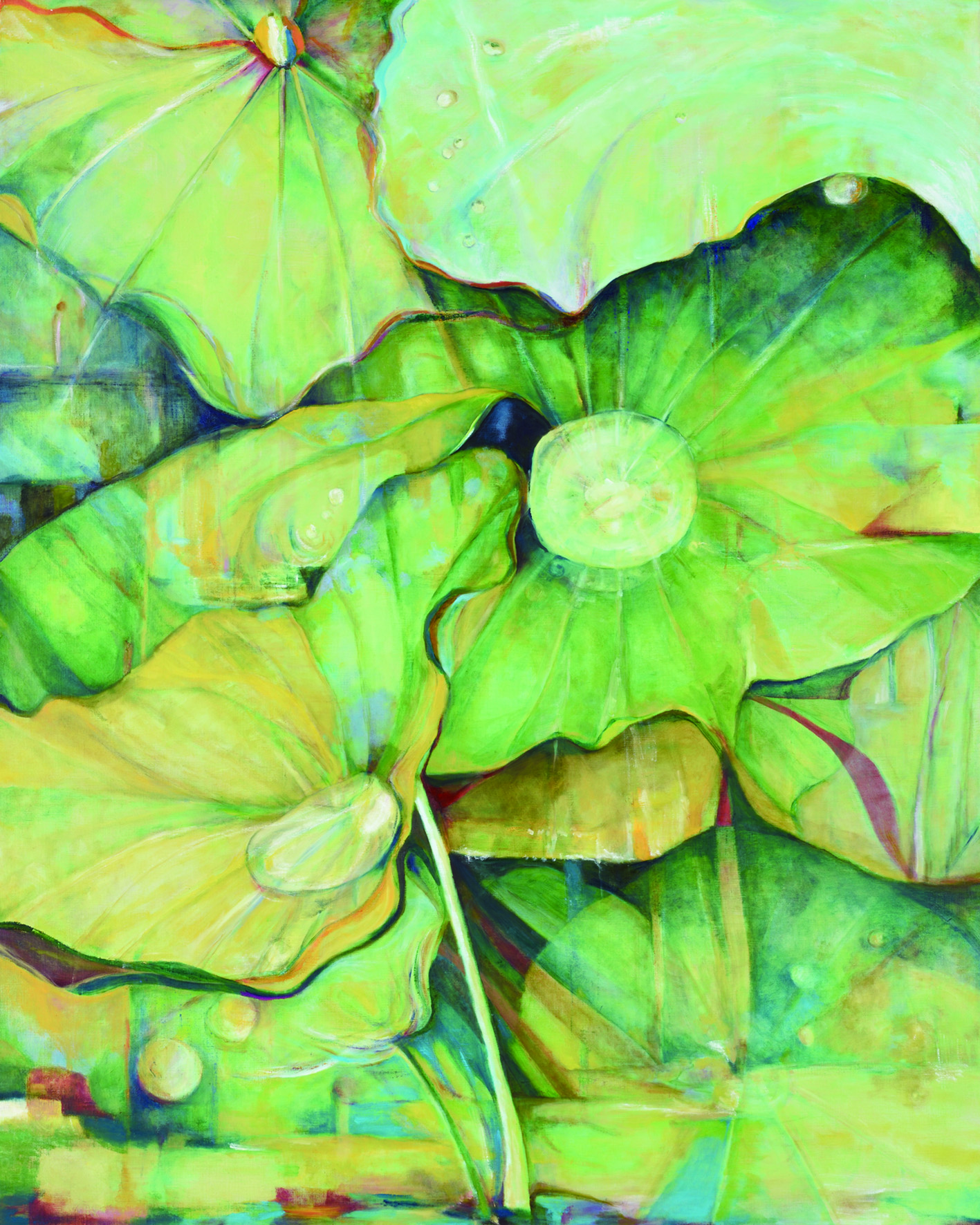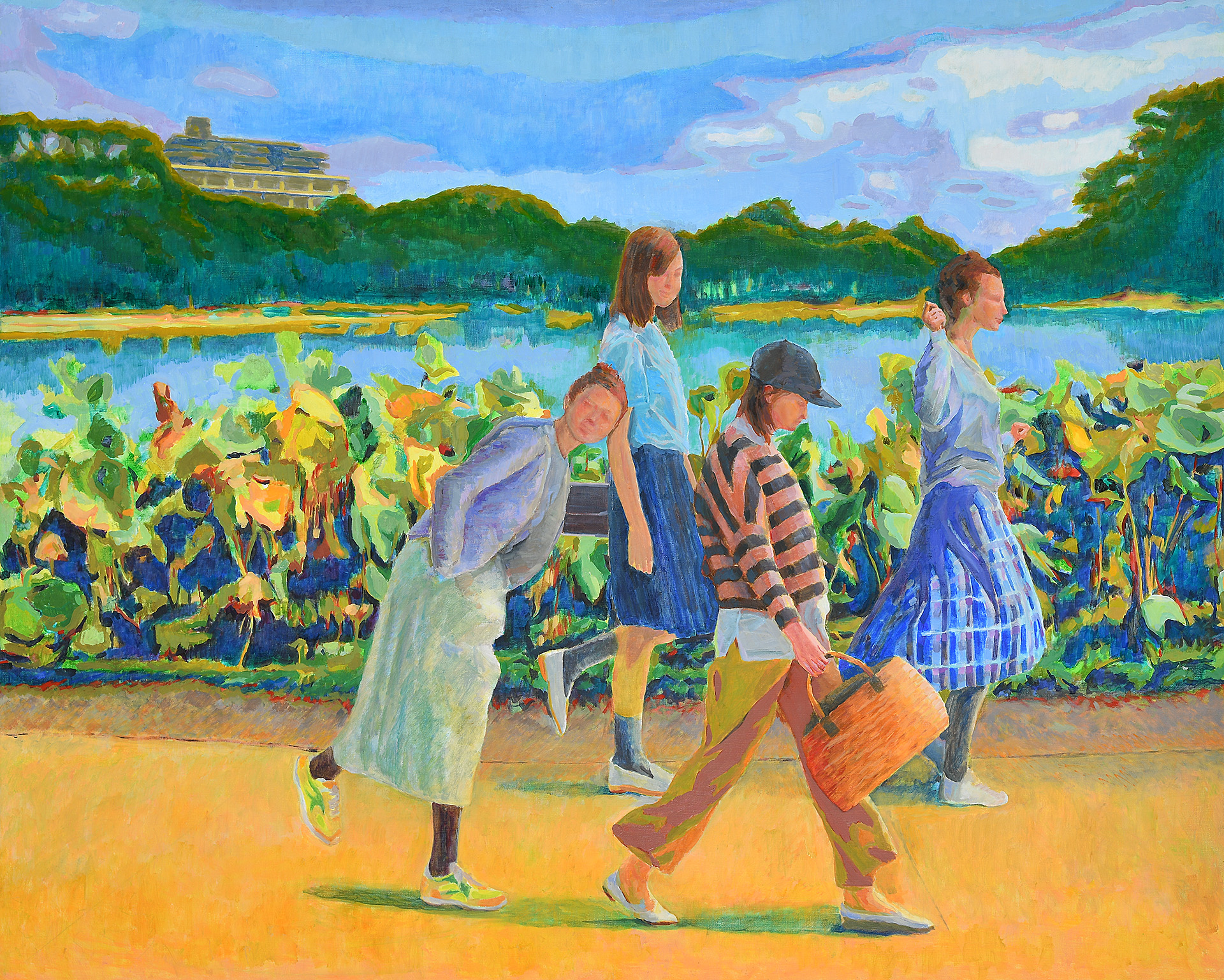 山口市の香山公園には、瑠璃光寺がある。秋には、山々の赤、黄、オレンジをバックに、五重塔が一段と美しくその姿を表す。空、風、豊かな自然、これらの光景を表現したいと思った。祭りのようにそれぞれが華やいで見えた。特に燃えるように紅葉したあの木が私の心をとらえた。初めは、風景を具象的に描いてみたが、なかなか納得のいくものにならなかった。緑、赤、青に対して、補色のピンク、オレンジ、藍色を使い、躍動感のある絵になるよう半抽象画に挑戦した。