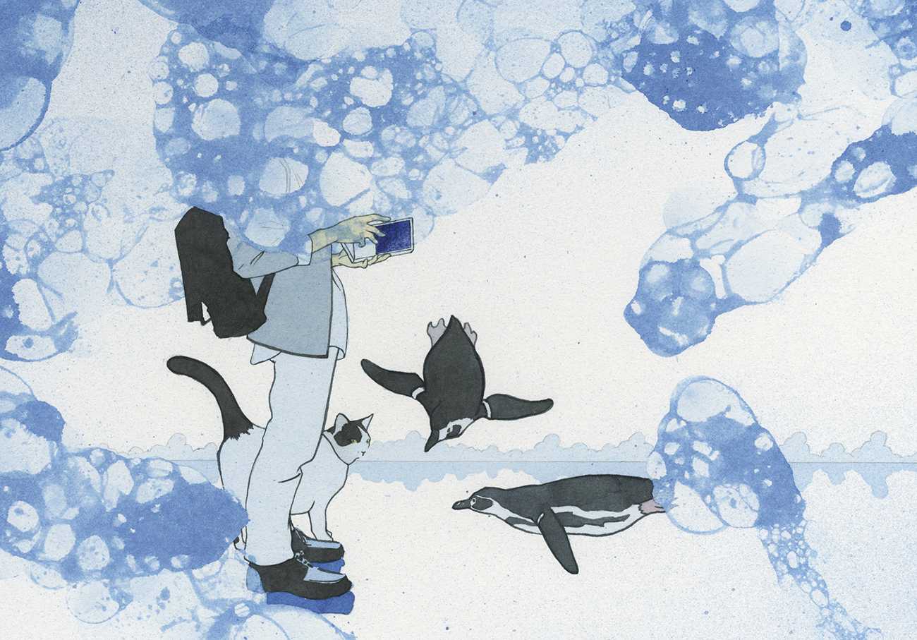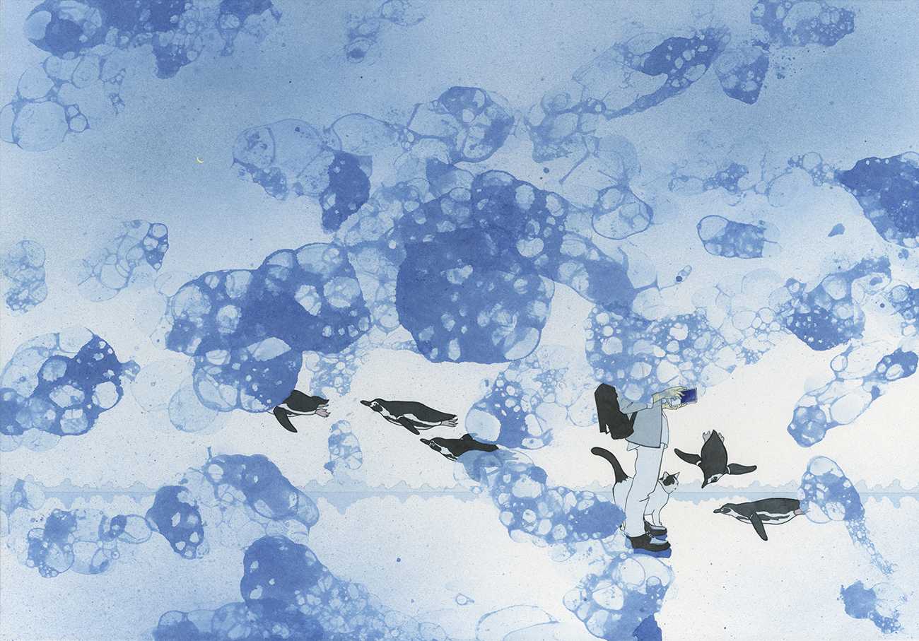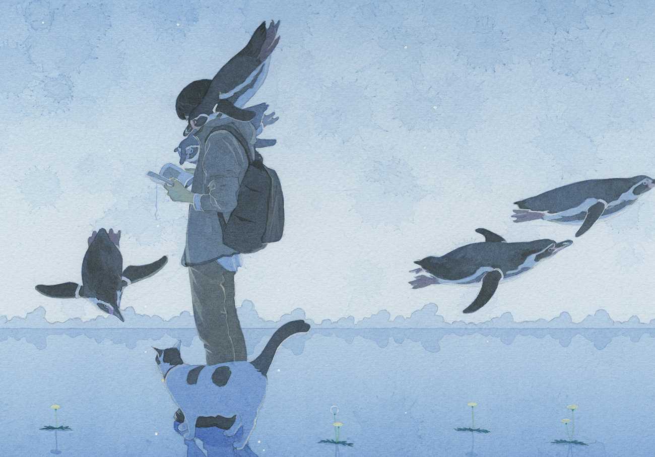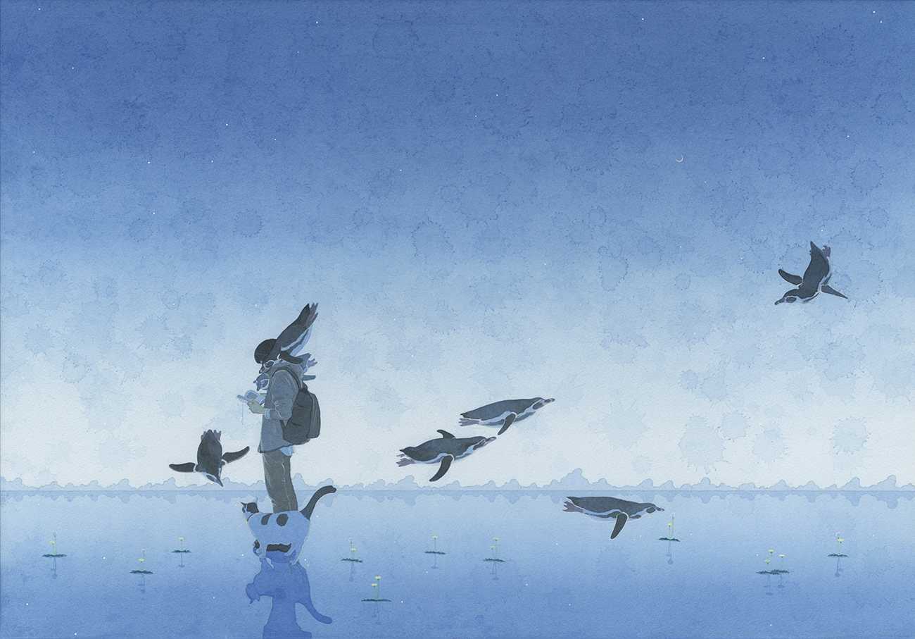 ペンギンと本を読む男の子と猫を描きました。
