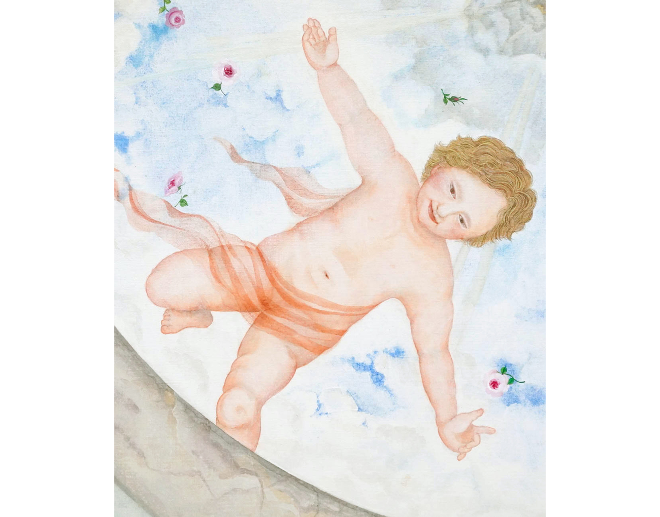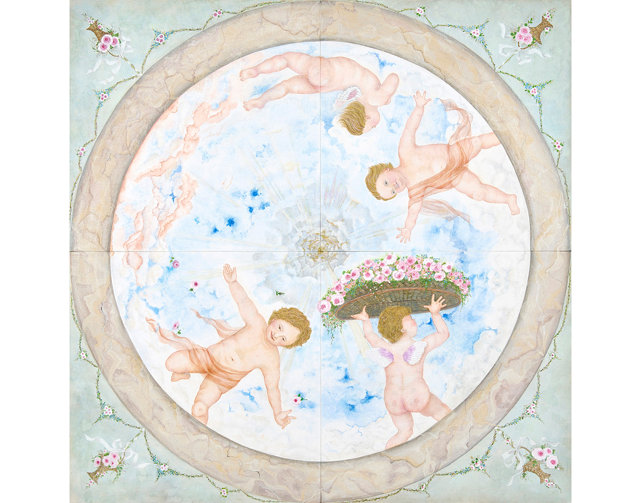 麻布/岩絵具, 水干絵具, 墨, 膠, 金泥, 銀泥