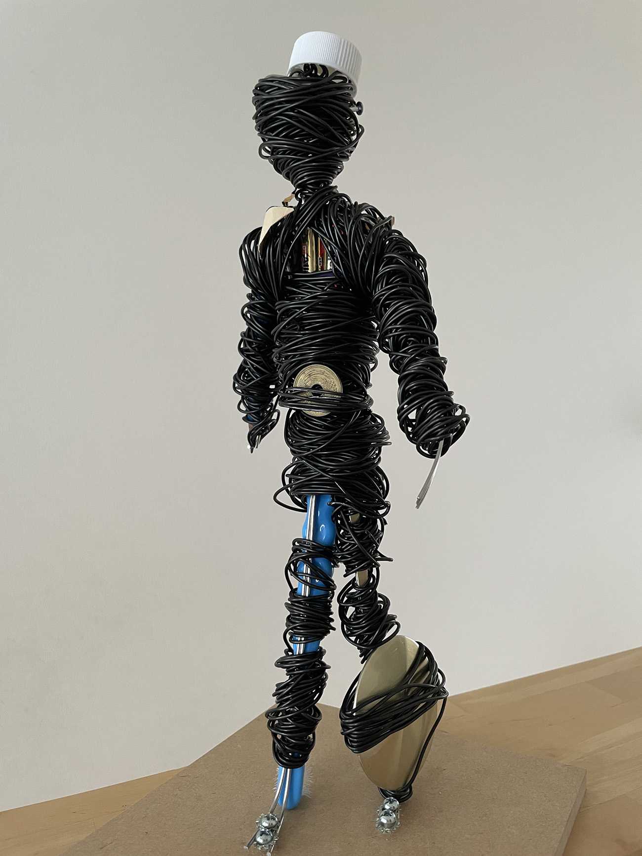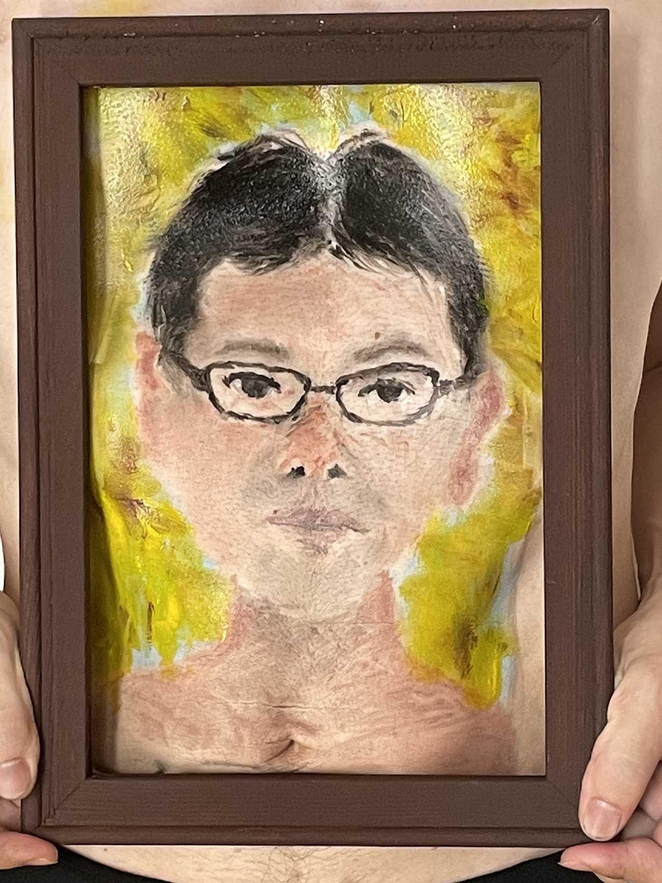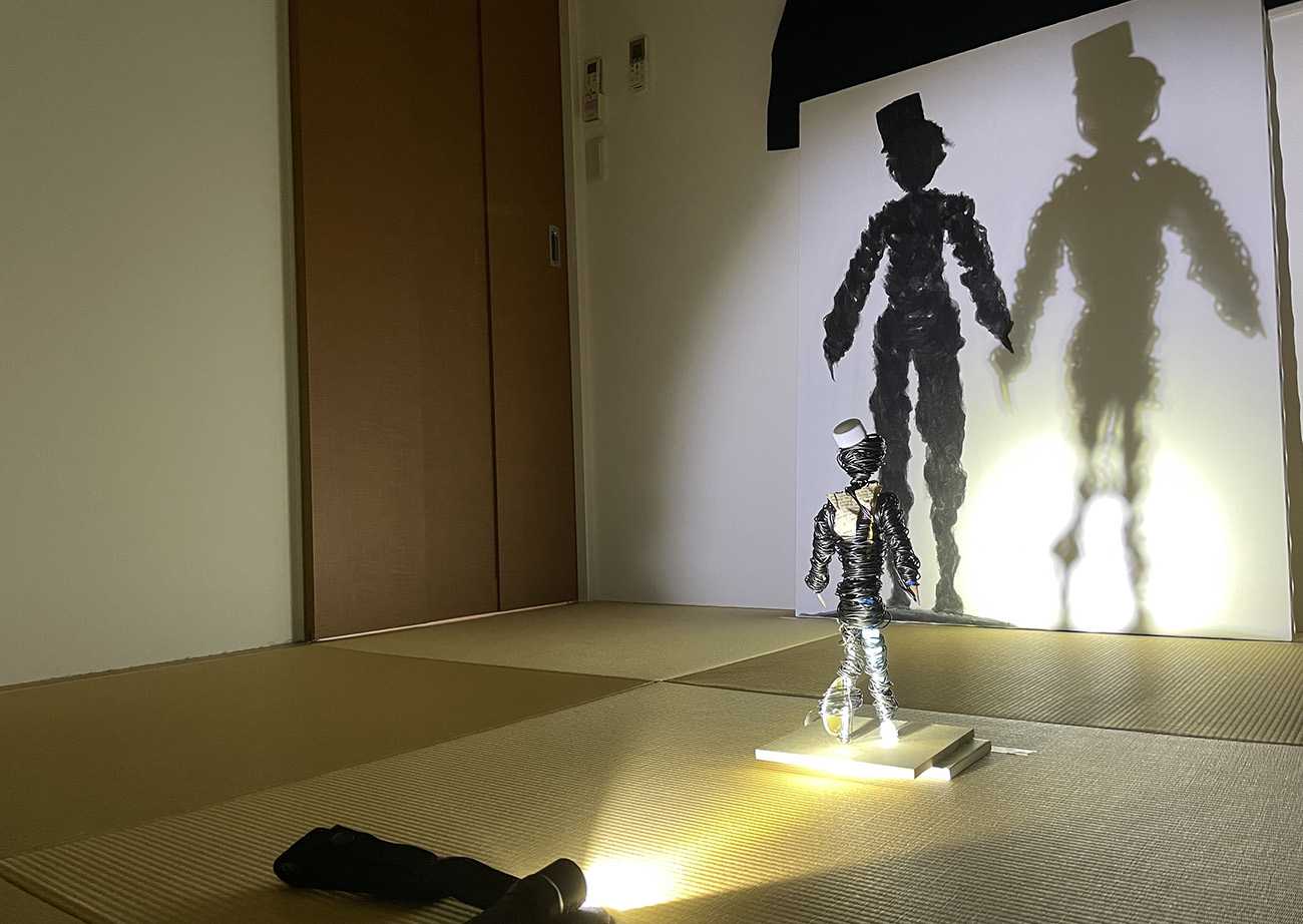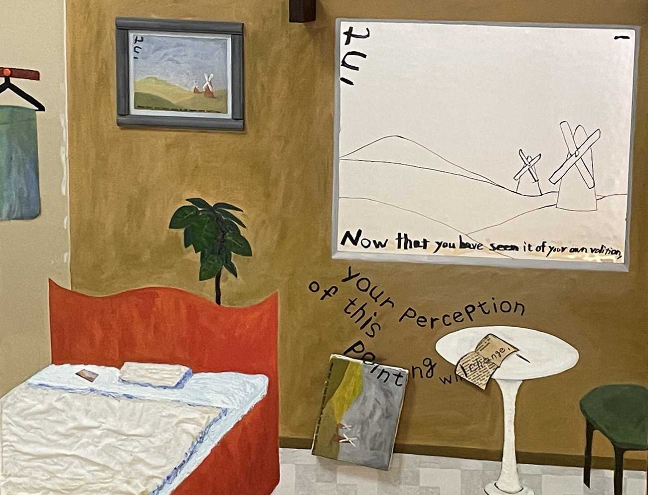 生成AIでは表現できない絵画表現は何であるか?というコンセプトのひとつに、鑑賞者の行動と認識によって作品の意味や解釈が変わる表現が挙げられます。この作品は、鑑賞者が青色のカーテンを開くか開かないかによって作品を捉える視点が変わり、鑑賞者ごとに多様な解釈が生まれるという制作意図があります。これは、データをもとに画一的な回答を生成するAIに対し、問いや観察、思考を求めた「考える芸術」といわれるコンセプチャルアートの概念のなかに、人間独自のアイデアが含まれていると考えます。