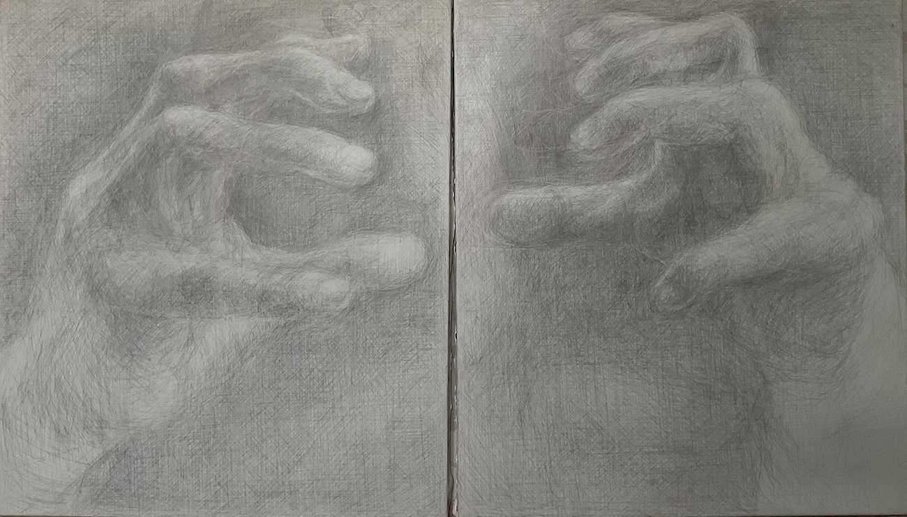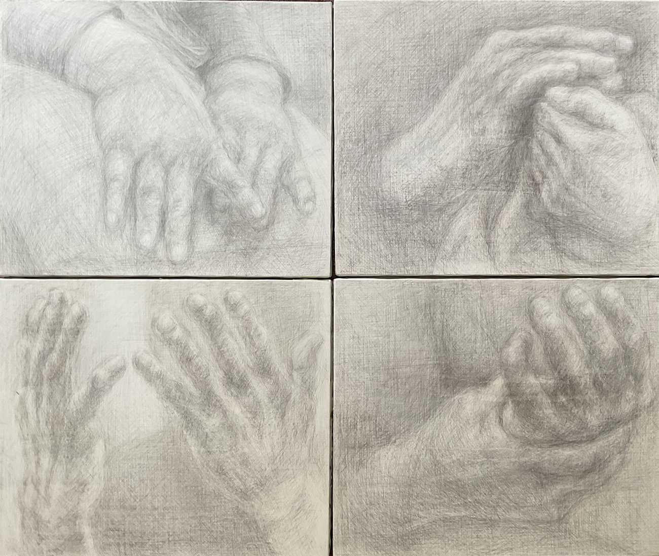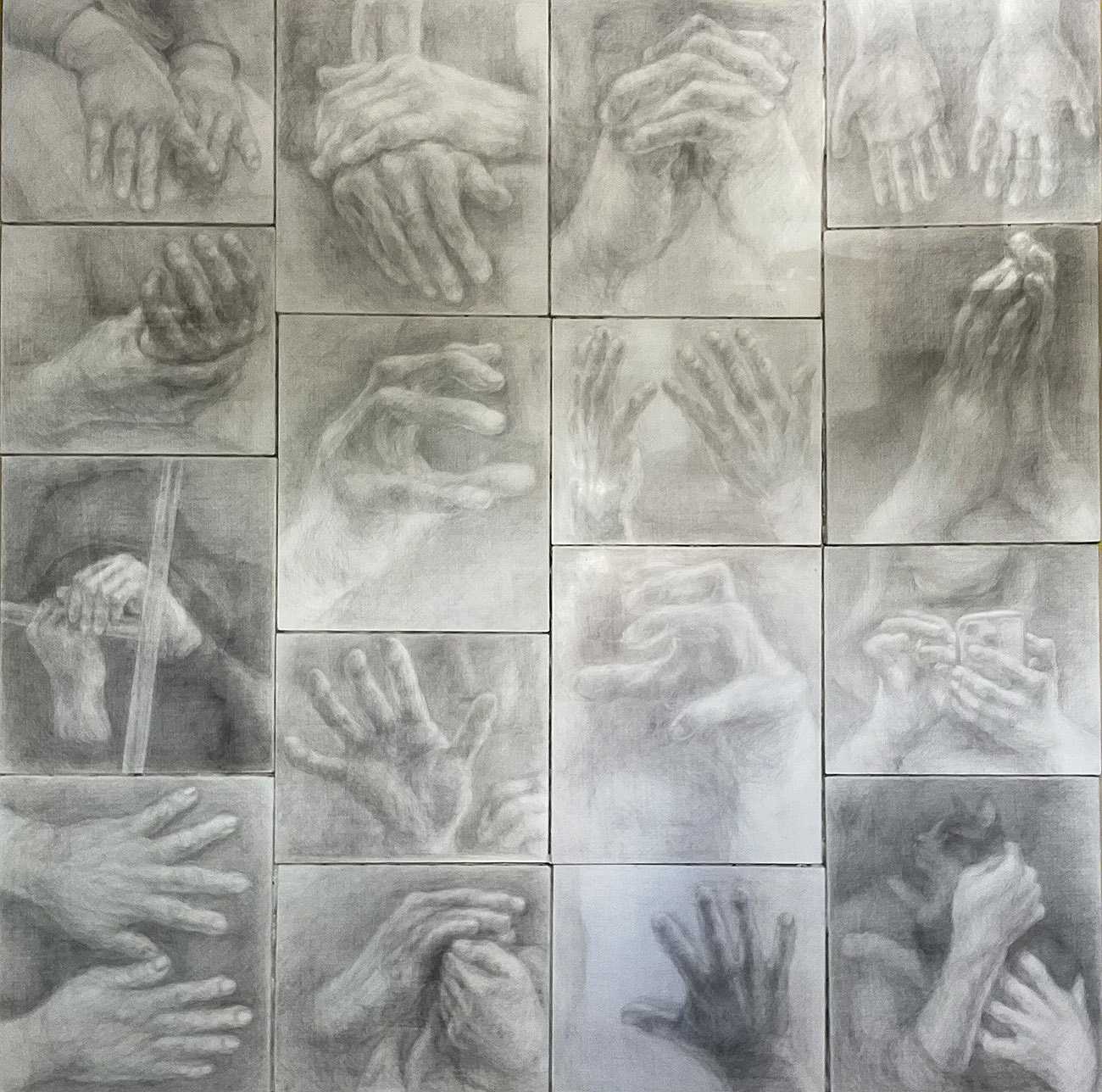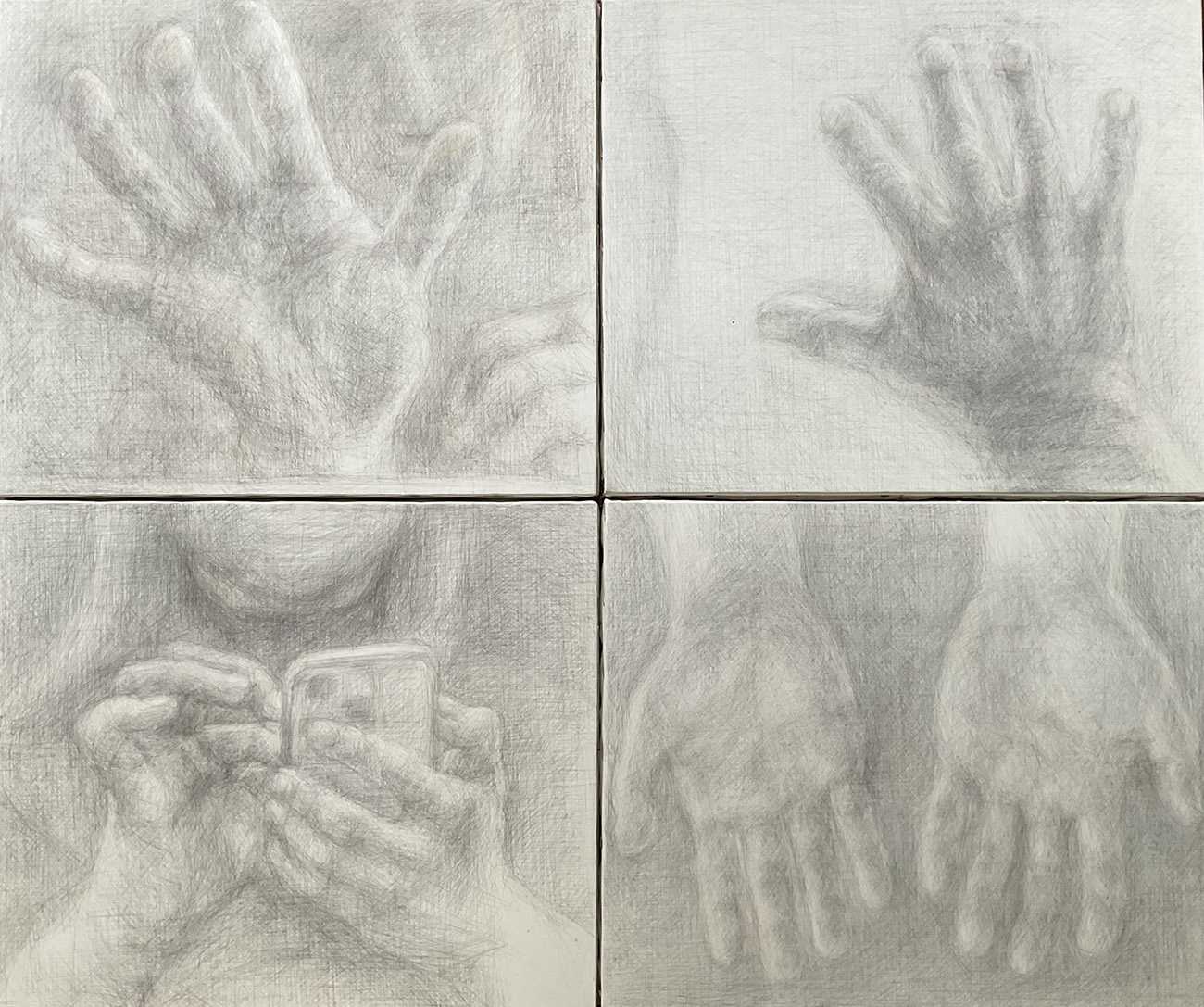 何かの存在を描くことに拠って空間を表現できると考え、本制作では人の手をモチーフとして選んだ。