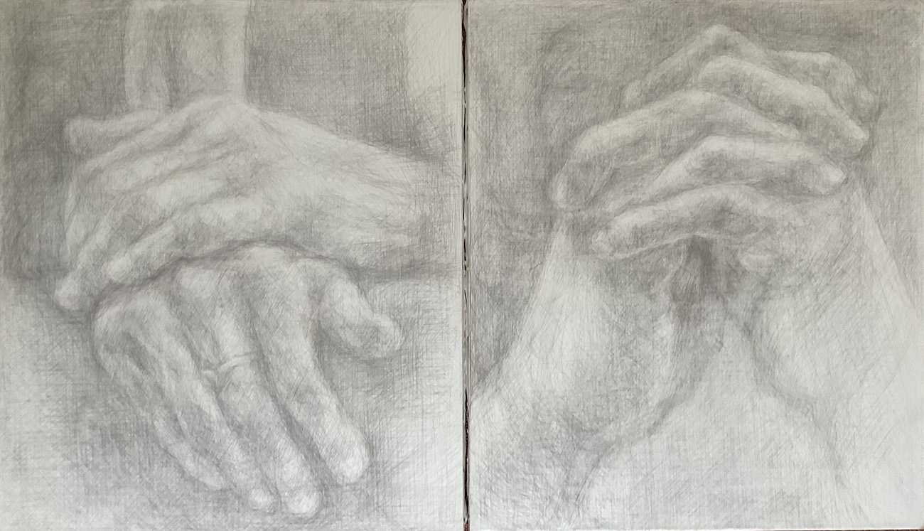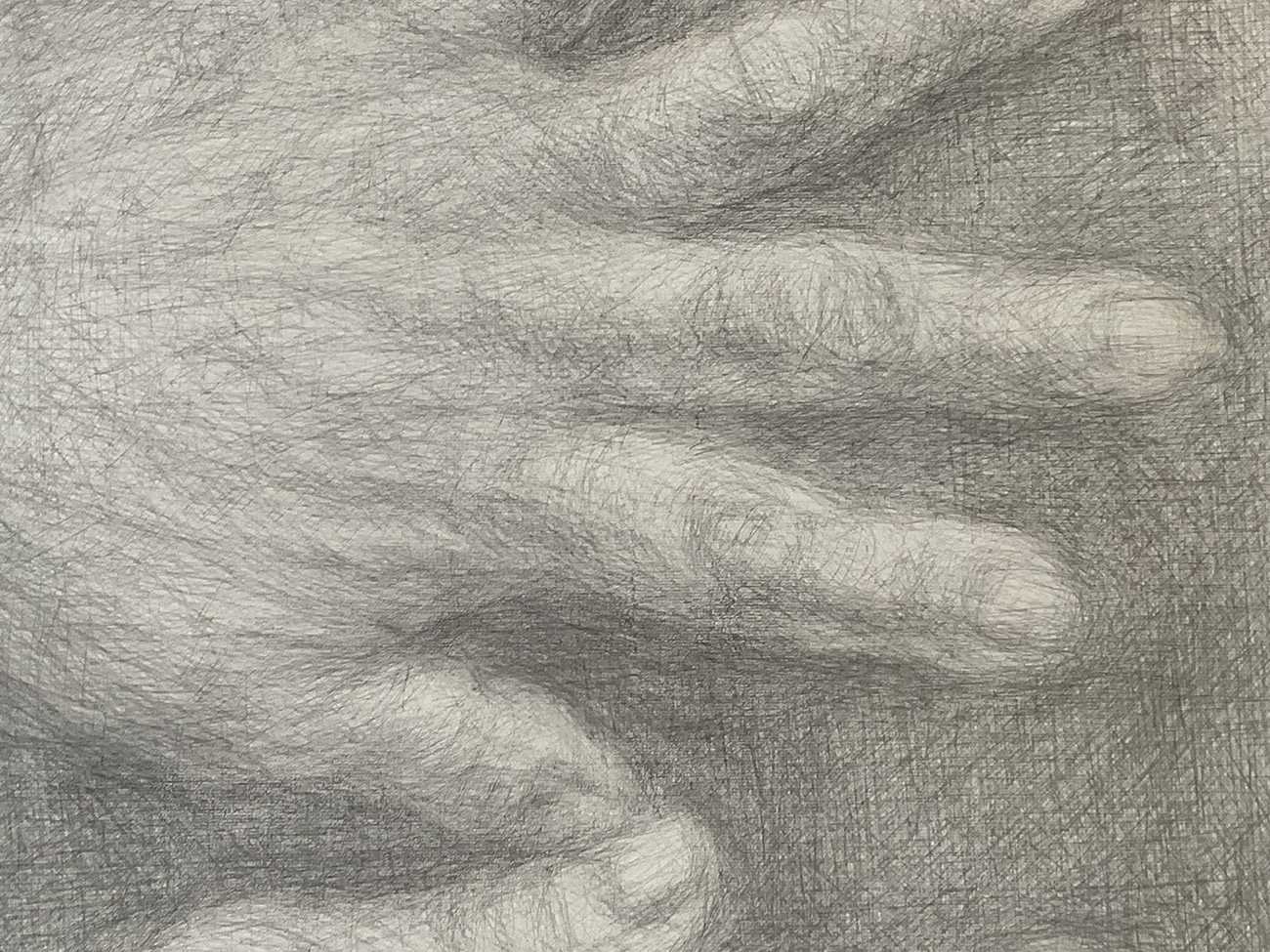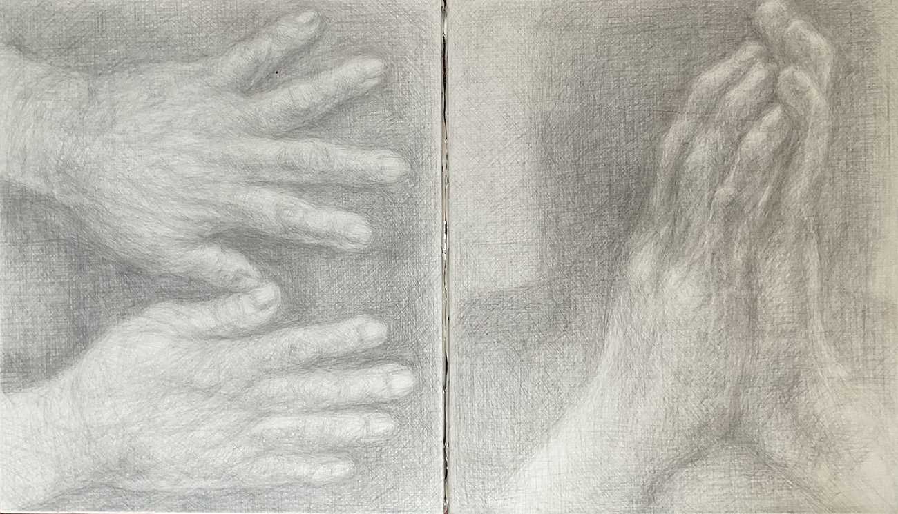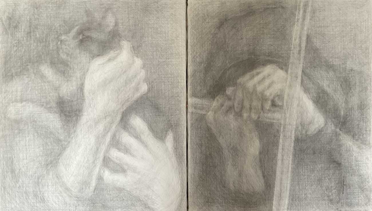 何かの存在を描くことに拠って空間を表現できると考え、本制作では人の手をモチーフとして選んだ。