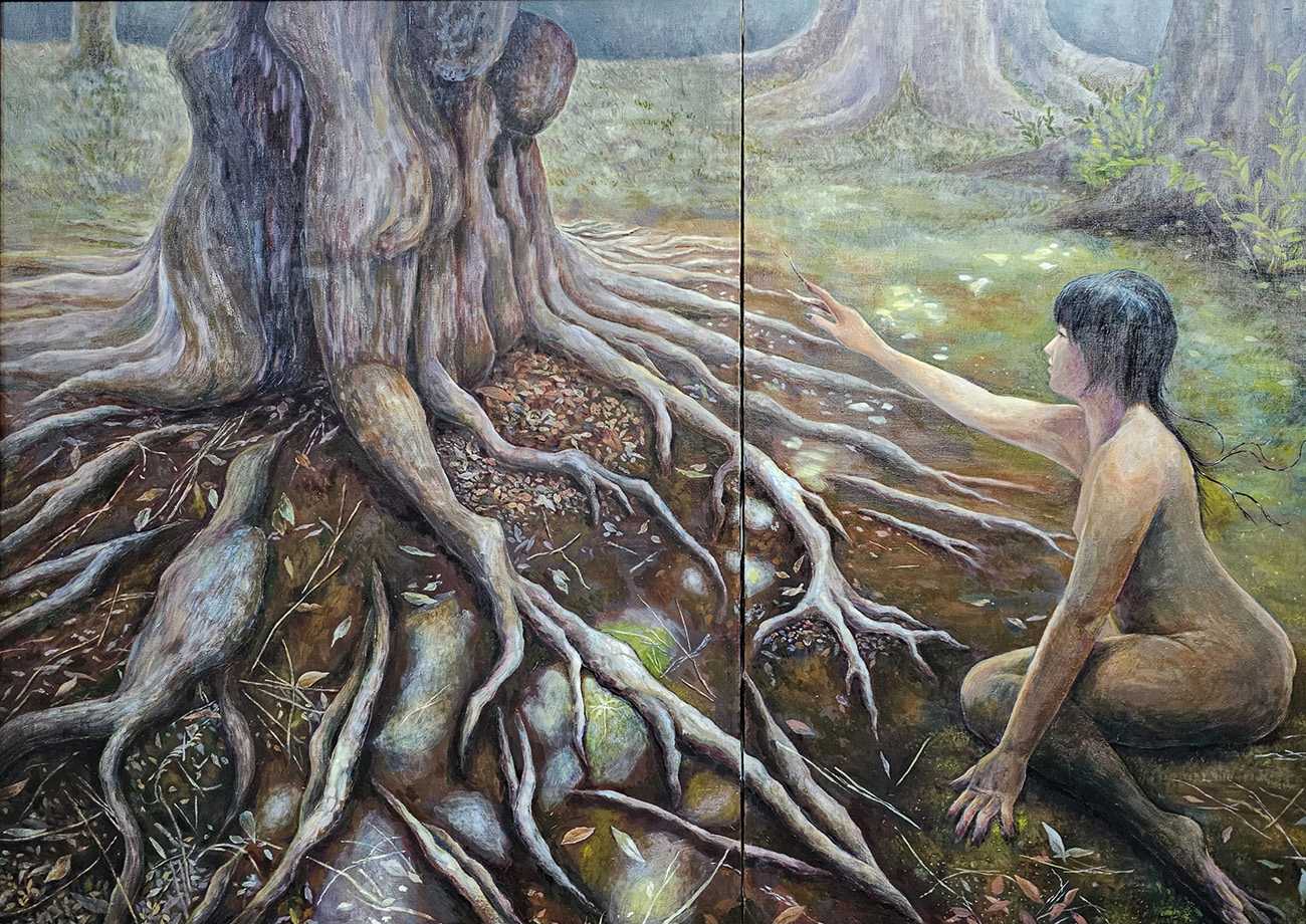 私は、人は自然の中で生きており、人間も自然の中の一部であると感じている。そして、人の感情を自然の中で、どのように表現していくかを考えこの修了制作を作成した。私自身は、木や根っ子の中に人の感情の機微をみており、今回、一人の若い女性が人から自然(木)なっていくことを表現した。その中に生への渇望と要求、そして、自然になることへの希望を表現している。