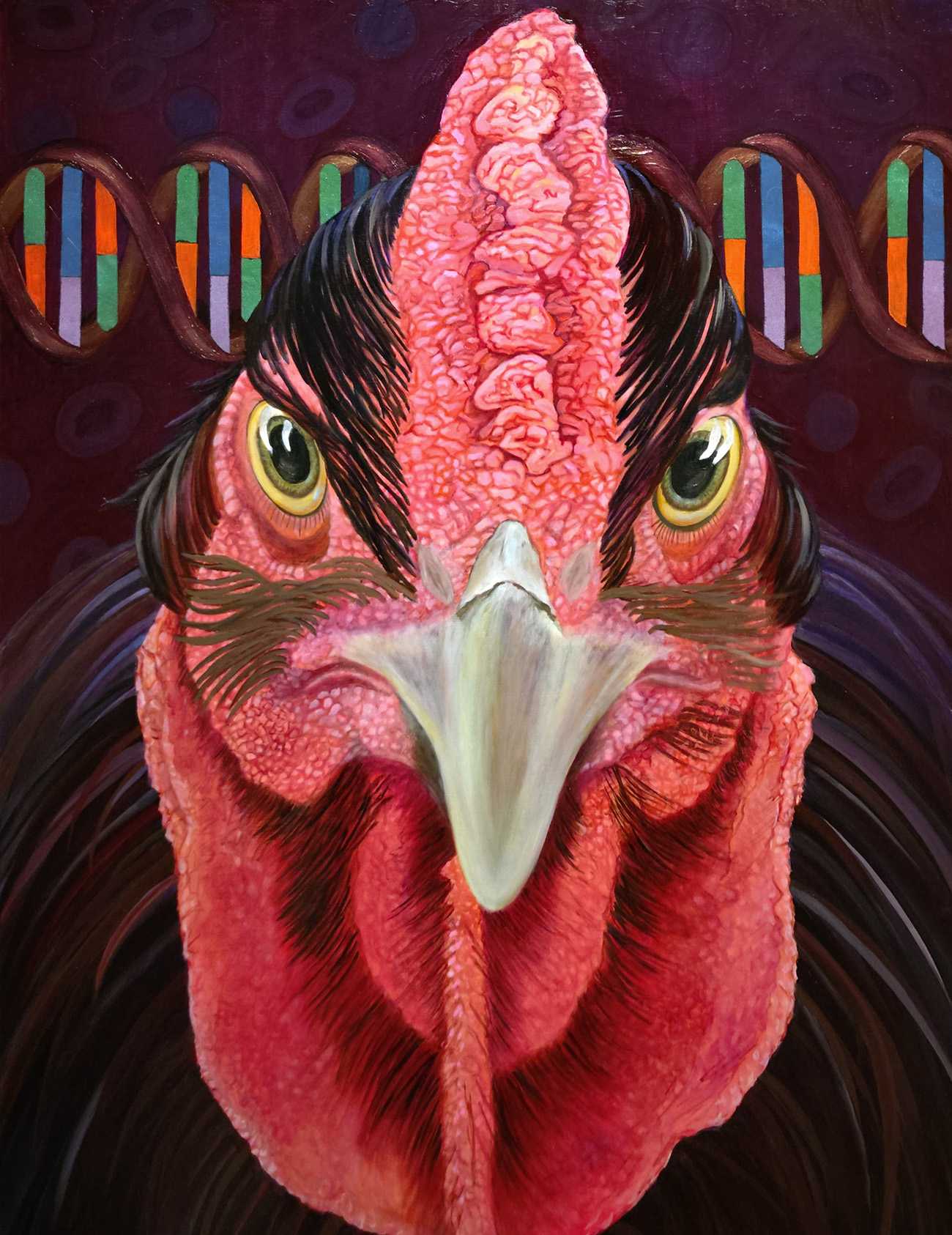 天然記念物である薩摩鶏の「総黒」という品種の鶏の羽根色は、すべてが黒色ですが、光の干渉により、見る角度によって赤や紫、青や緑に色が変化してとても美しい。画像で青や緑は写っても、赤味を帯びた黒など目視でなければ判別できない色があります。その美しさを、油彩に限らずアクリルや構造色塗料など現代の画材を用いて表現したくなり、この絵を描きました。また、薩摩鶏を子どものように大切に育てている人の想いや境遇を、松の形状で表現しています。